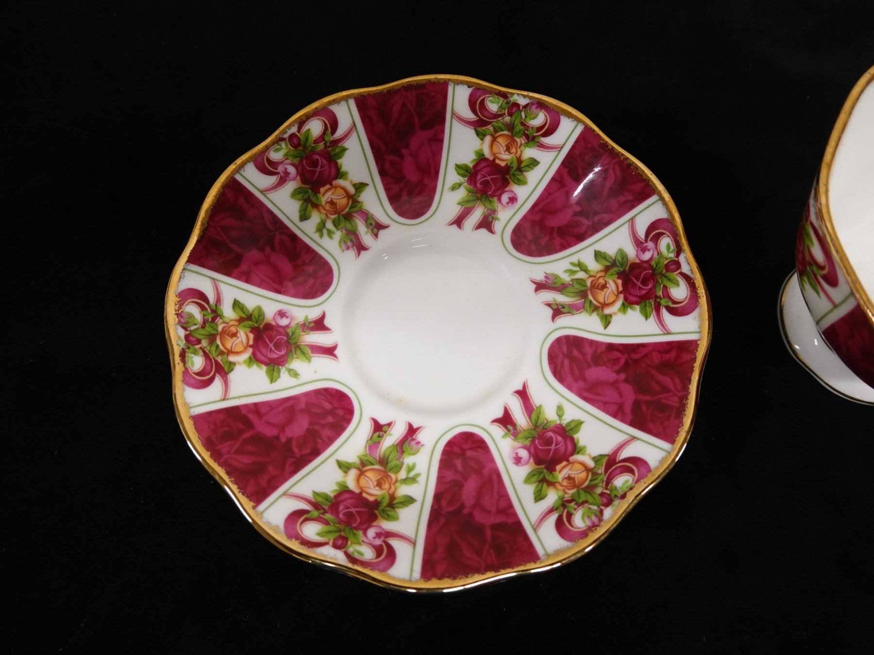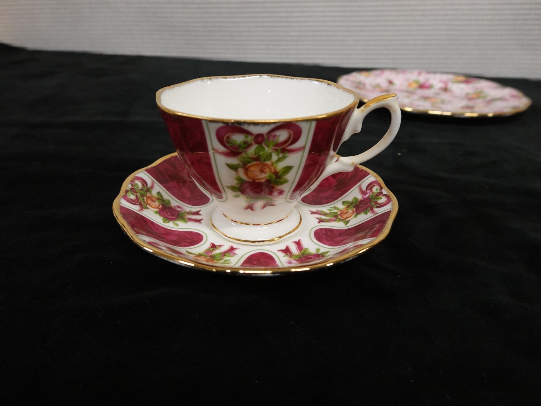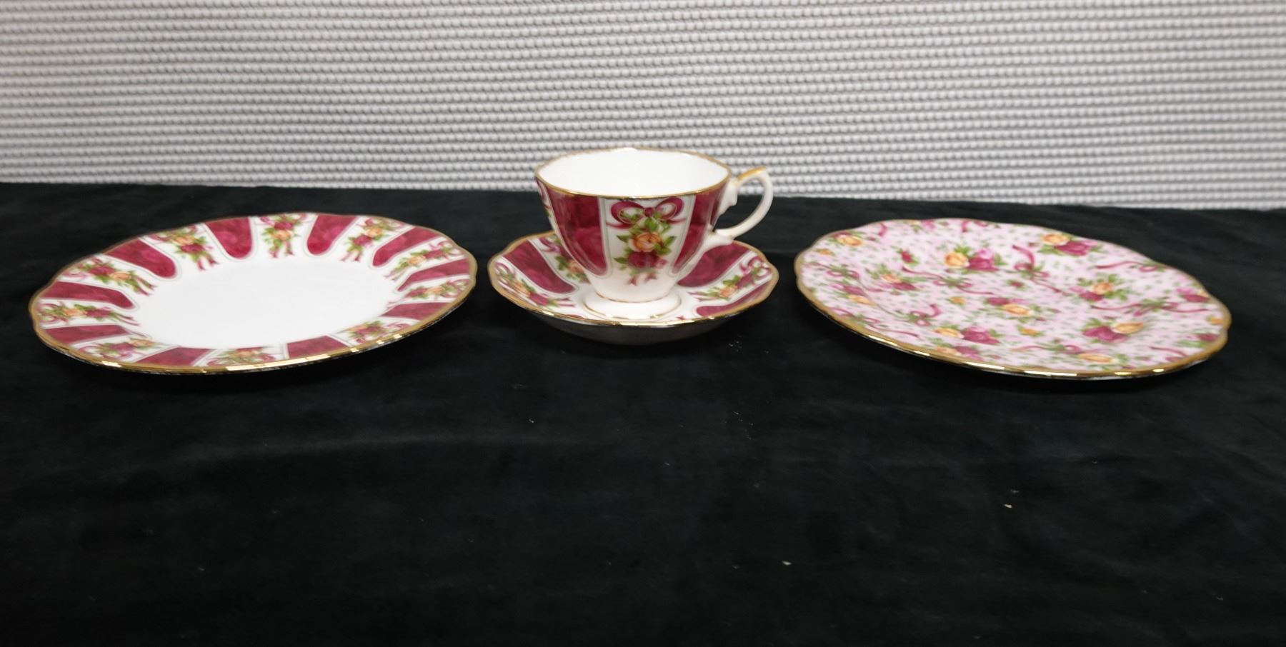 Qty 3 Royal Albert Bone China Dishes: Ruby Damask Plate, Cup & Saucer, Pink Chintz Plate, Misc Size
