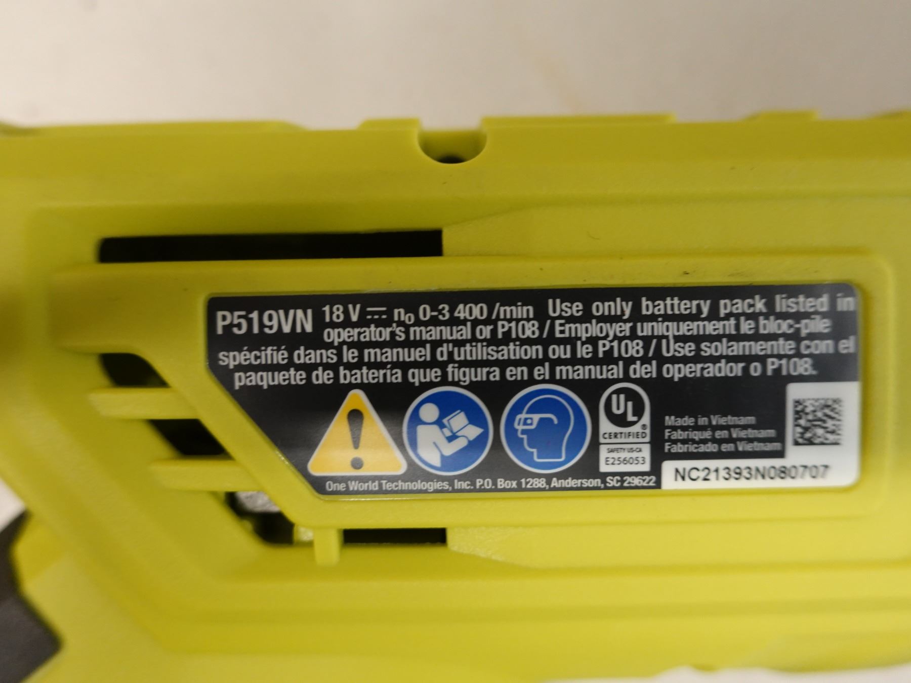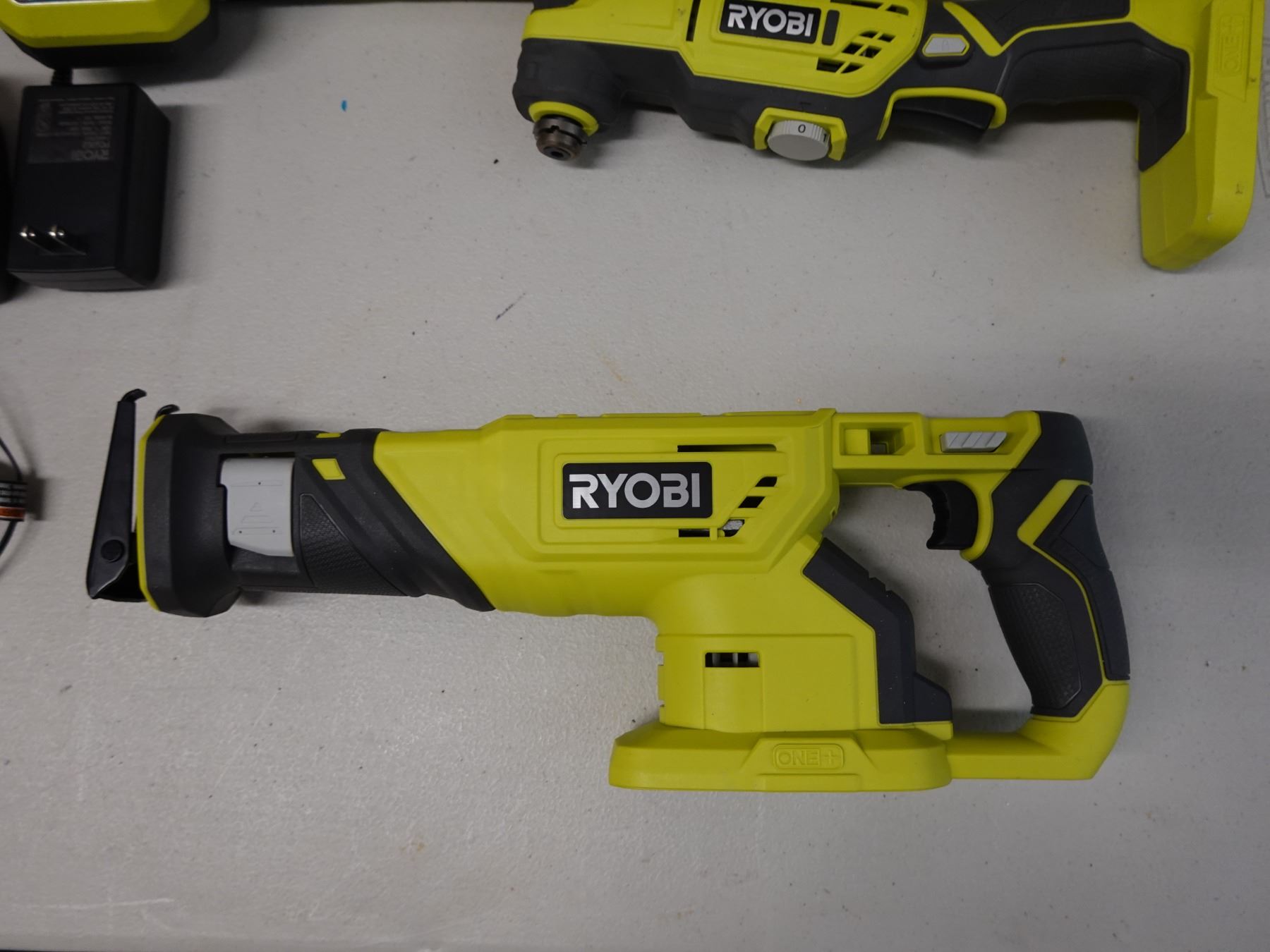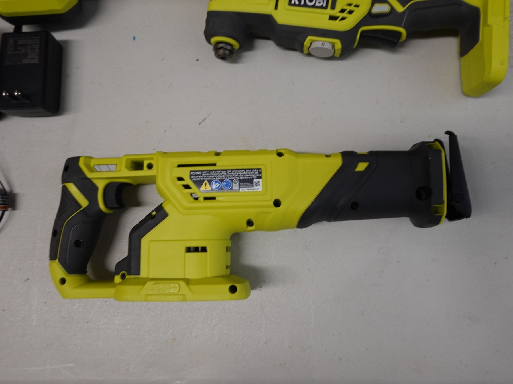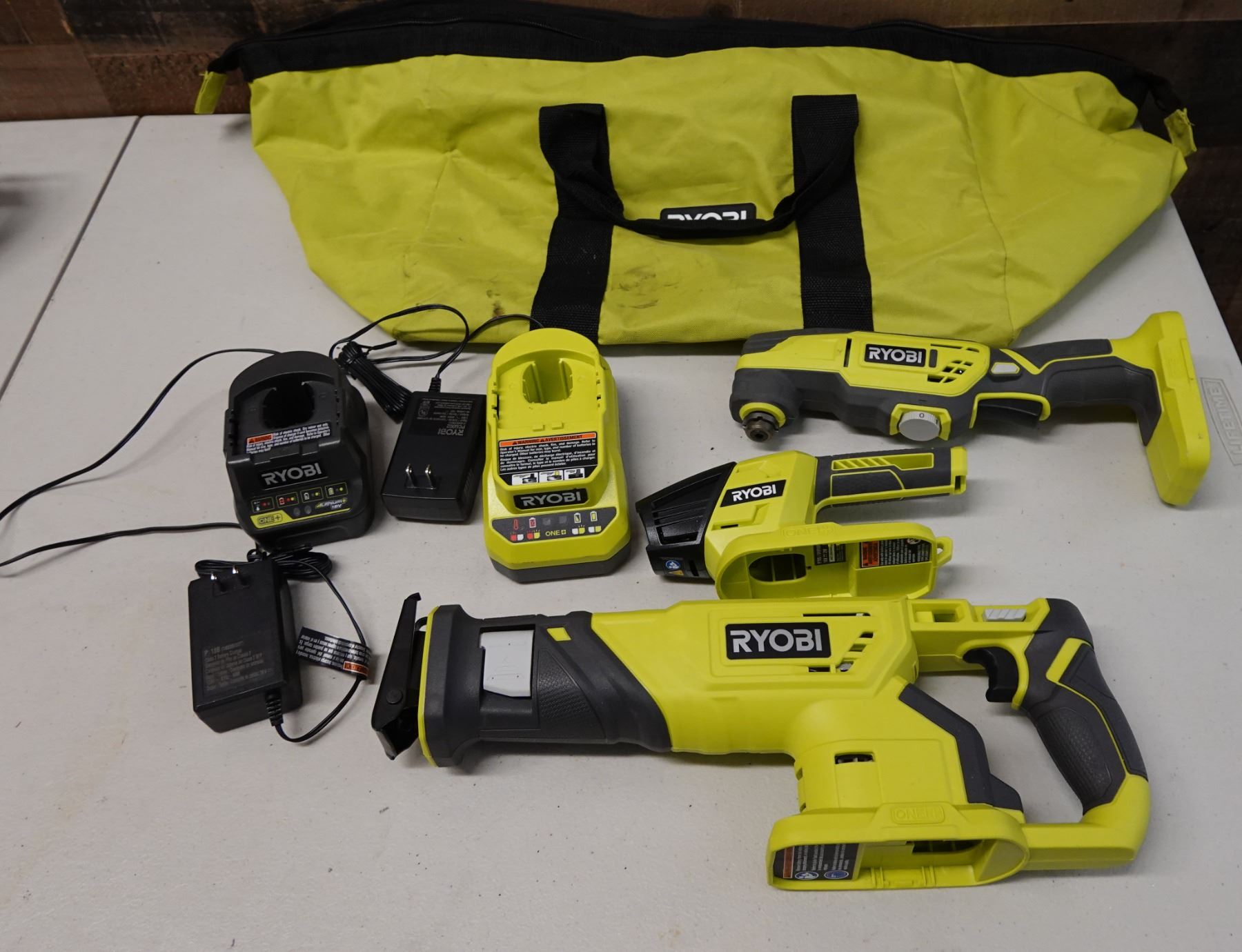 Qty 3 Ryobi Power Tools, Case & 2 Chargers: P519VN Reciprocating Saw, P343 Multi-Tool & P705 Light