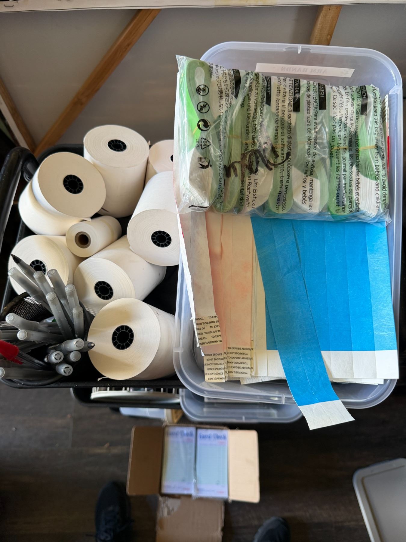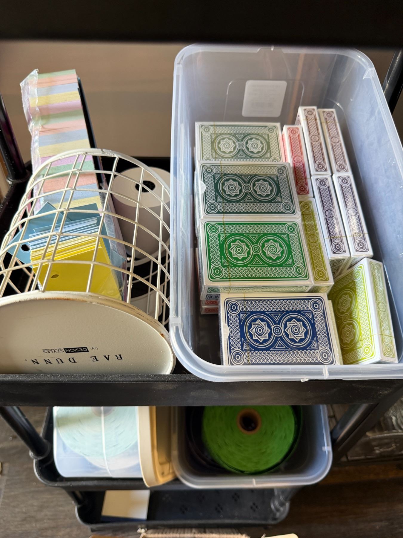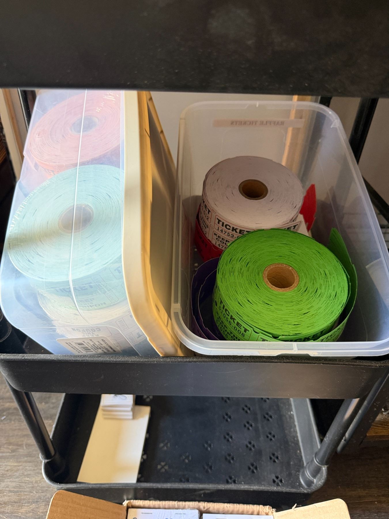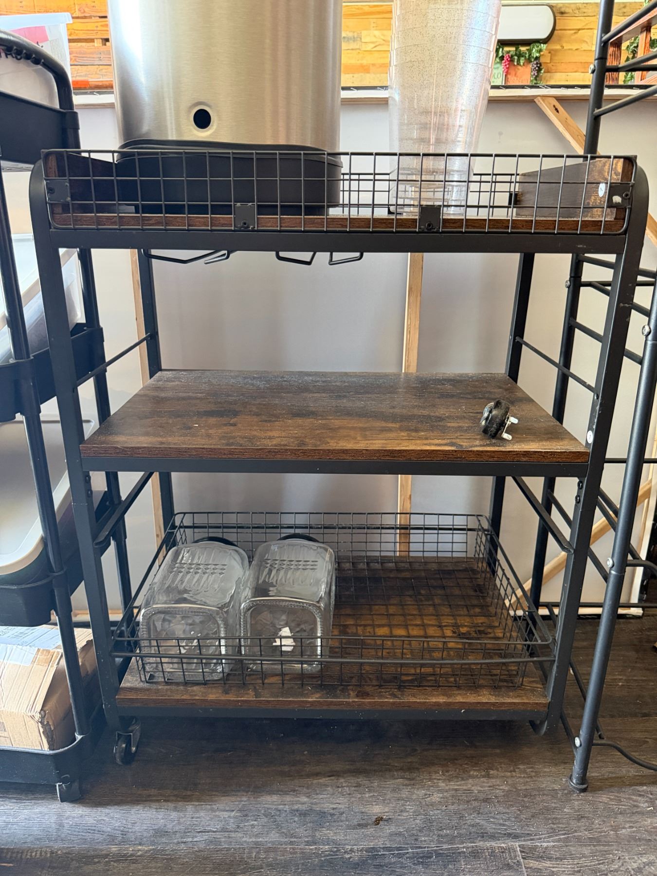 Qty 3 Shelving Units Misc Sizes & Contents: Baskets, Anvil Bucket Fermenter, Cards, Paper Rolls, etc