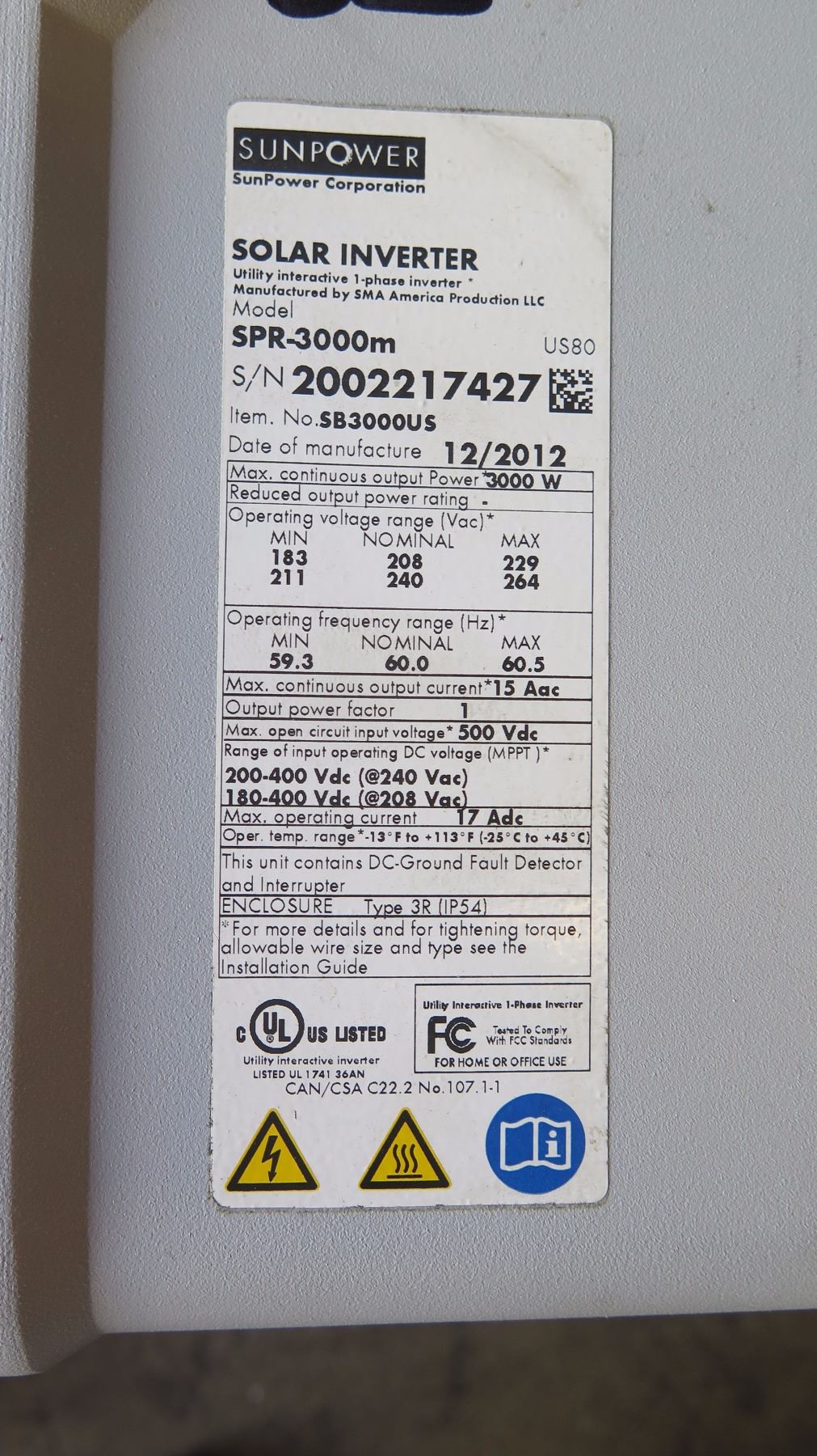 Qty 3 Sunpower SPR 3000M Inverters, Qty 2 Sunpower SPR 4000M Inverters - Previously Installed, Working