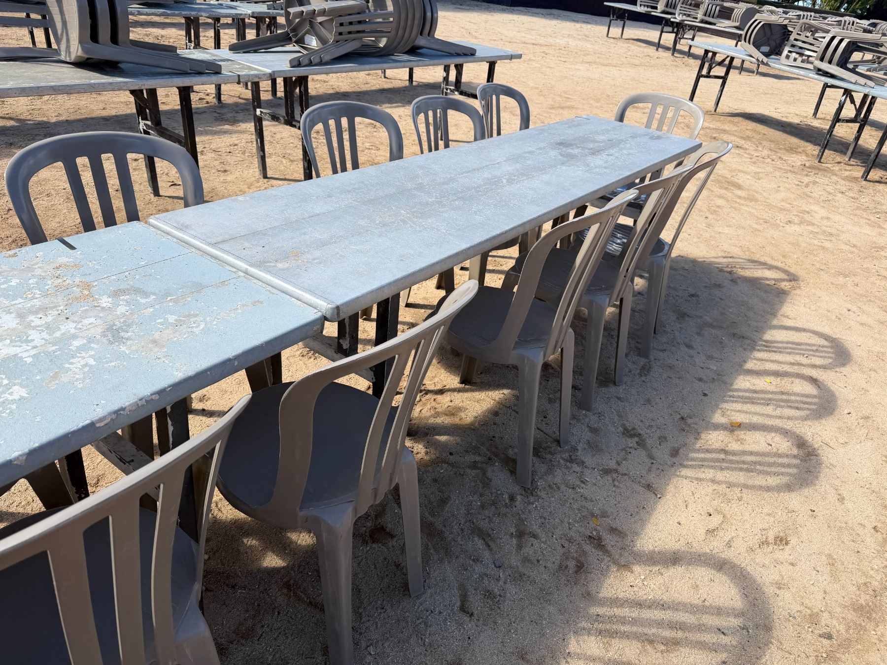 Qty 3 Tables 95  x 24  x 29 H & 25 Plastic Stacking Chairs 16  Dia, 36 H