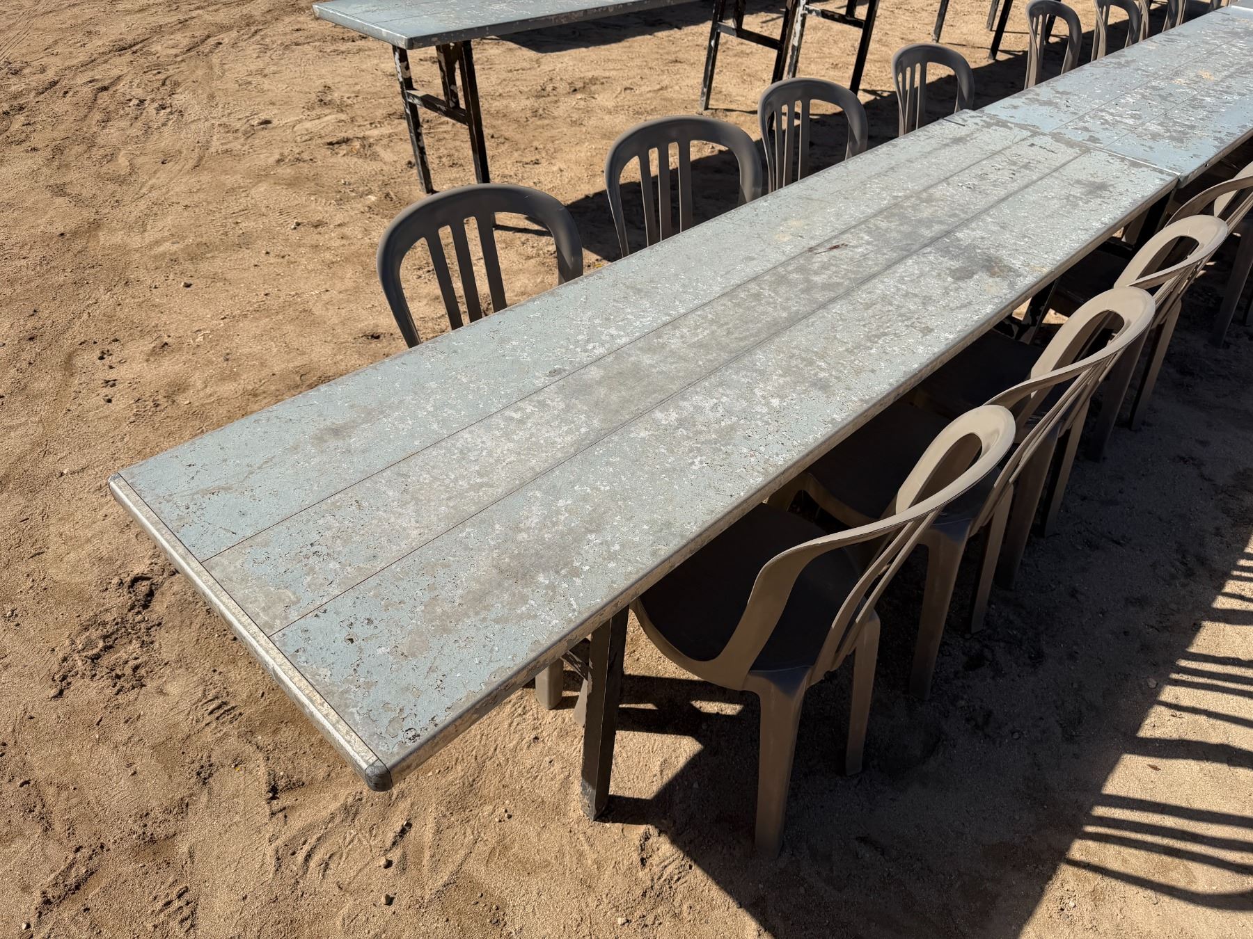 Qty 3 Tables 95" x 24" x 29"H & 25 Plastic Stacking Chairs 16" Dia, 36"H