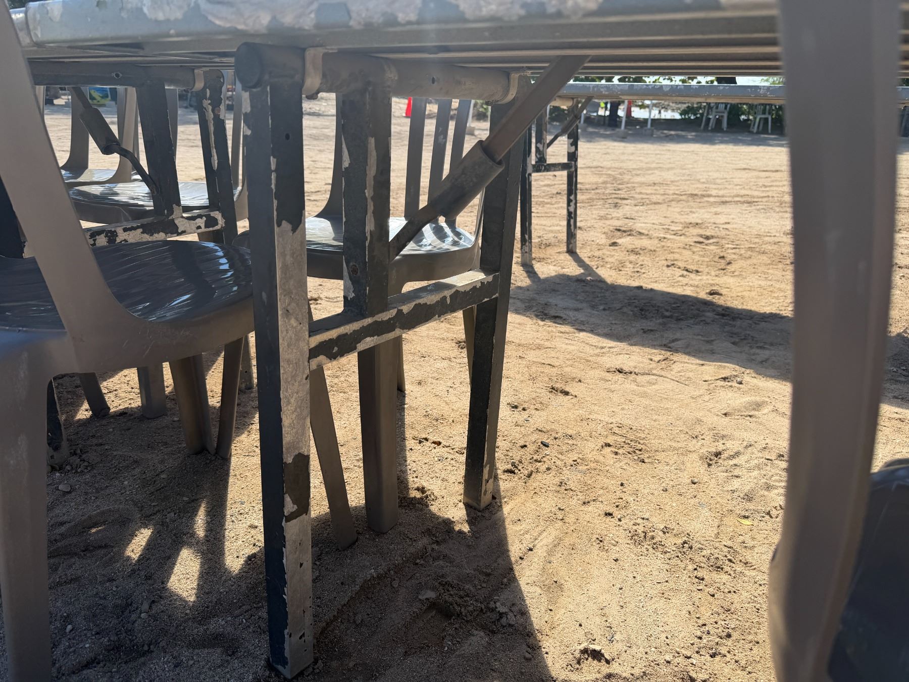 Qty 3 Tables 95  x 24  x 29 H & 25 Plastic Stacking Chairs 16  Dia, 36 H