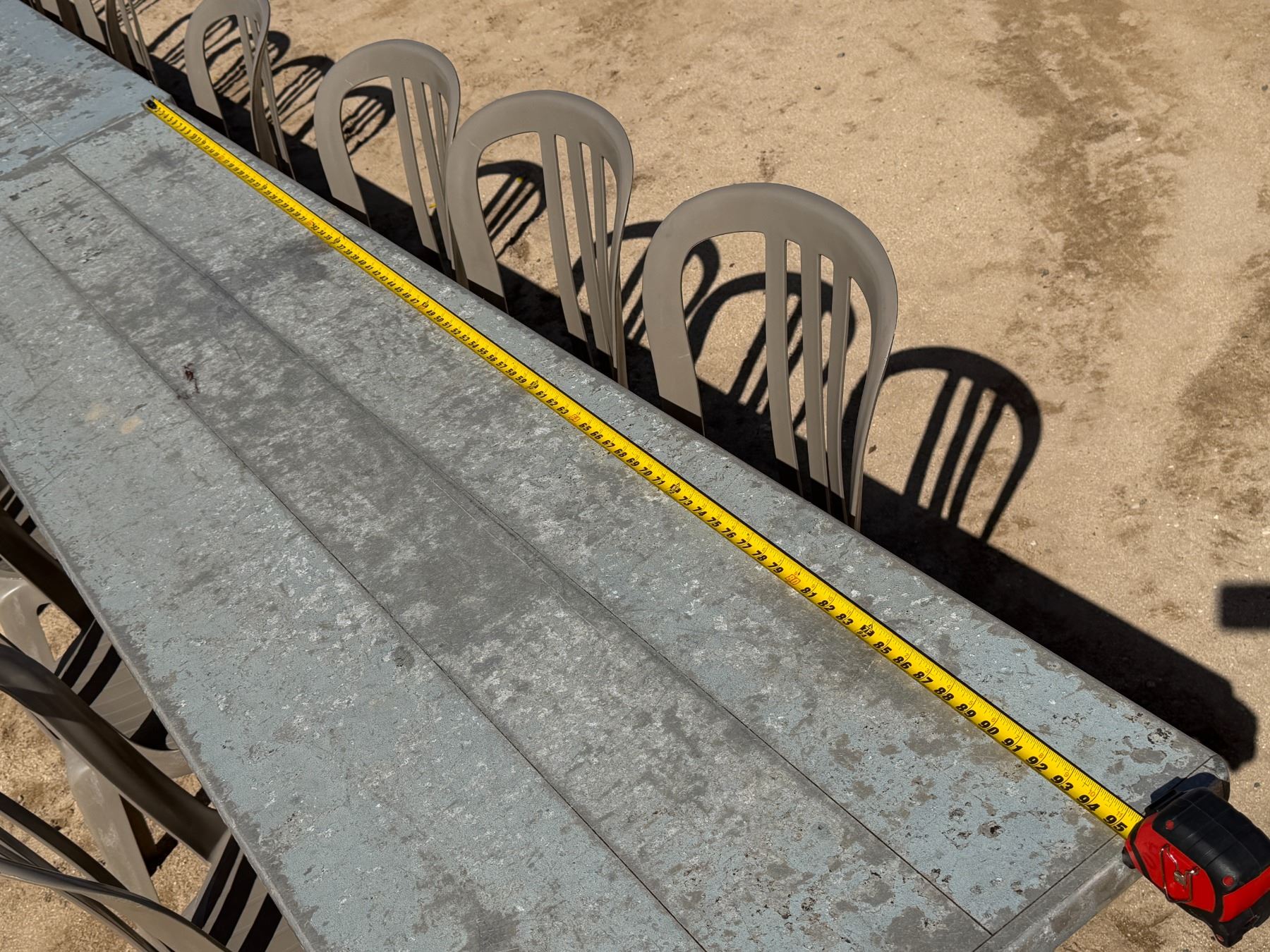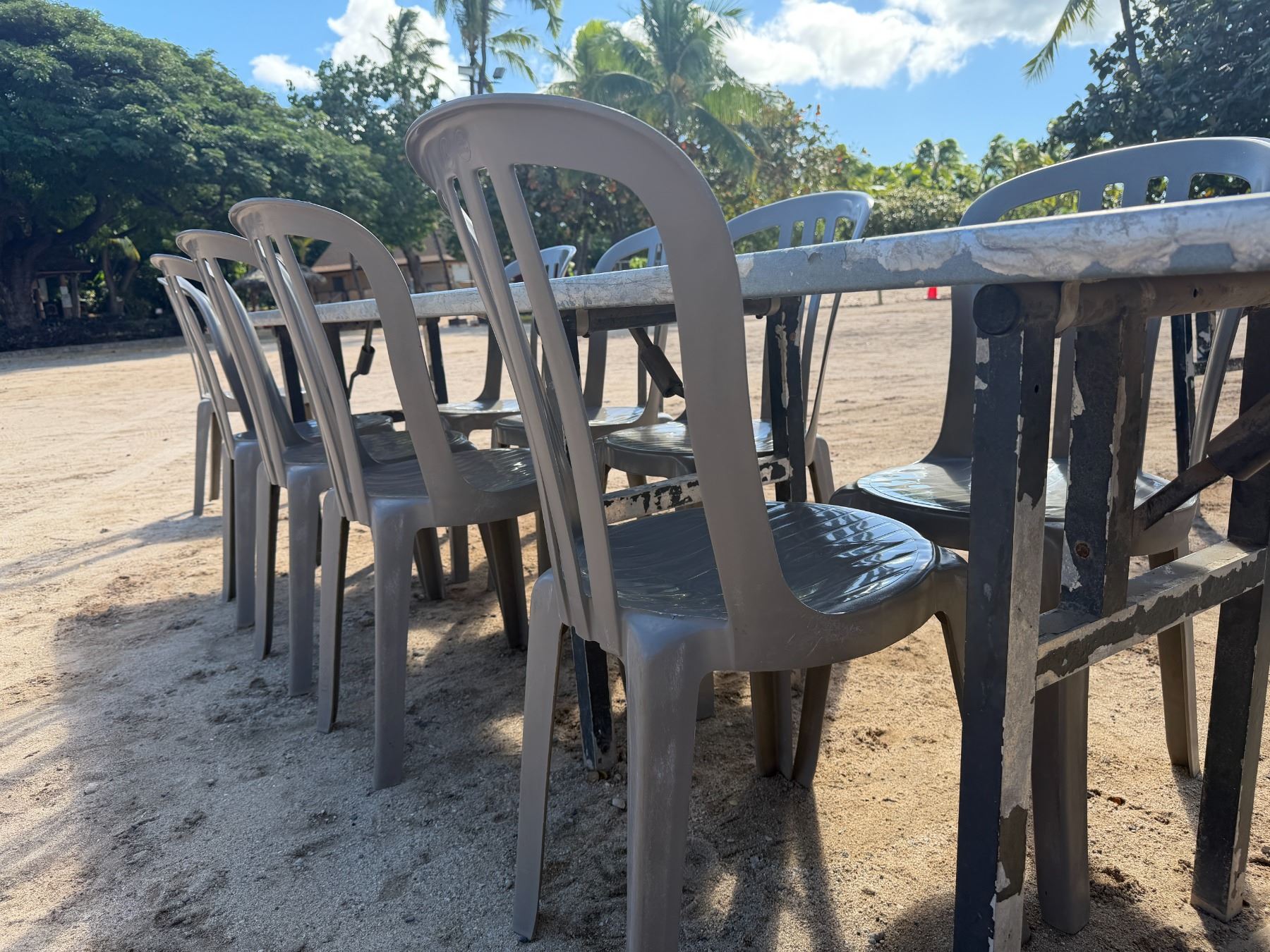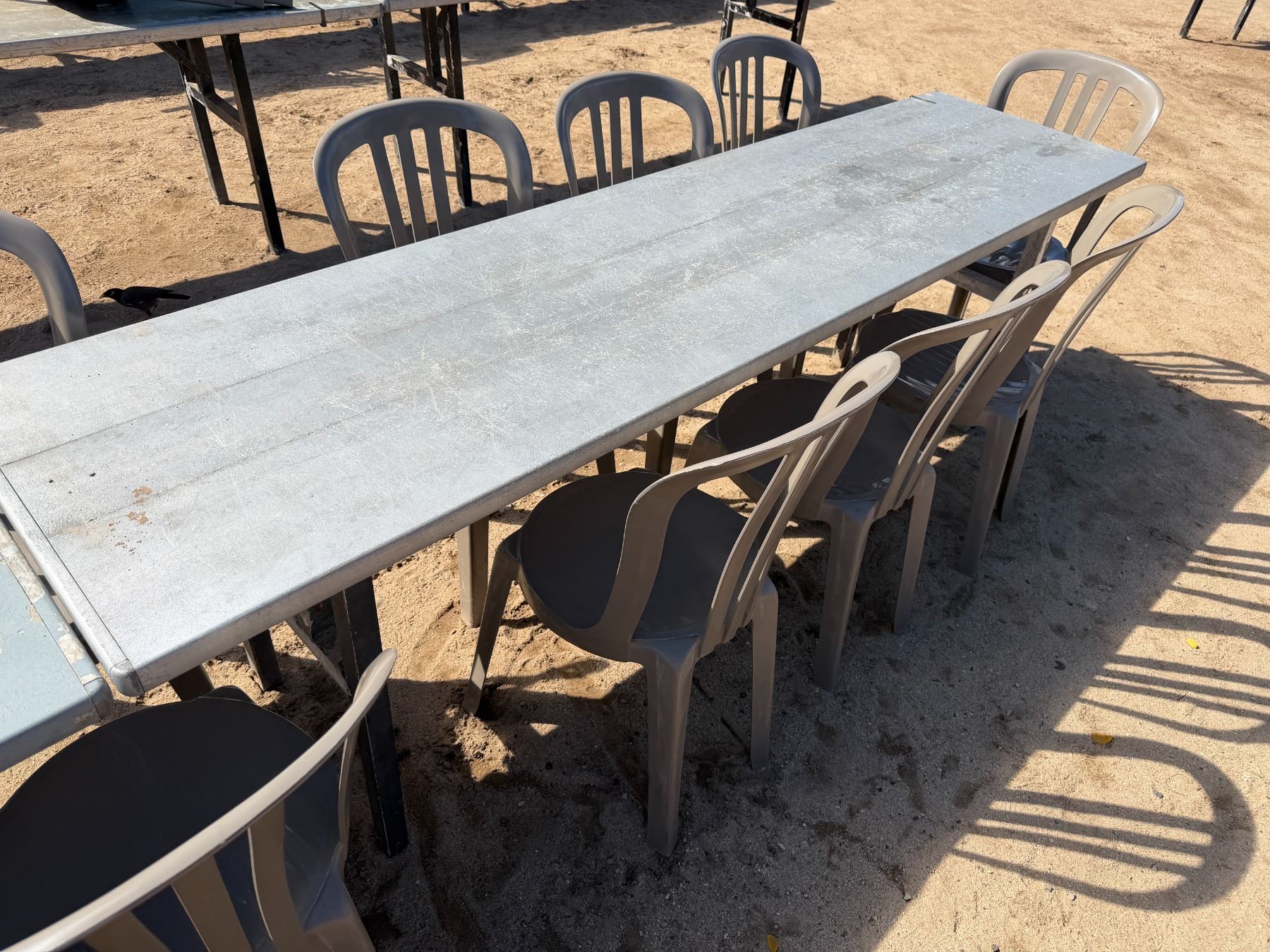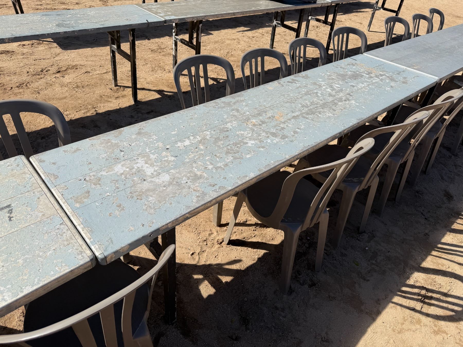 Qty 3 Tables 95" x 24" x 29"H & 25 Plastic Stacking Chairs 16" Dia, 36"H
