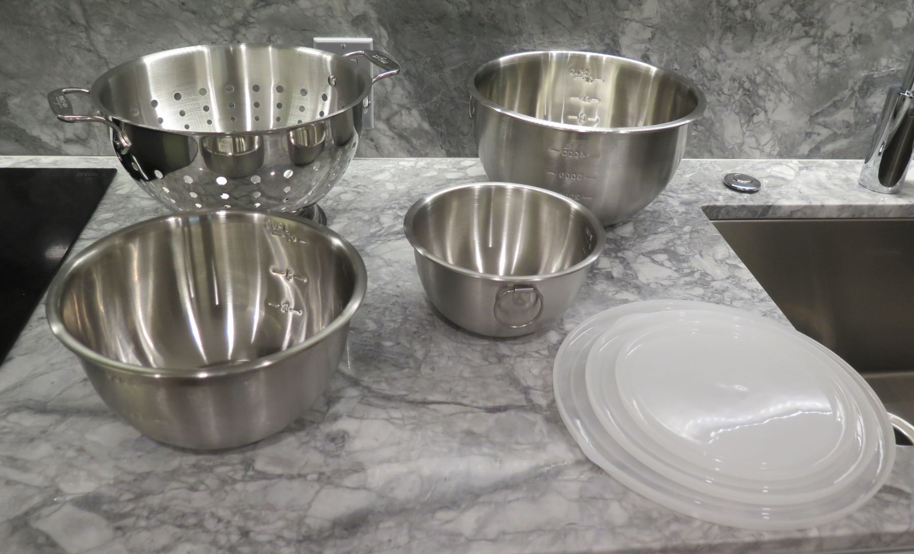 Qty 3 Tovolo Stainless Steel Mixing Bowls, Colander & Plastic Lids