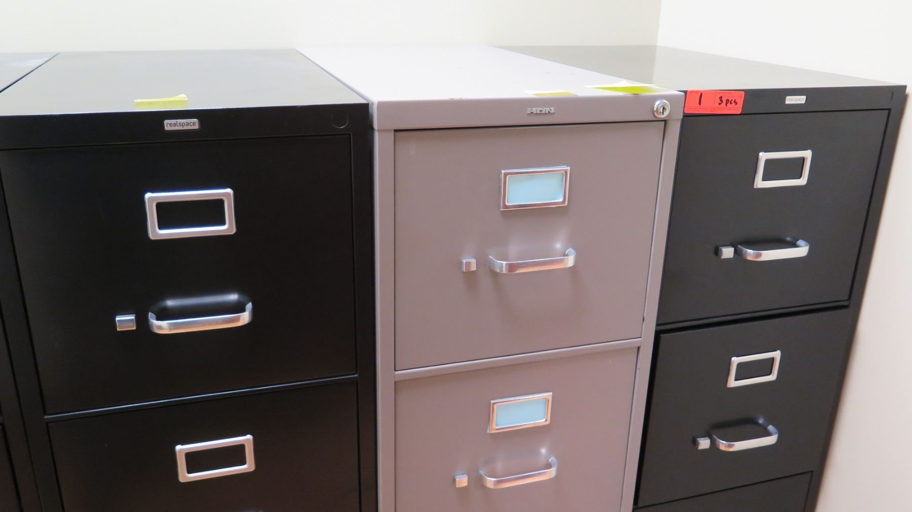 Qty 3 Vertical File Cabinets (HON, Realspace) 15"W x 25"D x 52"H