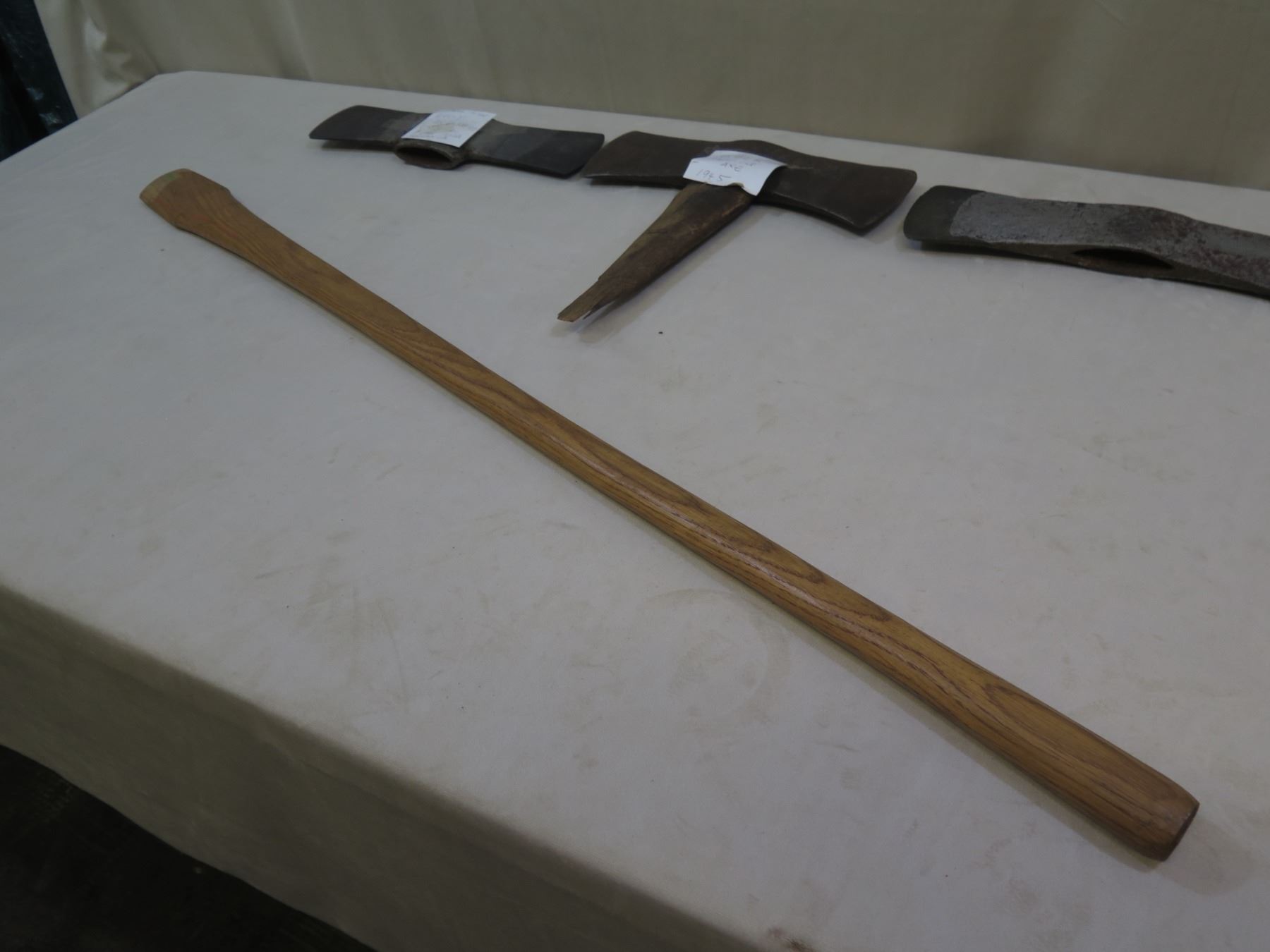 Qty 3 Vintage Axe Bits: Kelly Axe Co., Sager Chemical 1945, etc w/ 1 Handle
