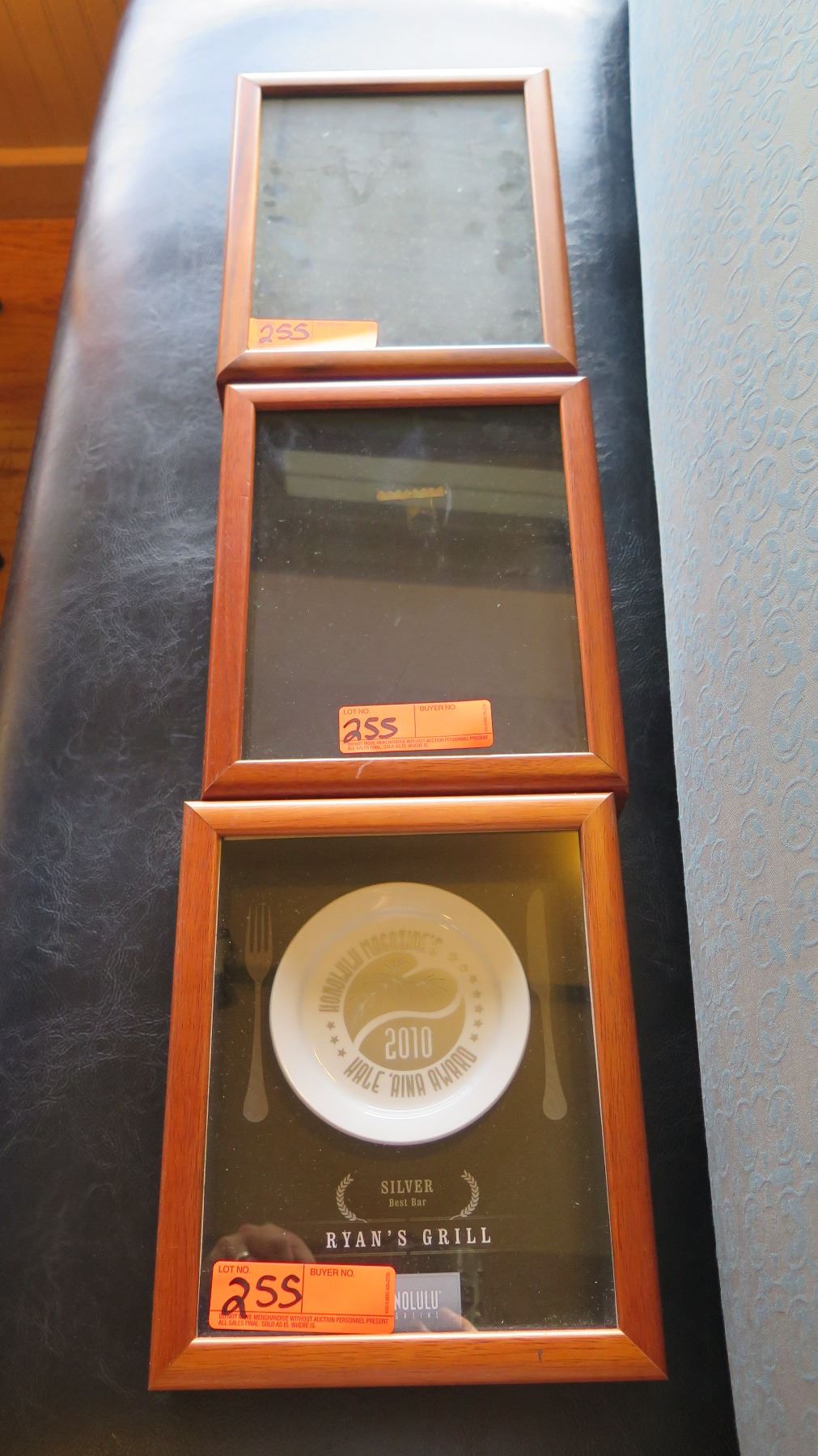 Qty 3 Wood Framed Glass Shadow Boxes (1 has Ryan's Grill Honolulu Mgzn Award), Approx. 9" X 11"