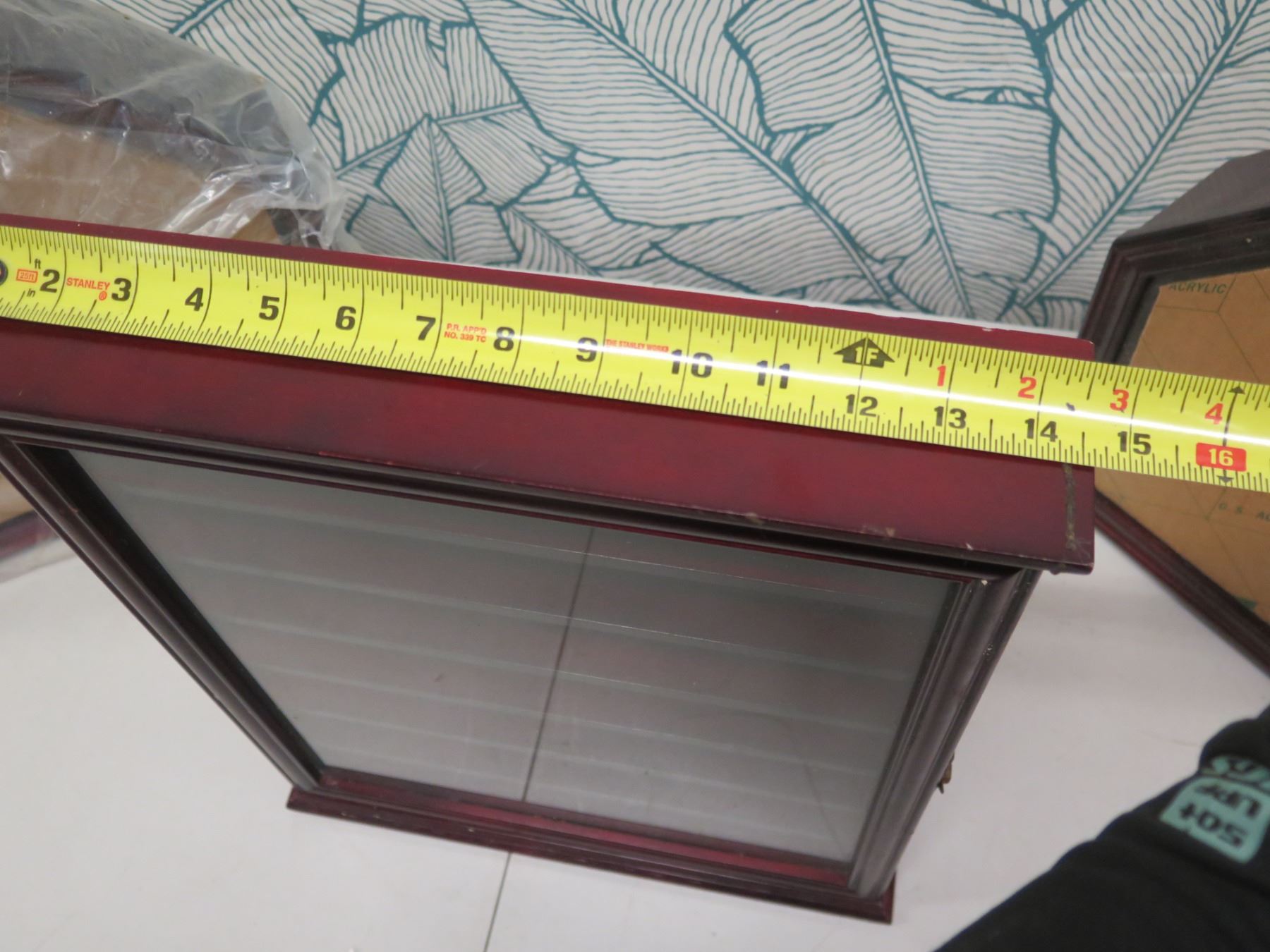 Qty 3 Wooden Display Cases: Square 14"x3"x17"H & 2 Triangle Shaped 19"x4"x19"H