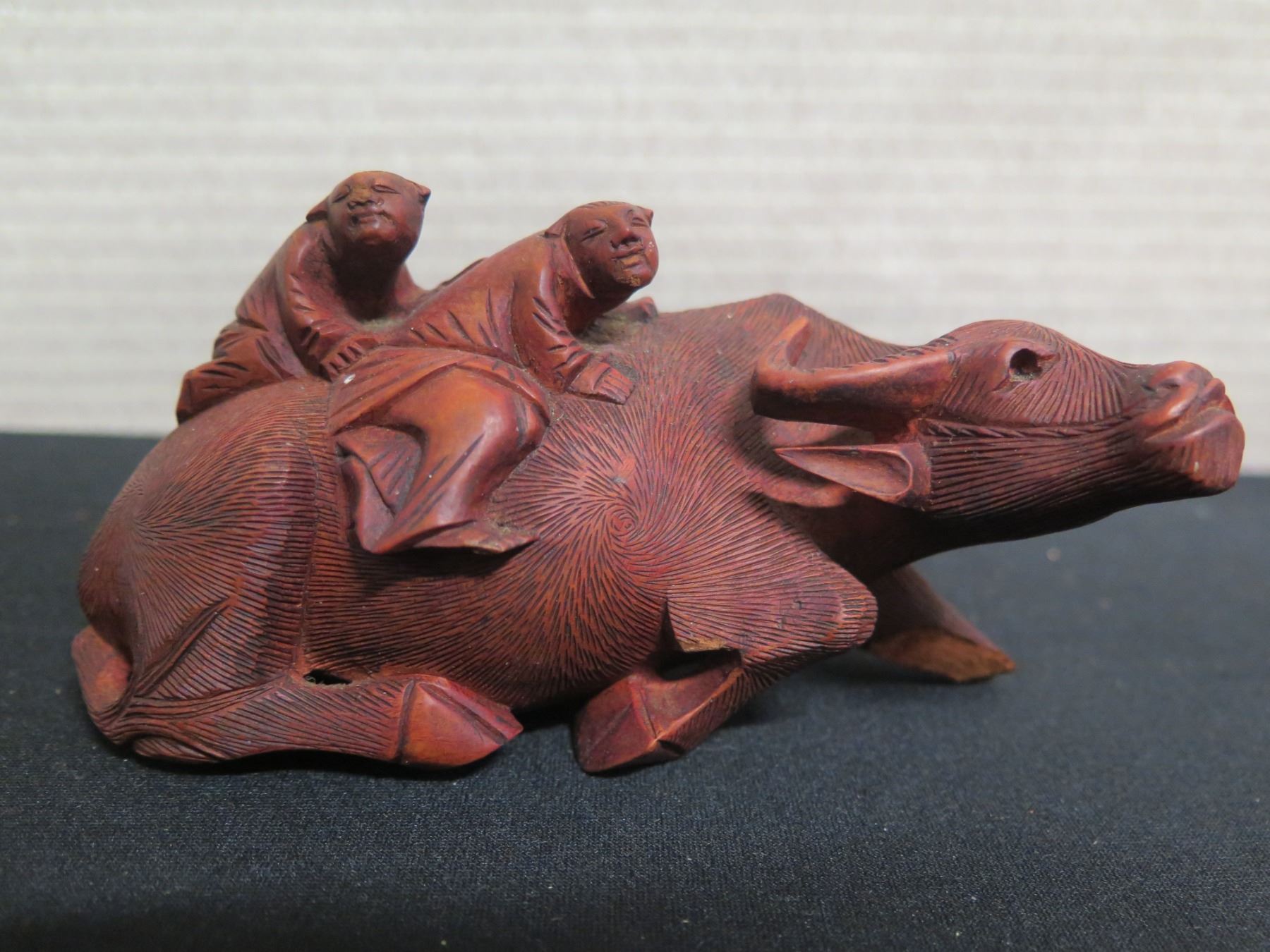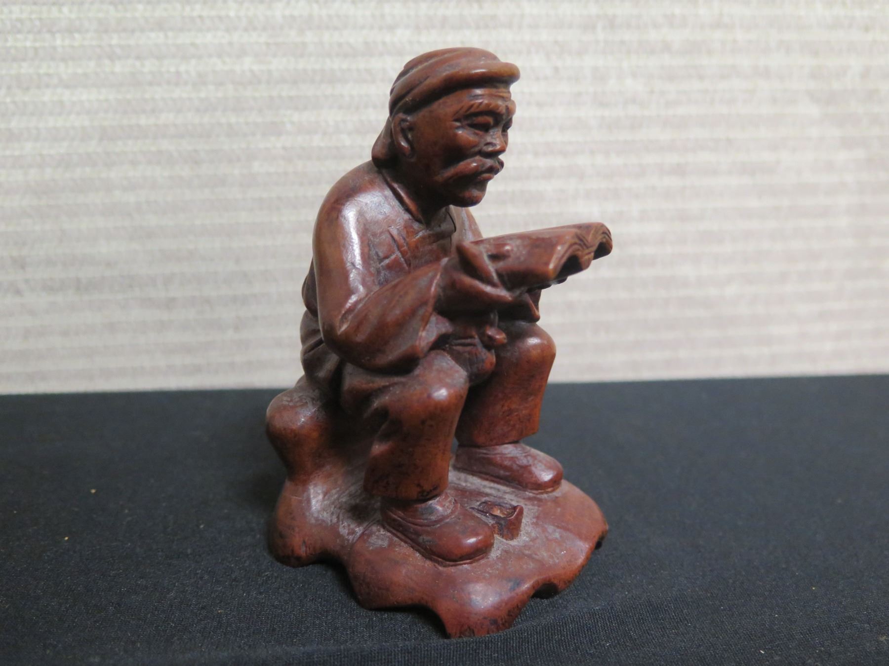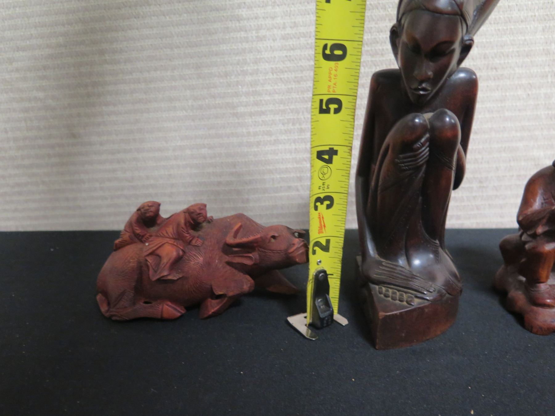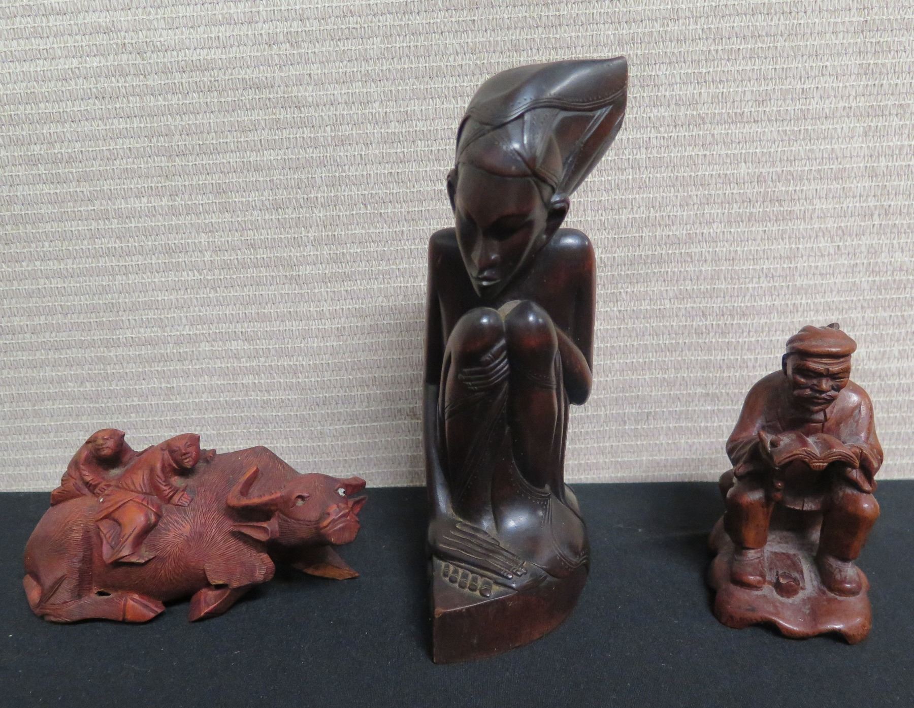 Qty 3 Wooden Statues: Seated Man Reading, Woman & Men on an Ox