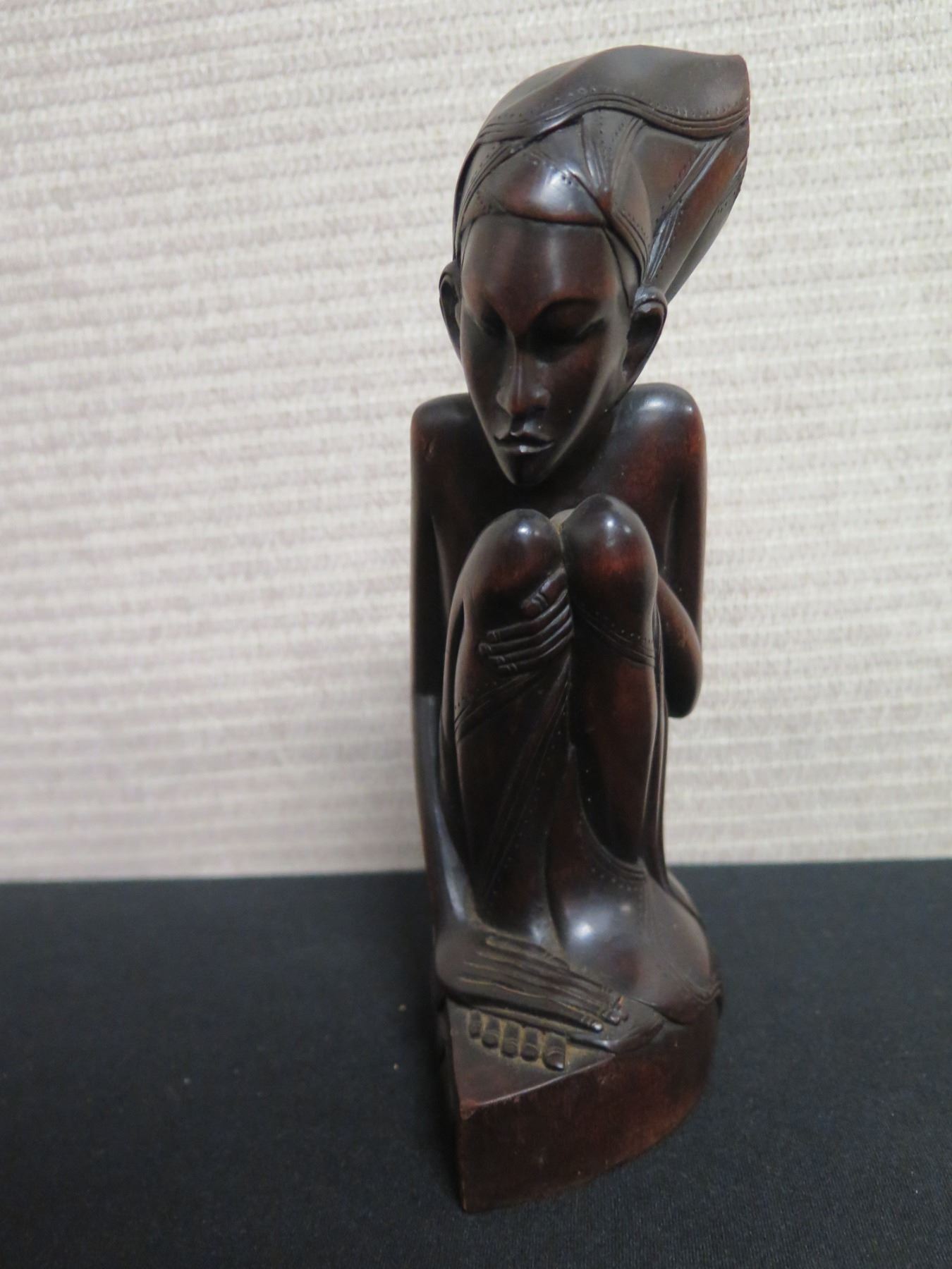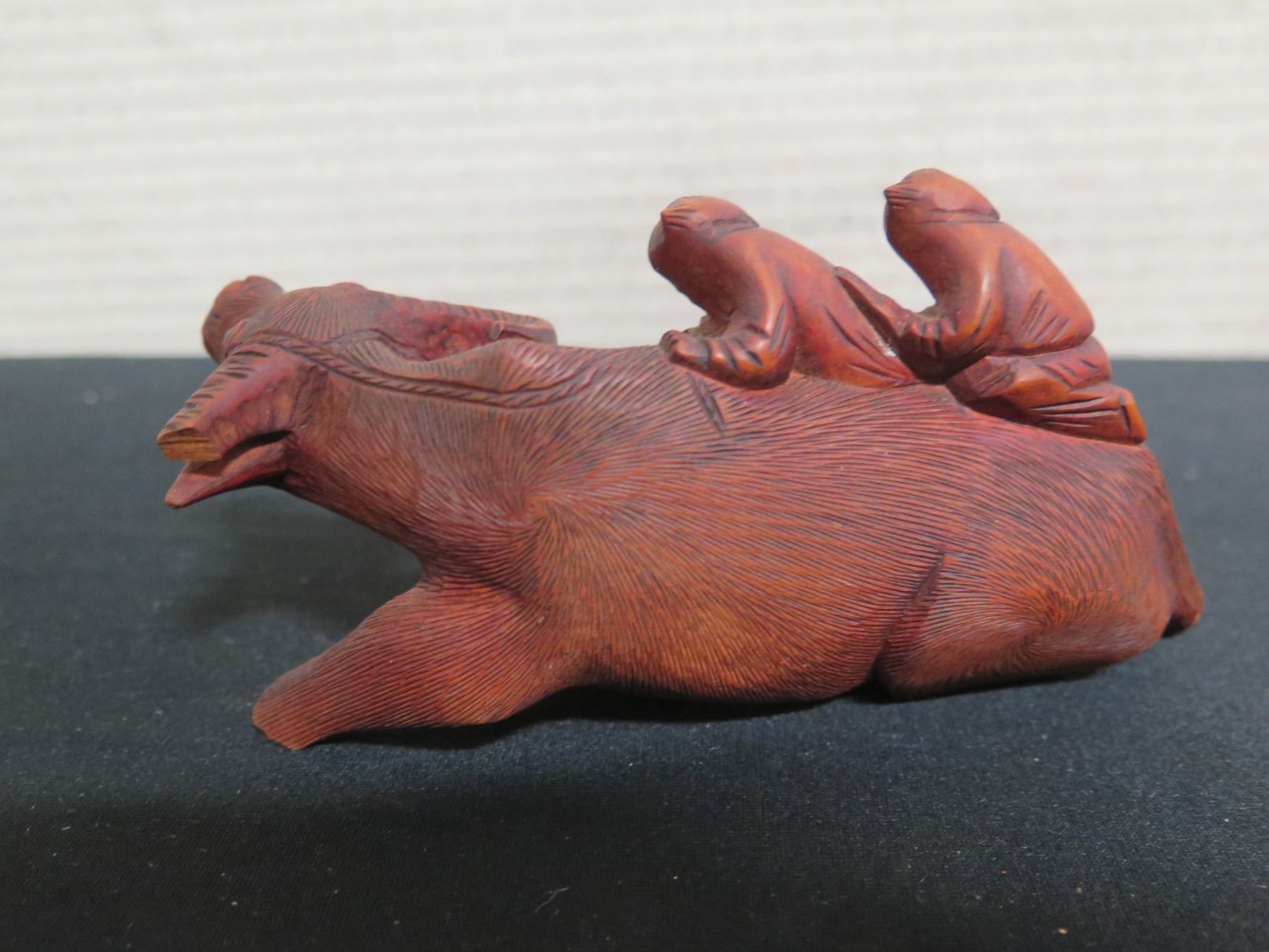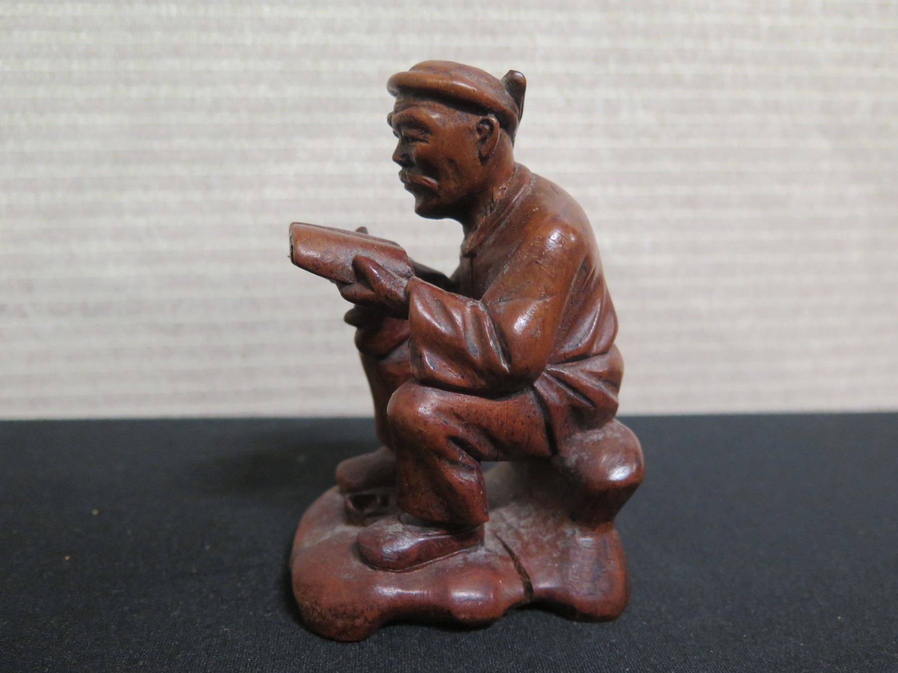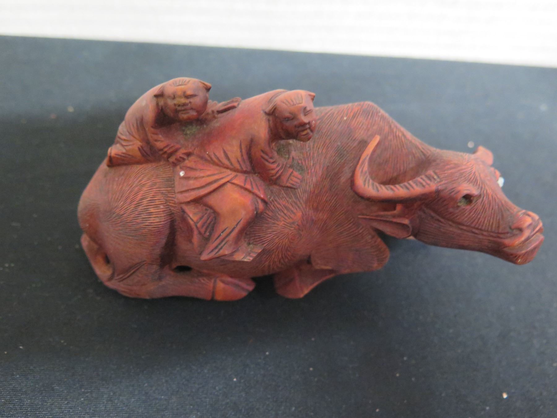 Qty 3 Wooden Statues: Seated Man Reading, Woman & Men on an Ox