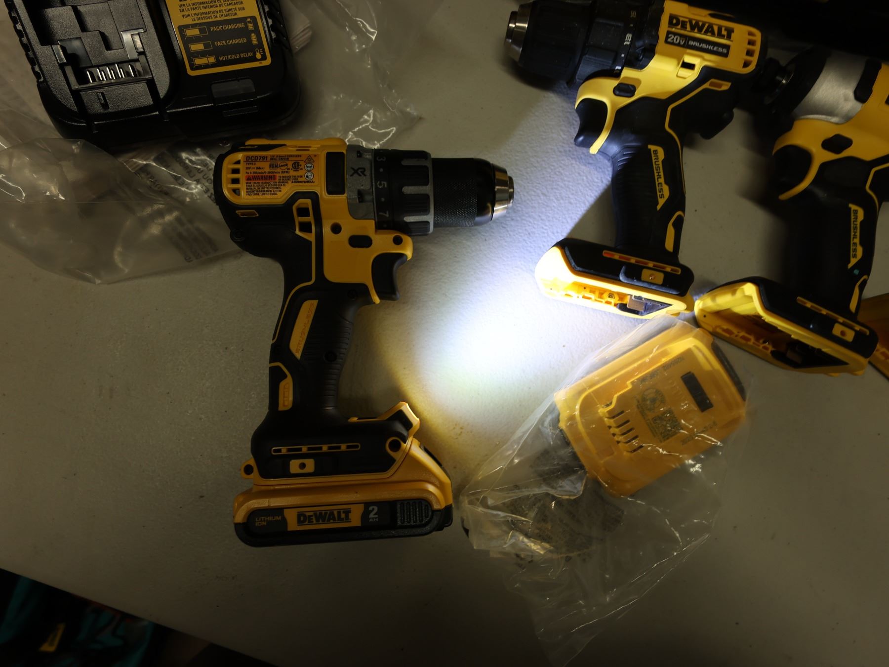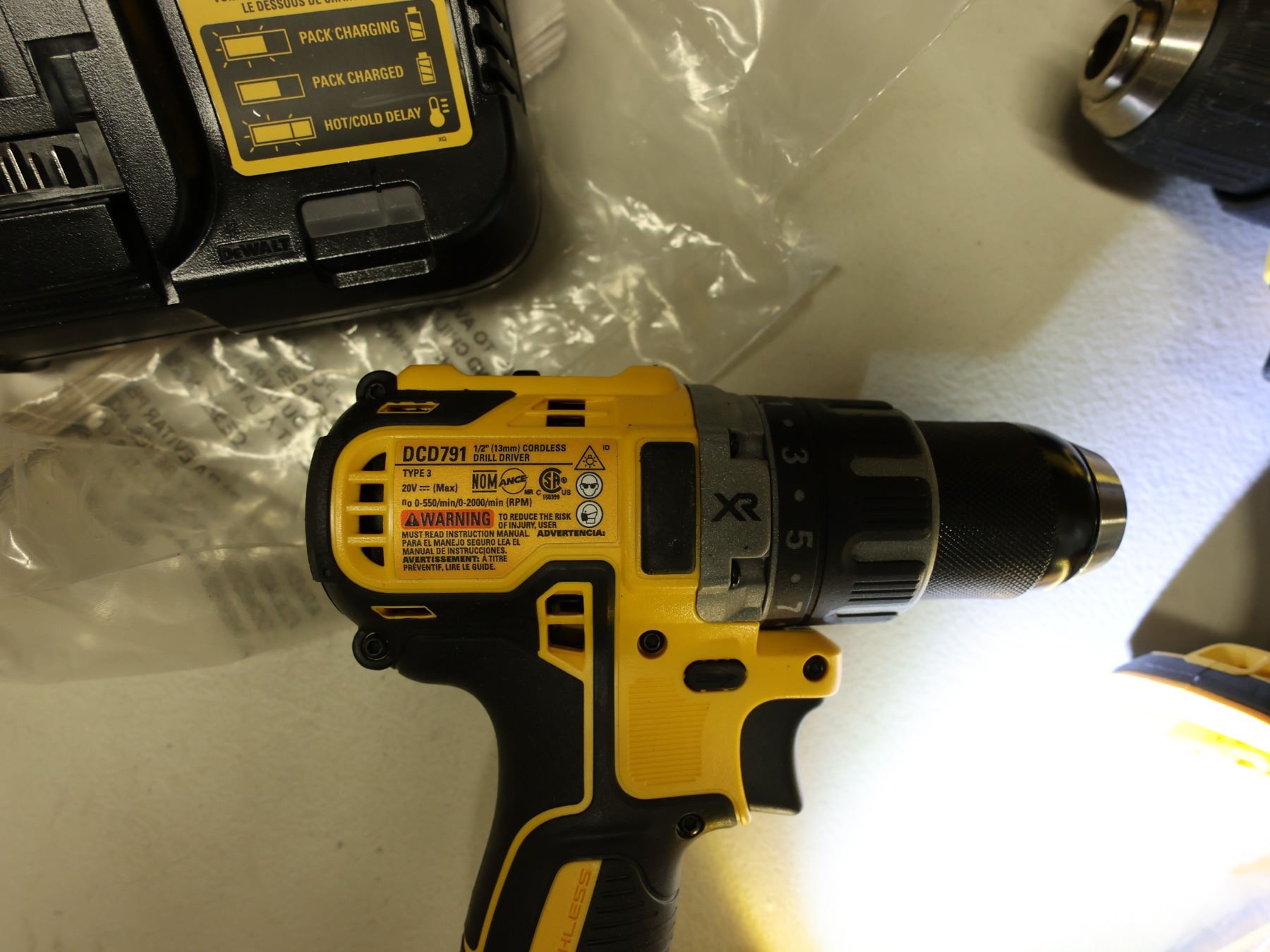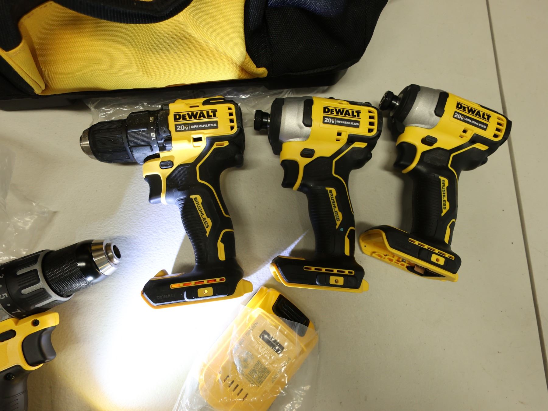 Qty 4 DeWalt Power Tools, Case & 1 Charger: DCD791 & DCD708 Drill Drivers & DCF809 Impact Drivers