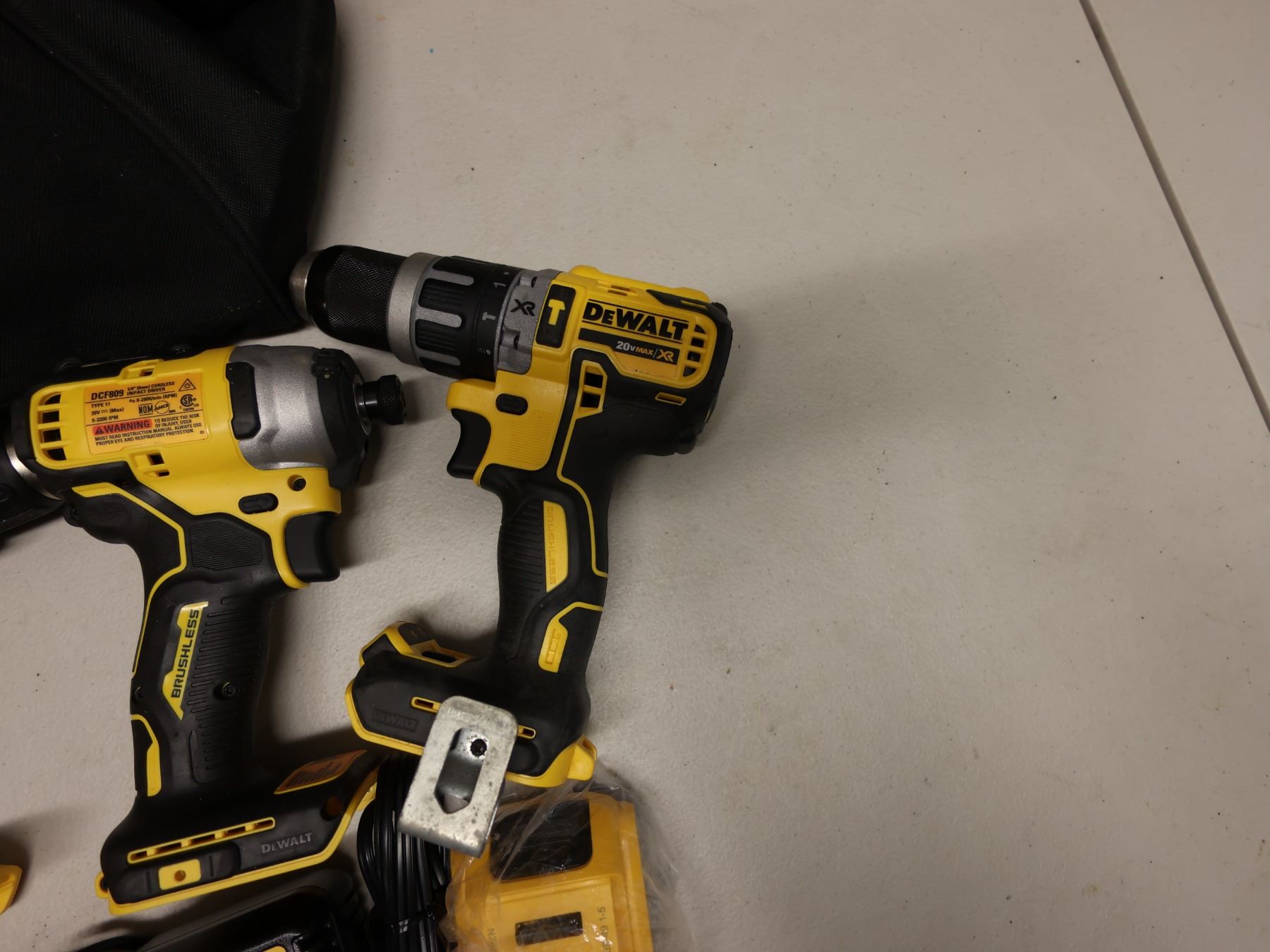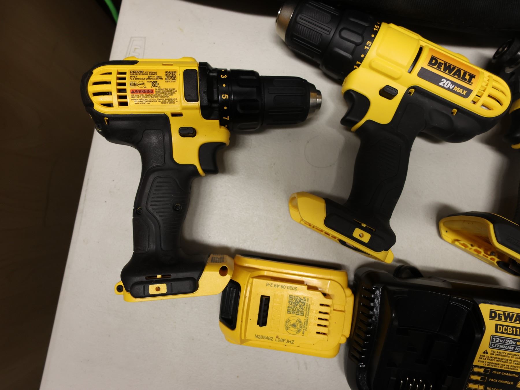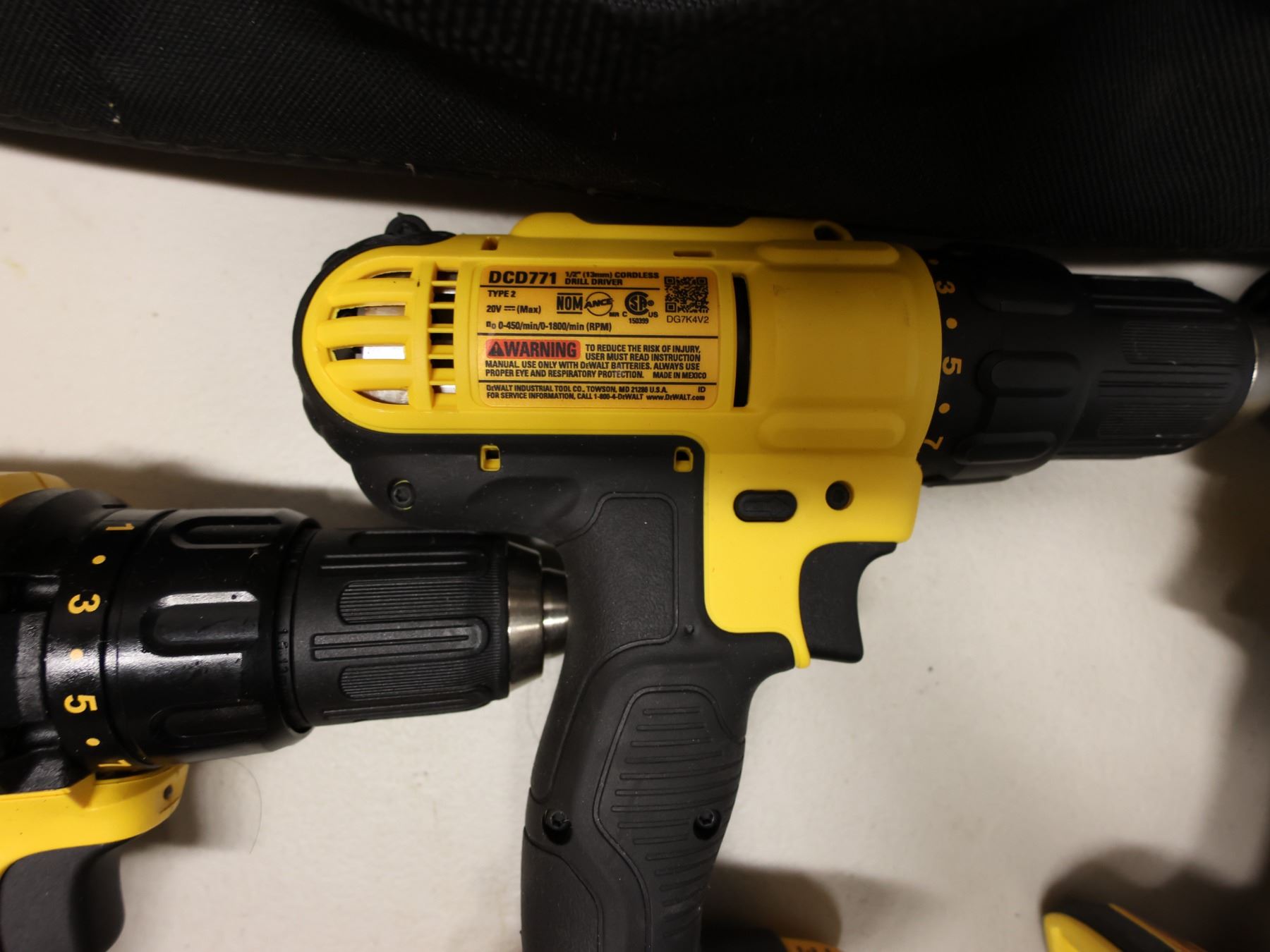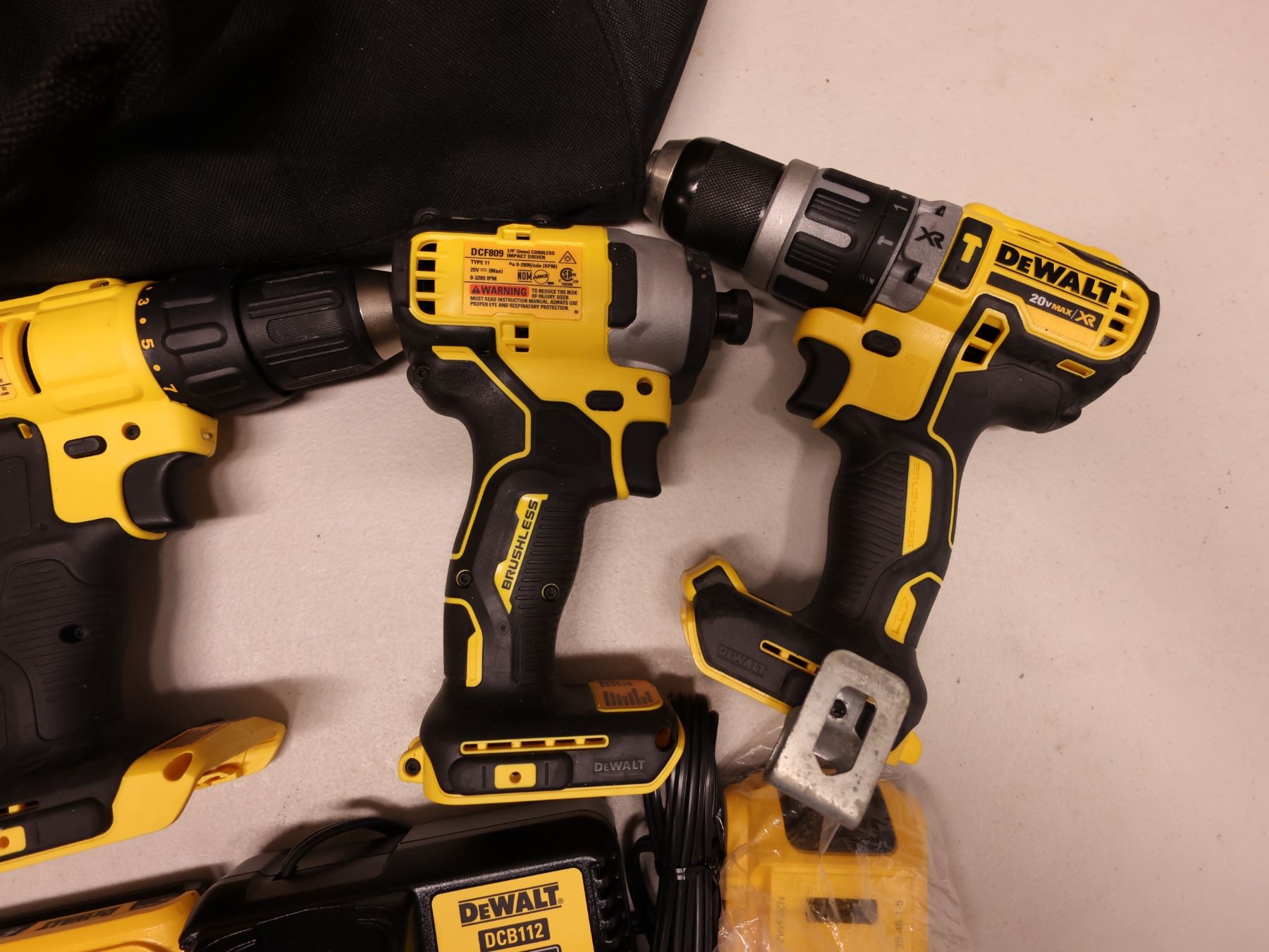 Qty 4 DeWalt Power Tools, Case, Batteries & Charger: DCD771, DCD796 & DCD780 Drill Drivers & DCF809 Impact Driver