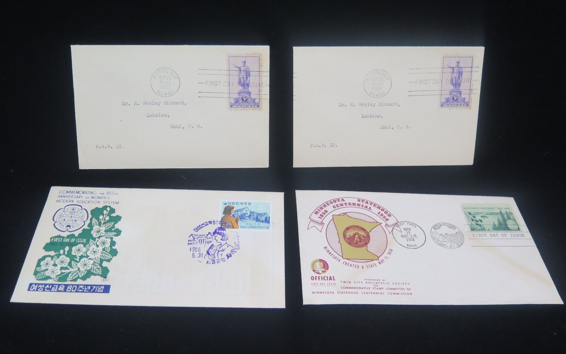 Qty 4 Envelopes: 2 First Day Hawaii Stamp 1937, Women's Education & Minnesota Statehood