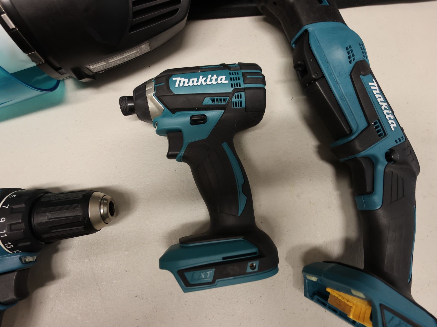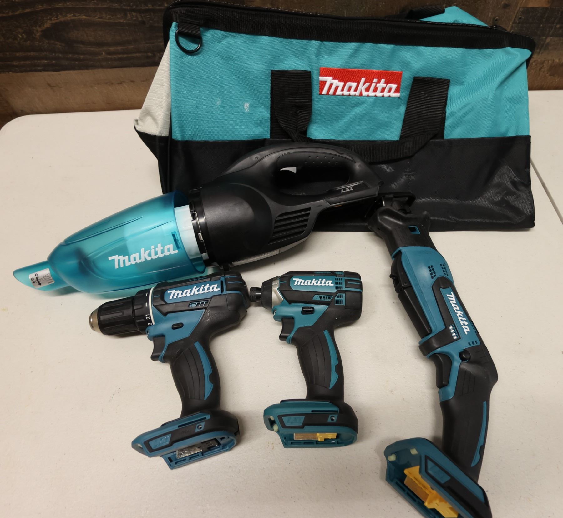 Qty 4 Makita Power Tools: XFD10 Drill, XDT11 Impact Driver, XRJ01 Reciprocating Saw, Vacuum & Carry Case