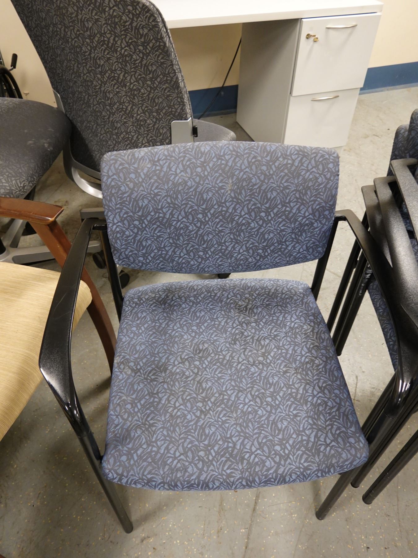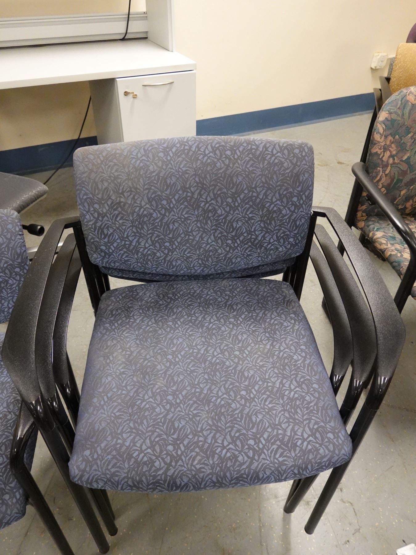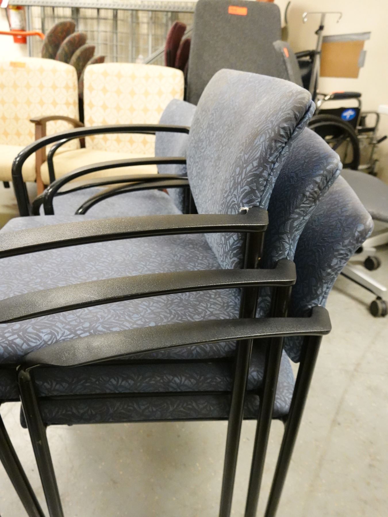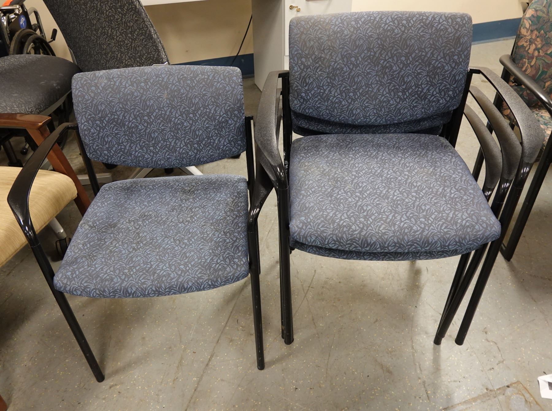 Qty 4 Metal Stacking Armchairs w/ Upholstered Seats & Backs.