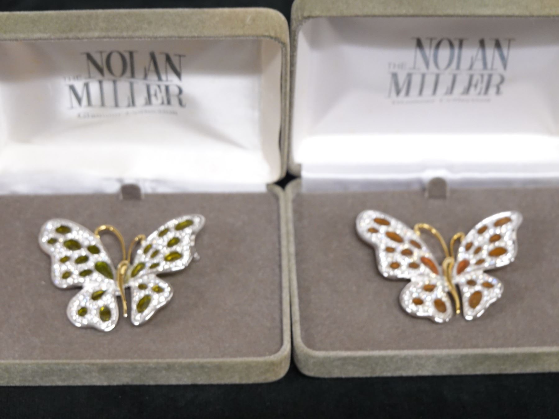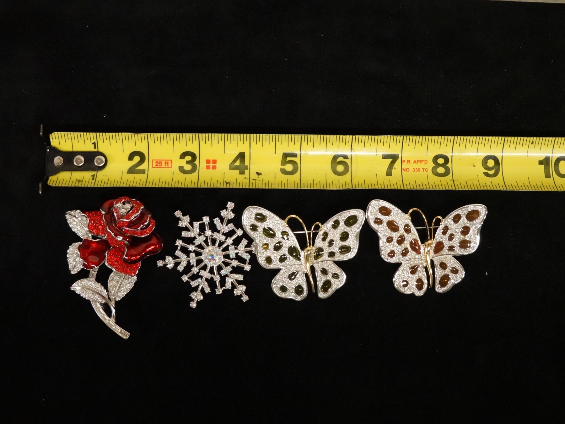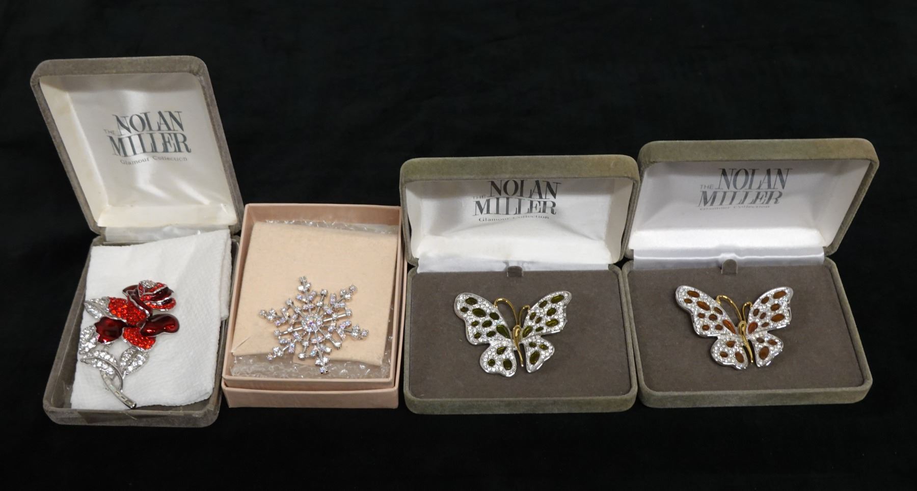 Qty 4 Nolan Miller Fashion Brooches: Rose, Snowflake & 2 Butterflies, Misc Sizes