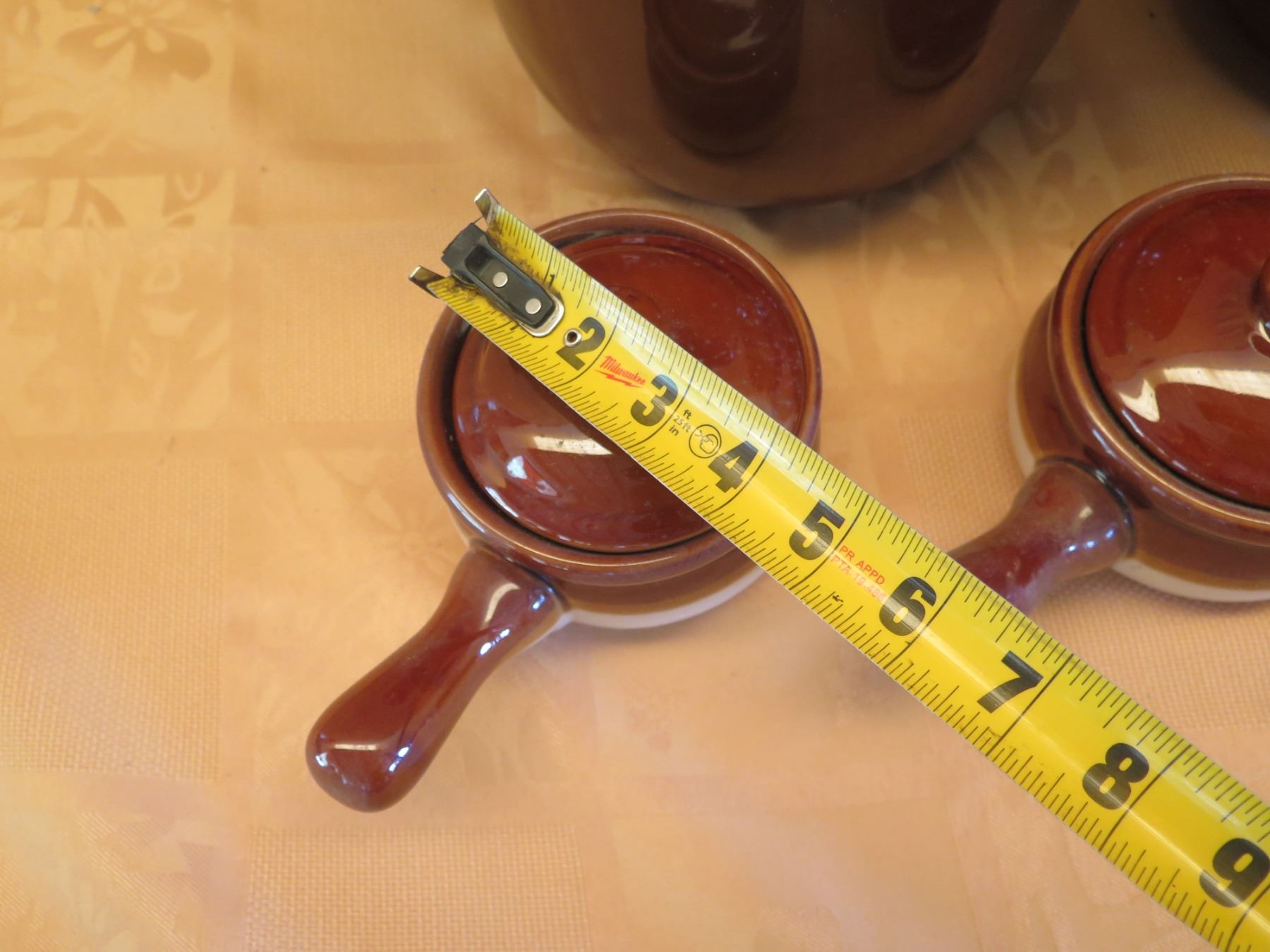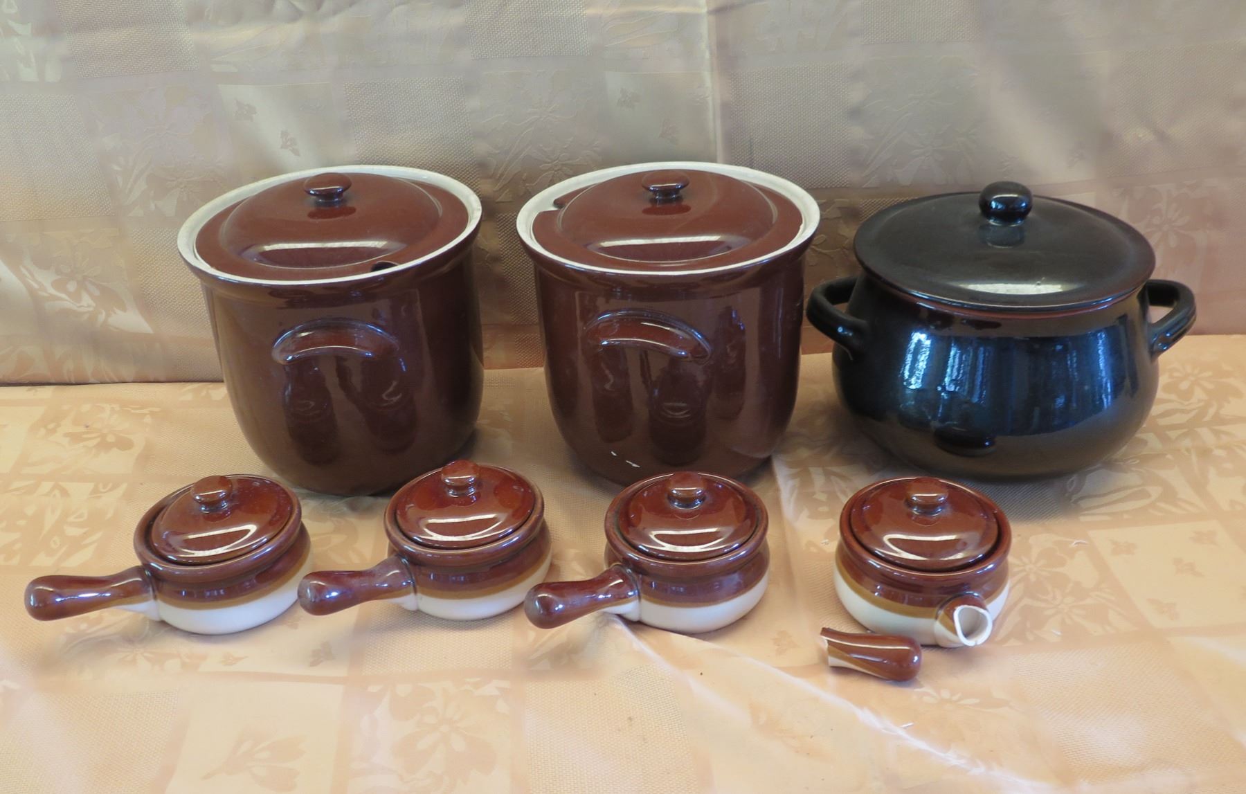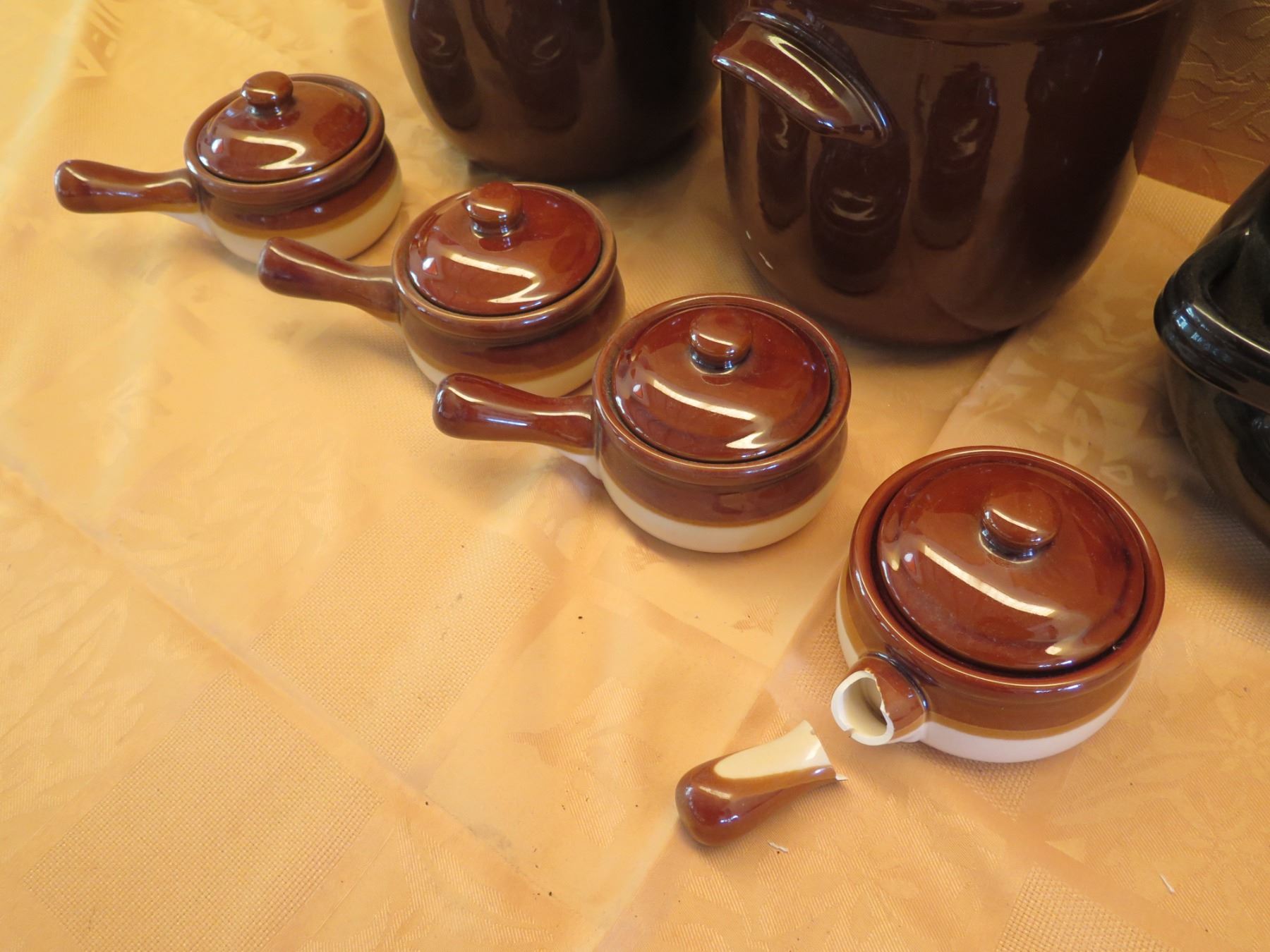 Qty 4 Onion Soup Bowls & 3 Crocks w/ Lids
