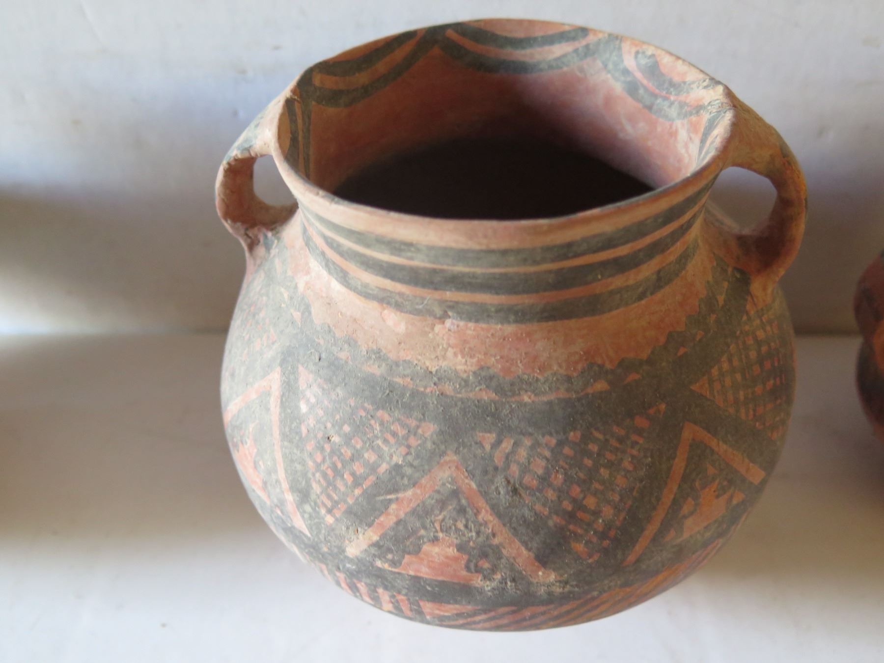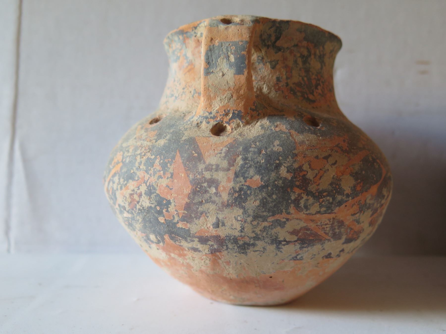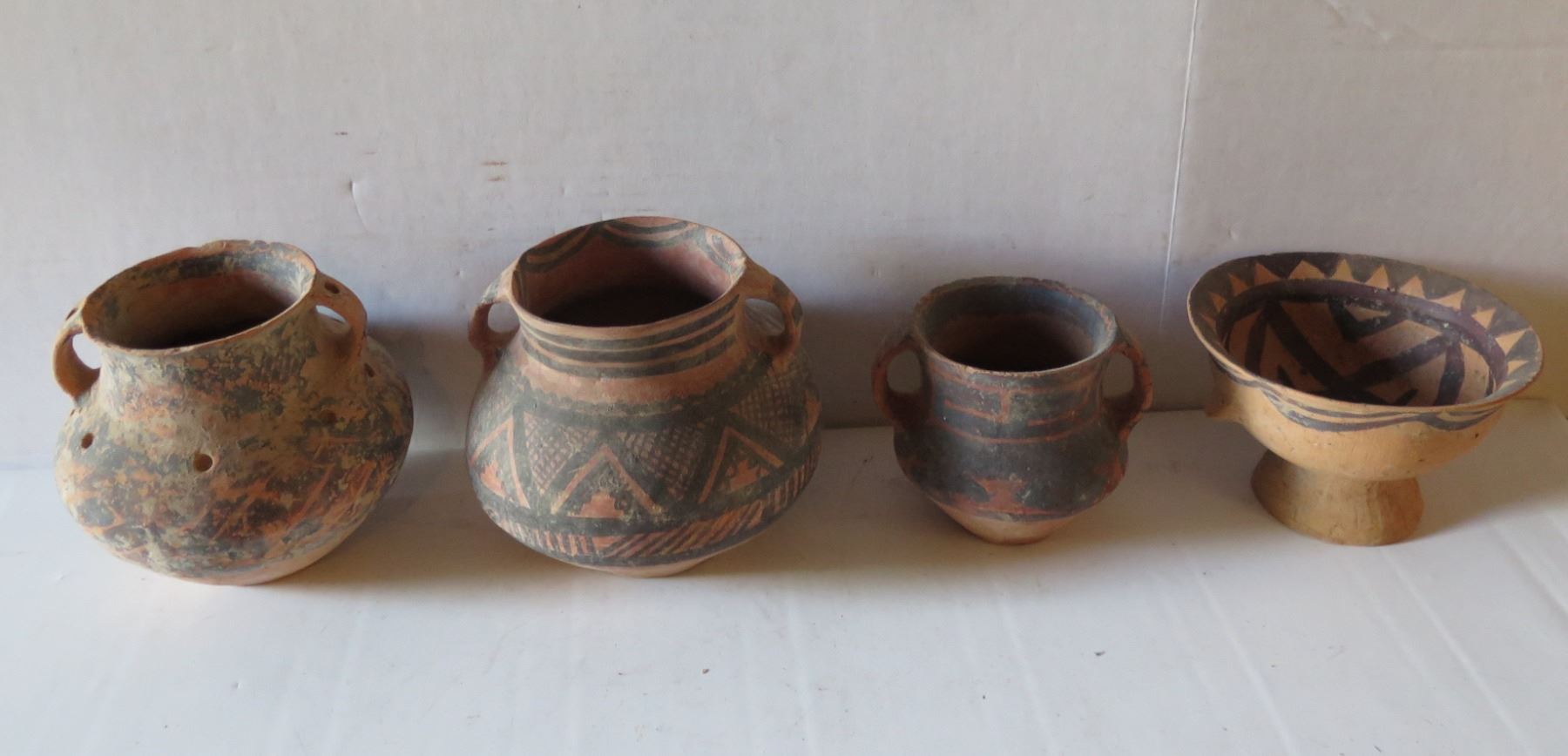 Qty 4 Painted Clay Vases, 3 w/ Handles, Misc Sizes