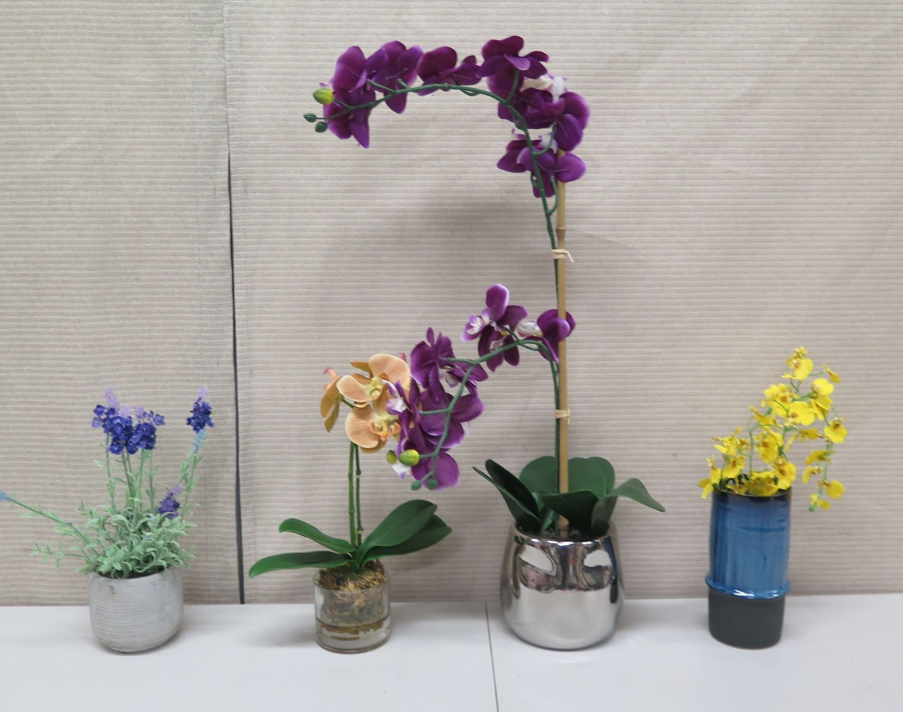 Qty 4 Potted Artificial Flower Plants: Orchids, African Violets, Ferns, etc