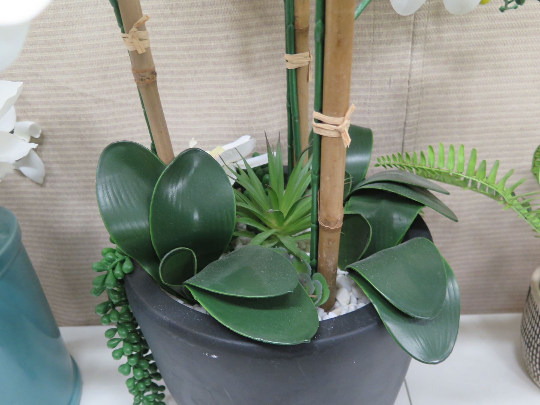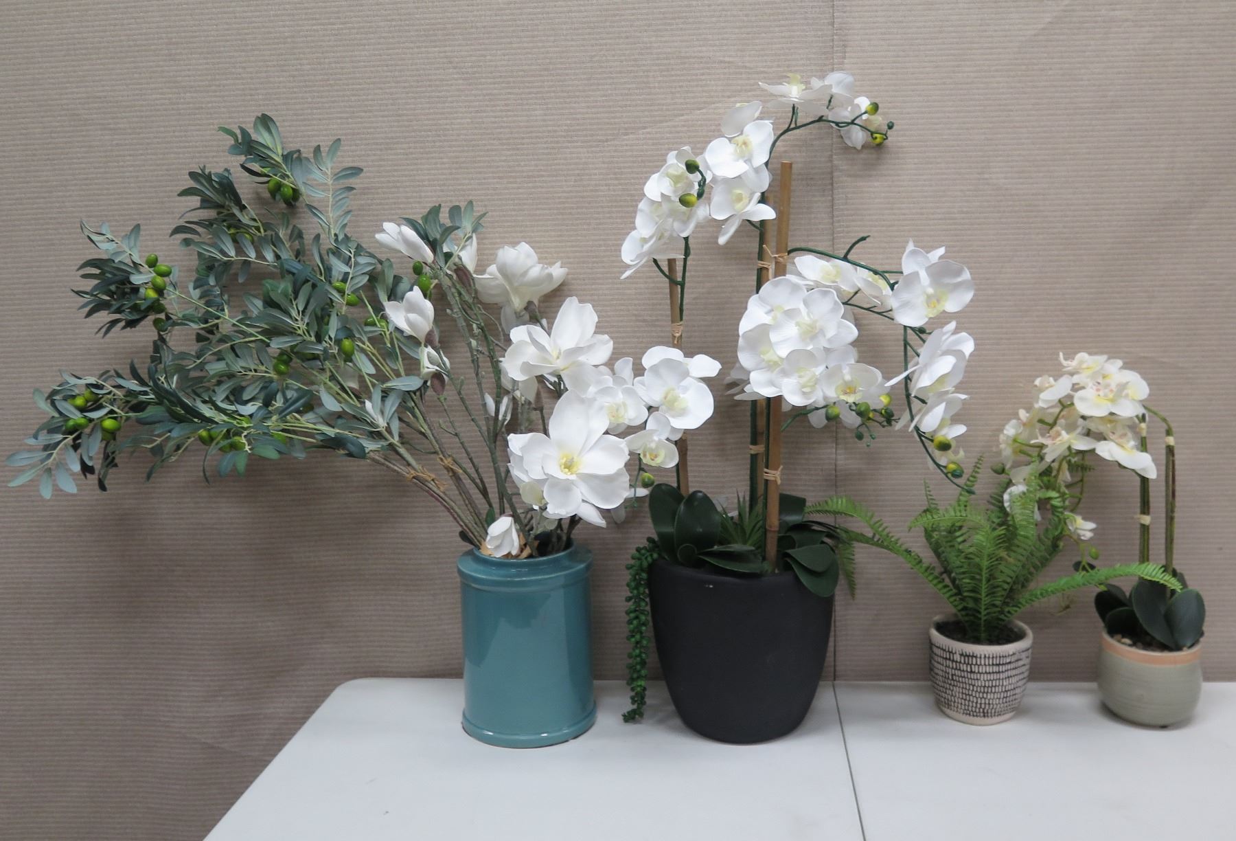 Qty 4 Potted Artificial Flower Plants: Orchids, Berries, Ferns, etc