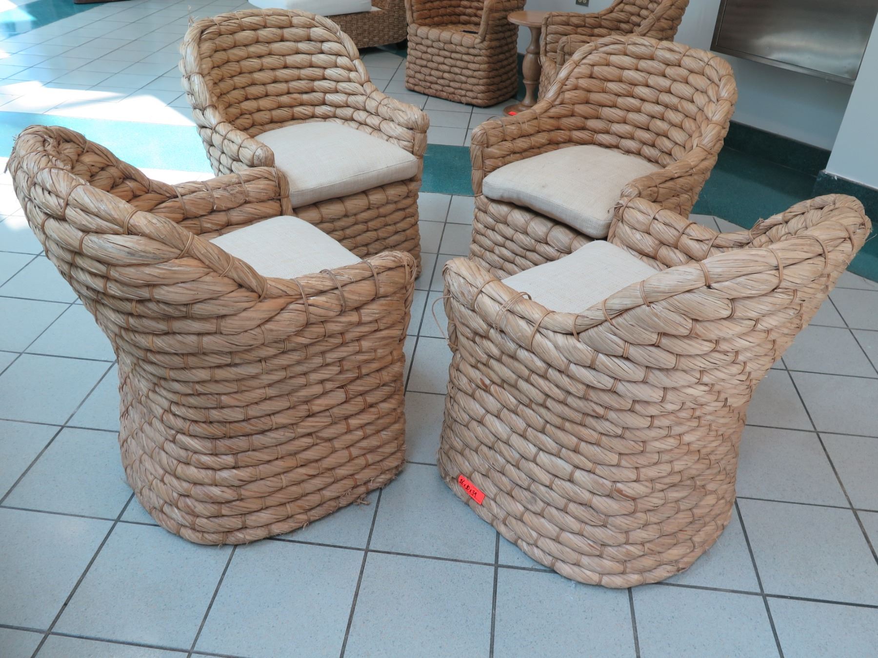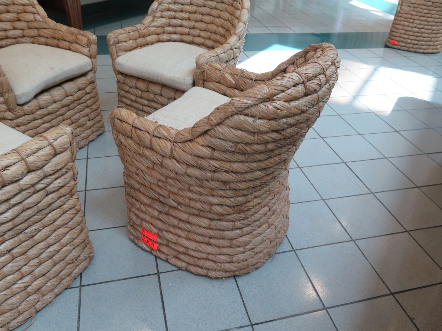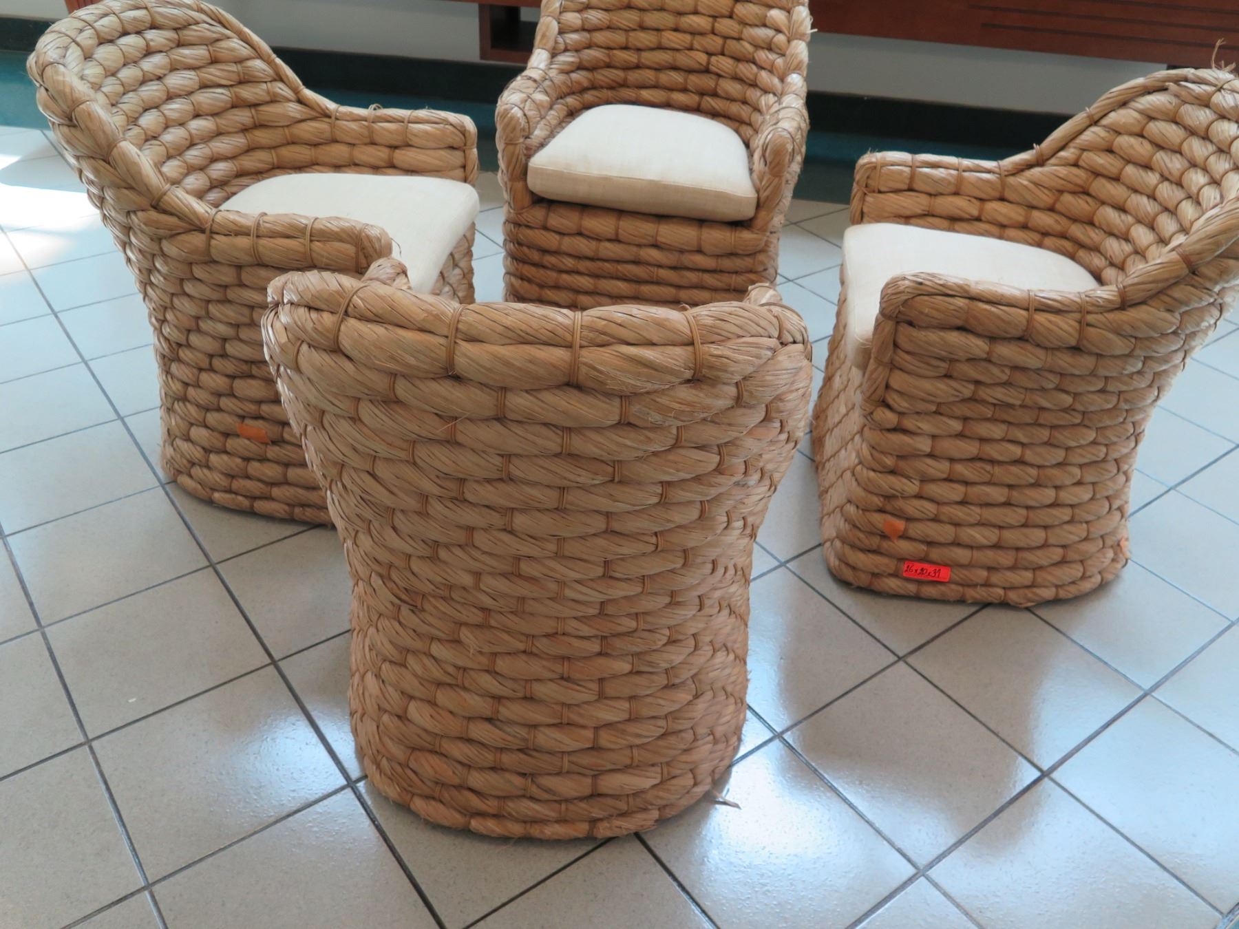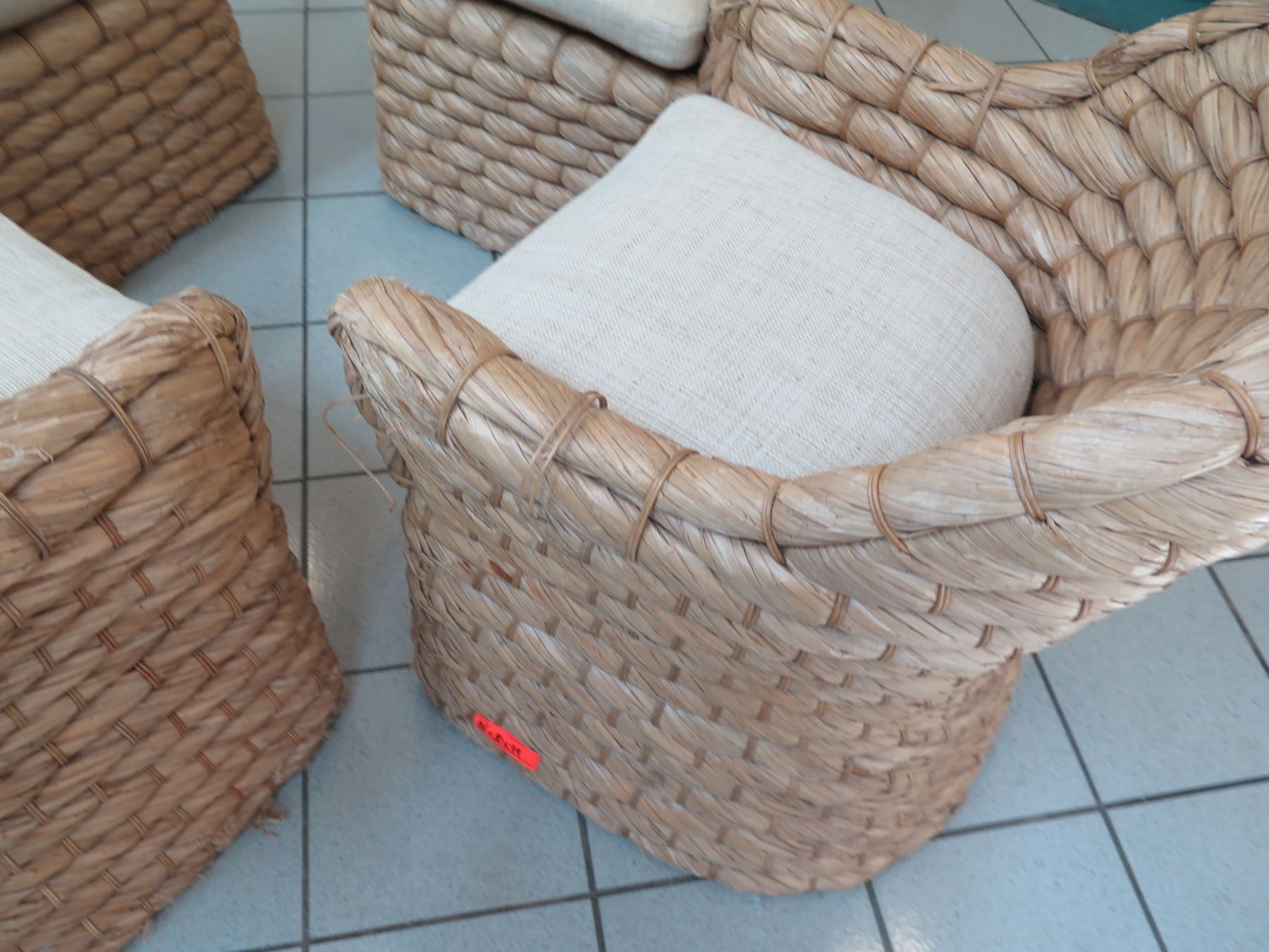 Qty 4 Ralph Lauren Joshua Tree Woven Barrel-Back Chairs w/ Cushions, 26"W x 20" x 34" back height. Please refer to all the pictures in this listing to see general wear and tear on these chairs.