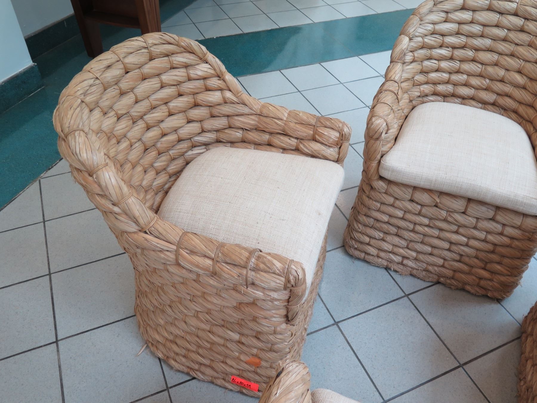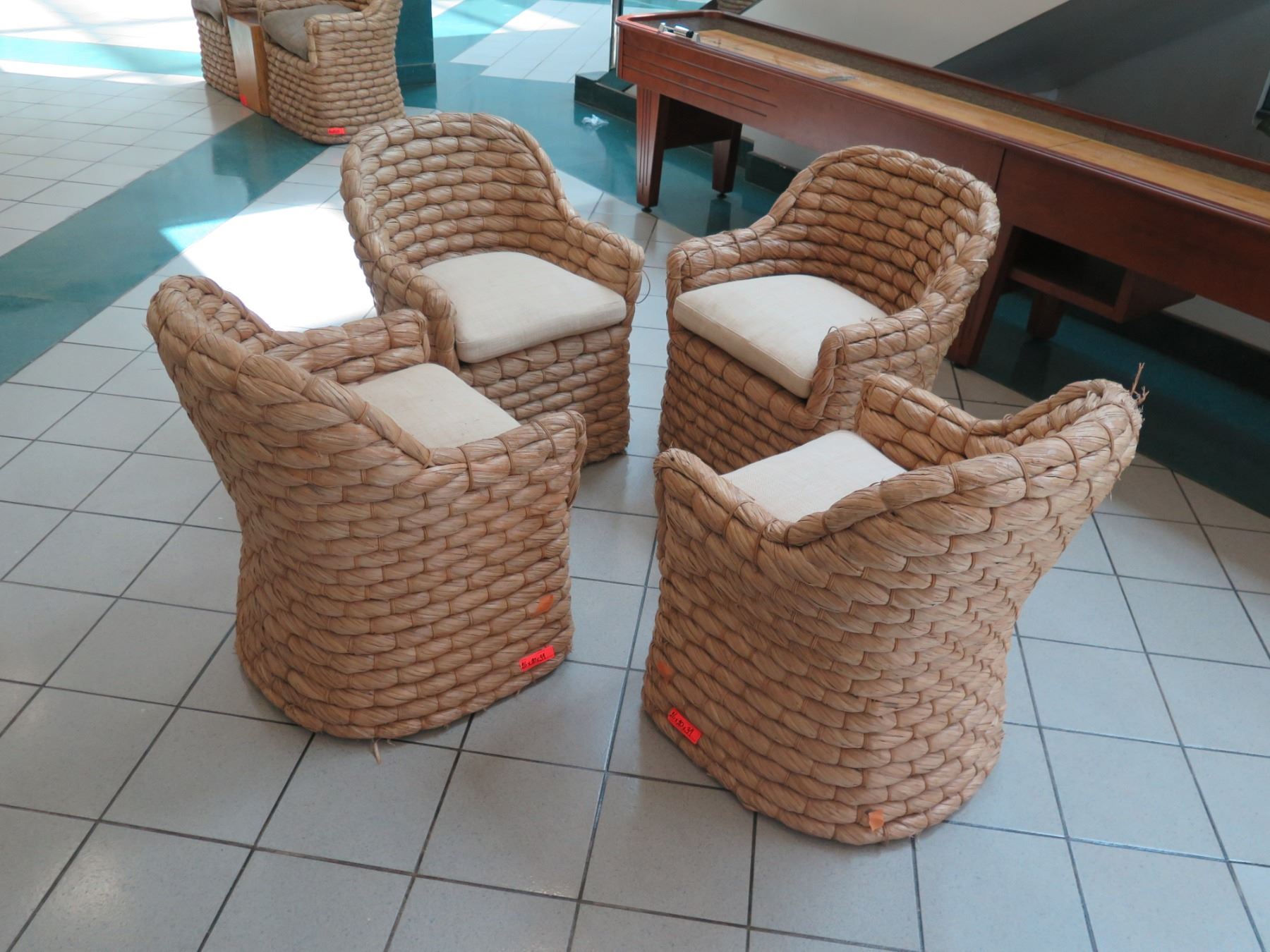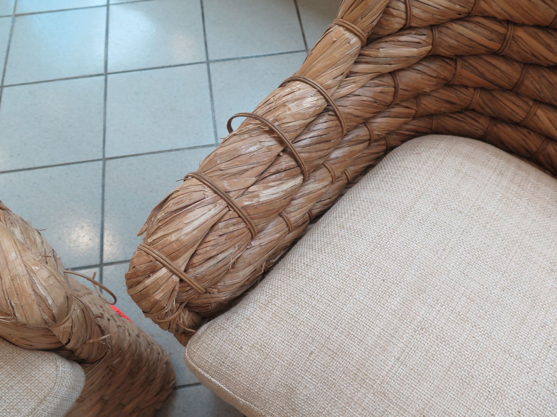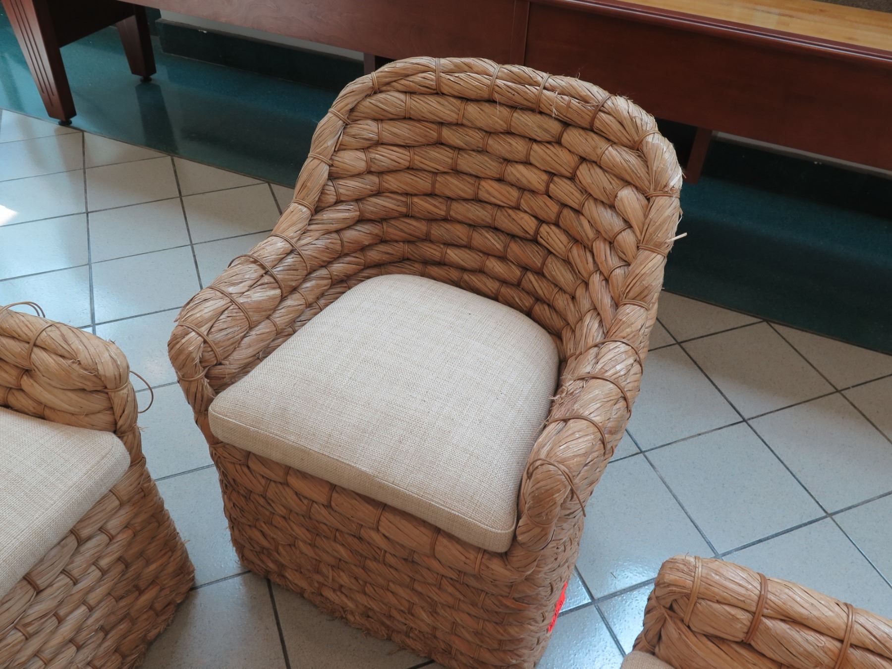 Qty 4 Ralph Lauren Joshua Tree Woven Barrel-Back Chairs w/ Cushions, 26"W x 20" x 34" back height. Please refer to all the pictures in this listing to see general wear and tear on these chairs.
