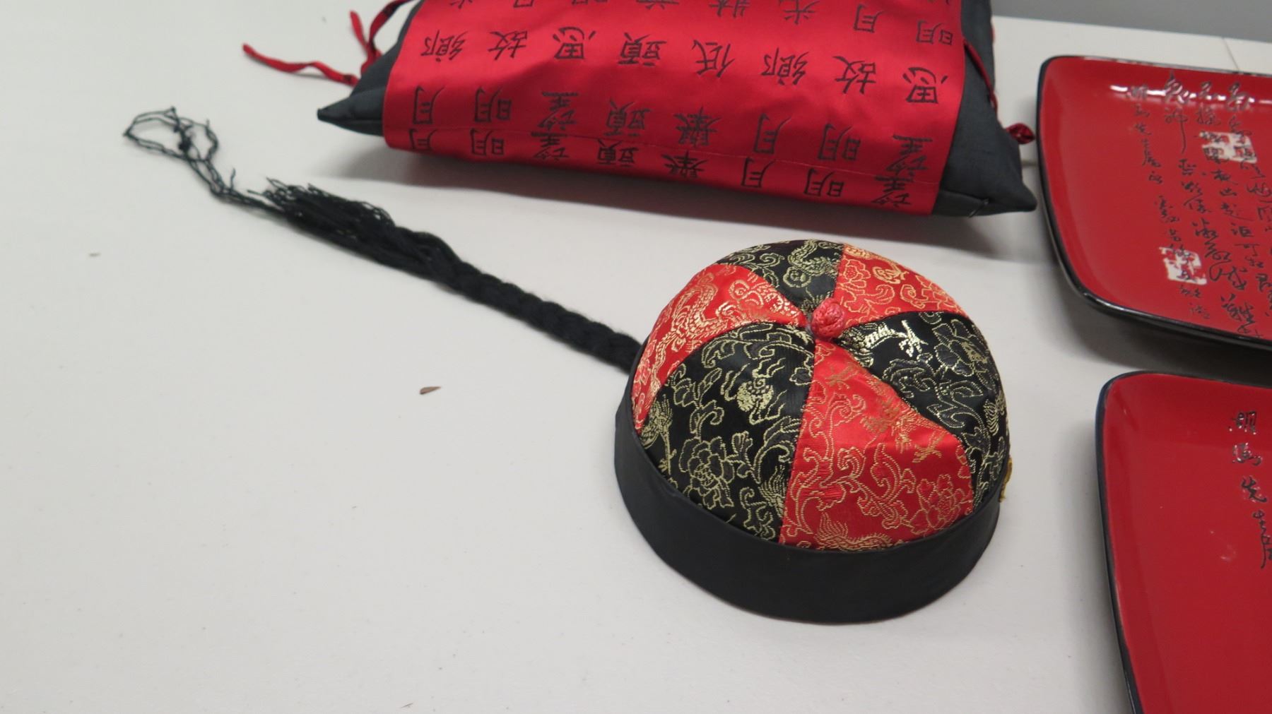 Qty 4 Red Lacquered Square Plates, Black & Red Oriental Table Runner, Pincushion, etc
