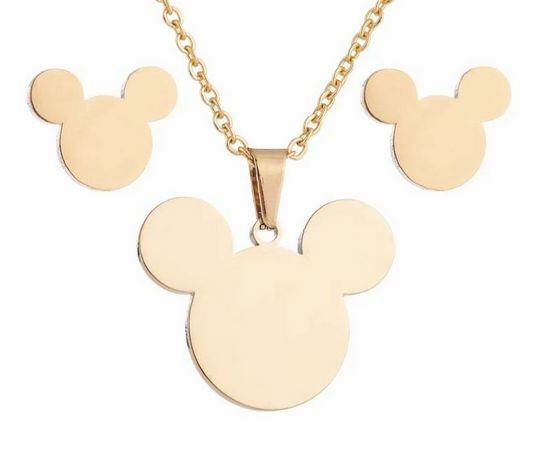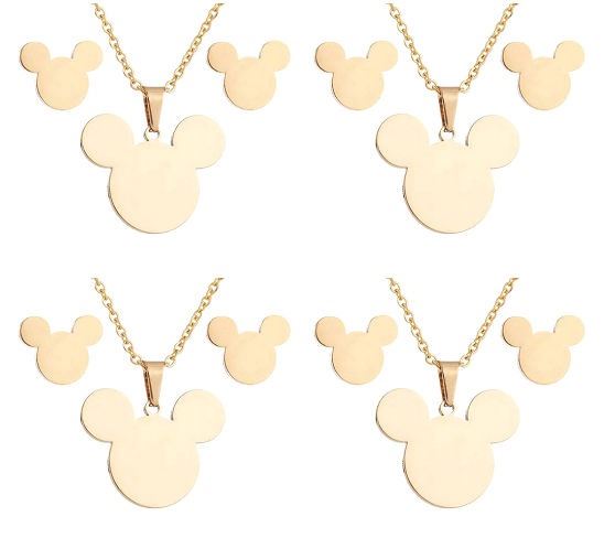 Qty 4 Sets New Fashion Mickey Mouse Gold-Tone Metal Necklace & Pierced Earrings