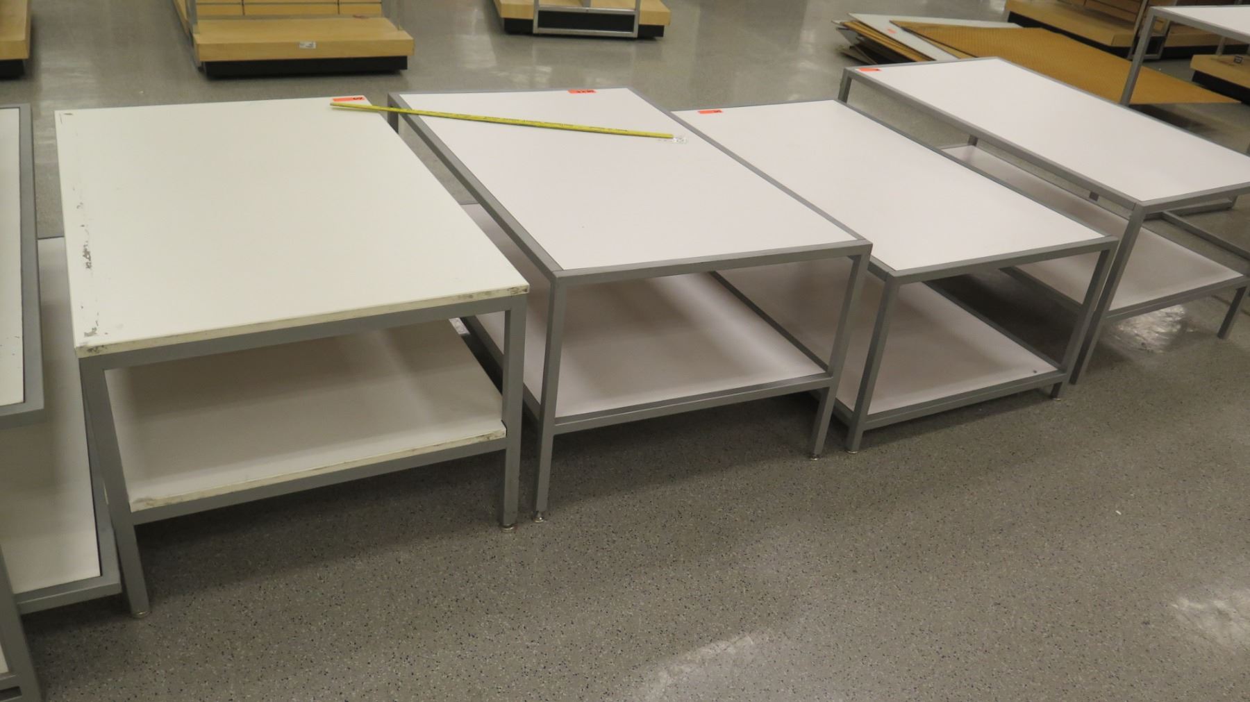 Qty 4 White & Metal Rectangle Display Tables & Tall Shelf Display. Qty 3: 48"L x 30"W x 23.5"H; Qty 1: 48"L x 30"W x 20"H; Display: 59"L x 34"D x 51"H