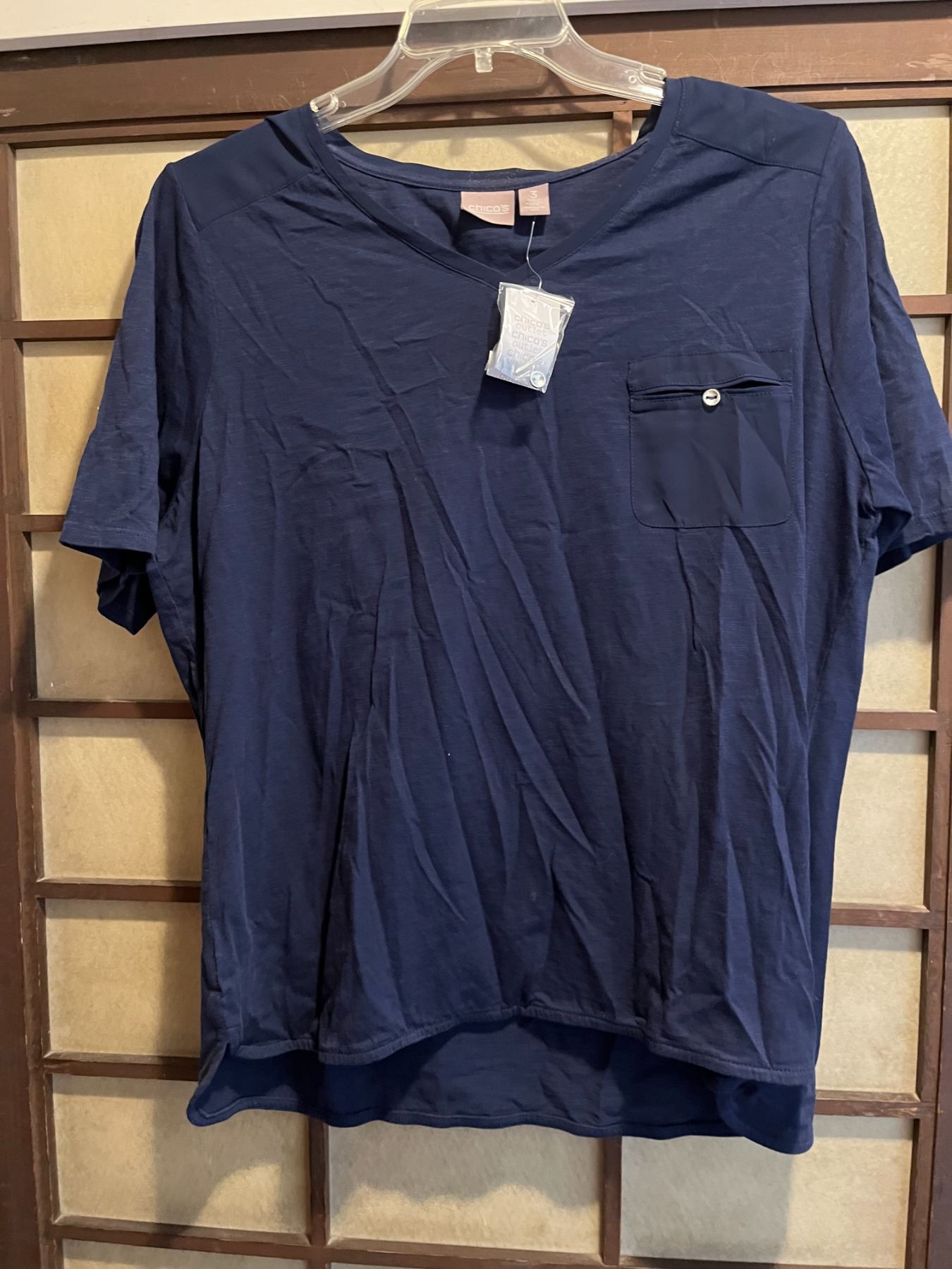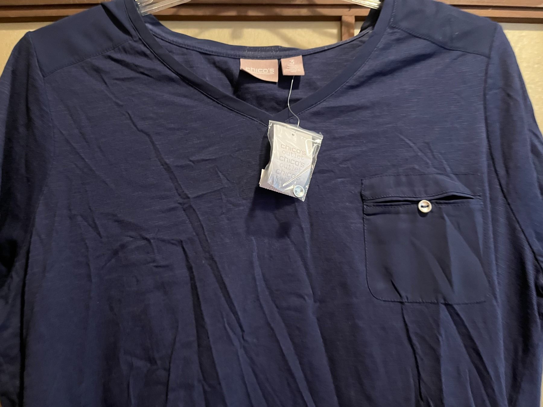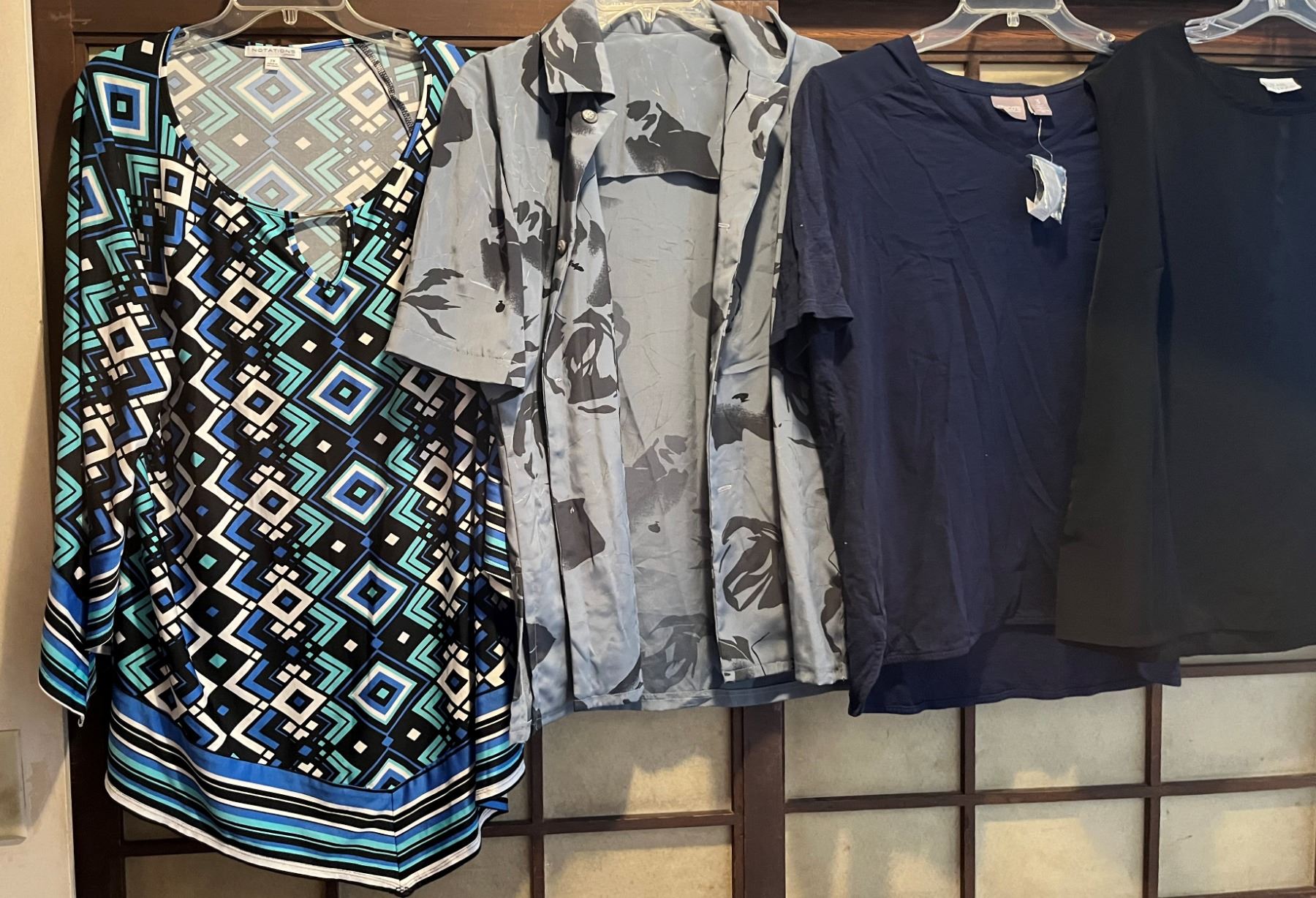 Qty 4 Women's Shirts: New Chico Size 3 (44" bust), Notations 2X (48" bust), Blair Tank (46") & Homemade (40") Note: These are preowned and may have flaws. Some size tags have been removed. Items are measured flat & doubled.