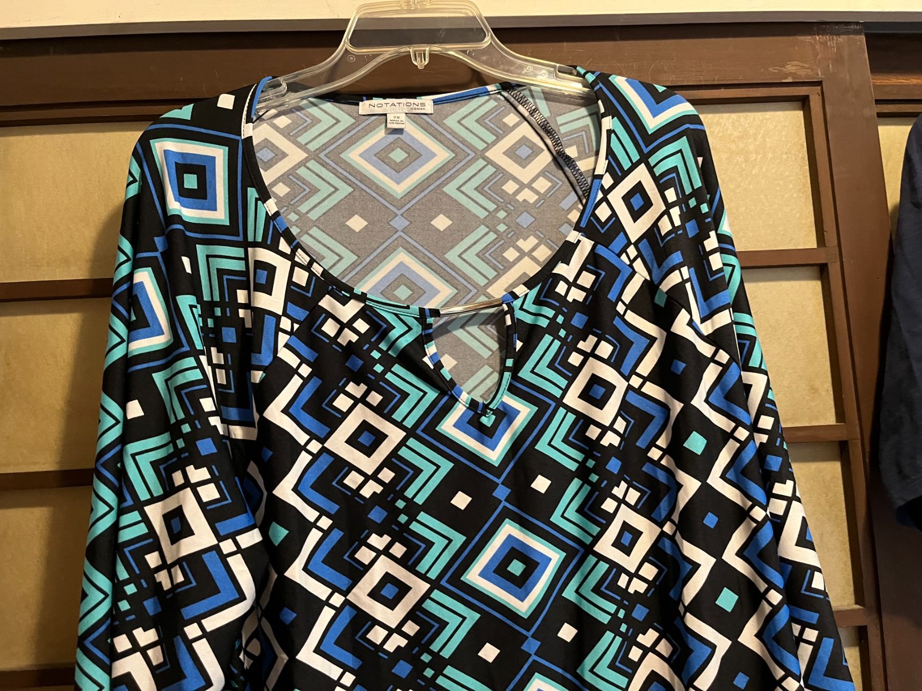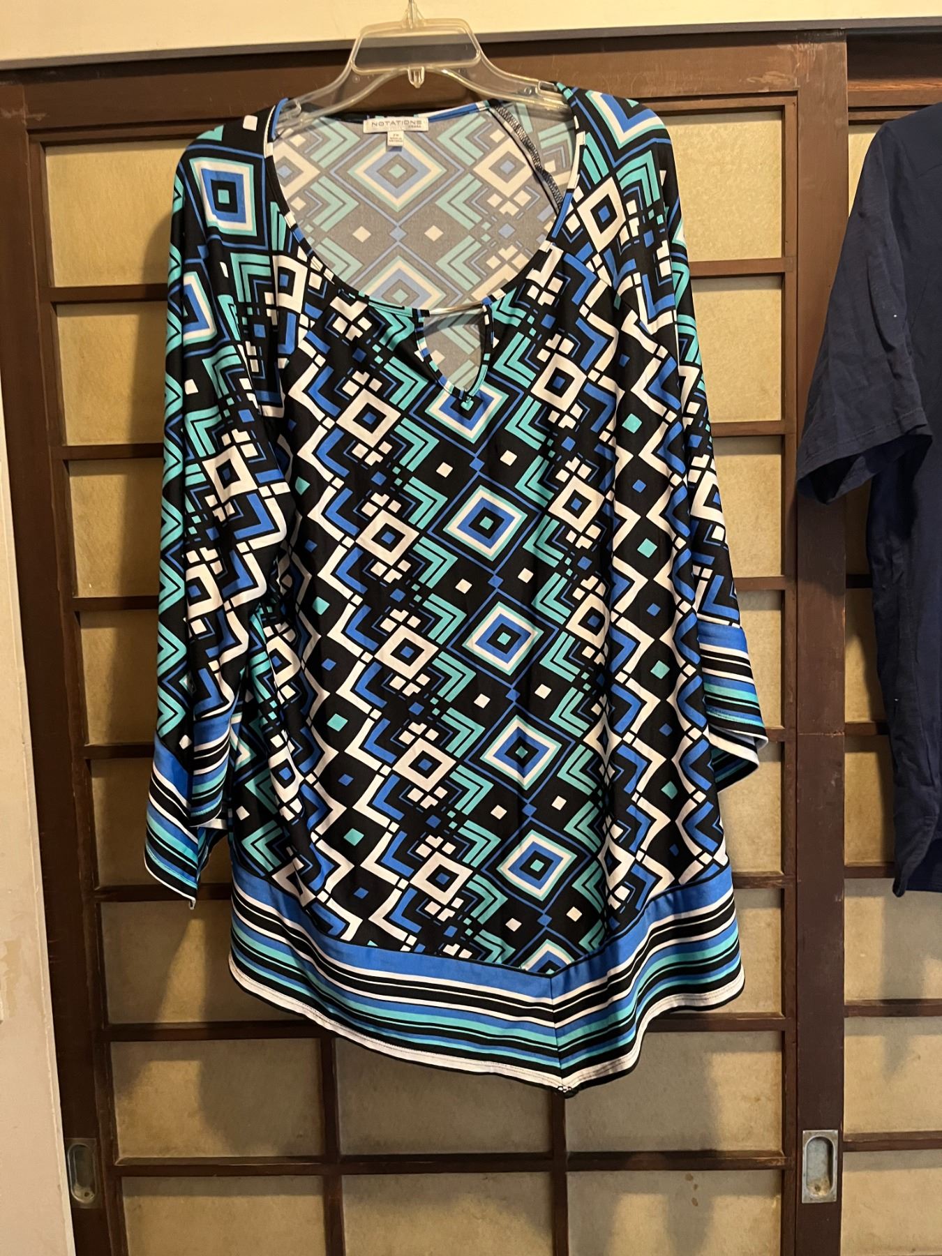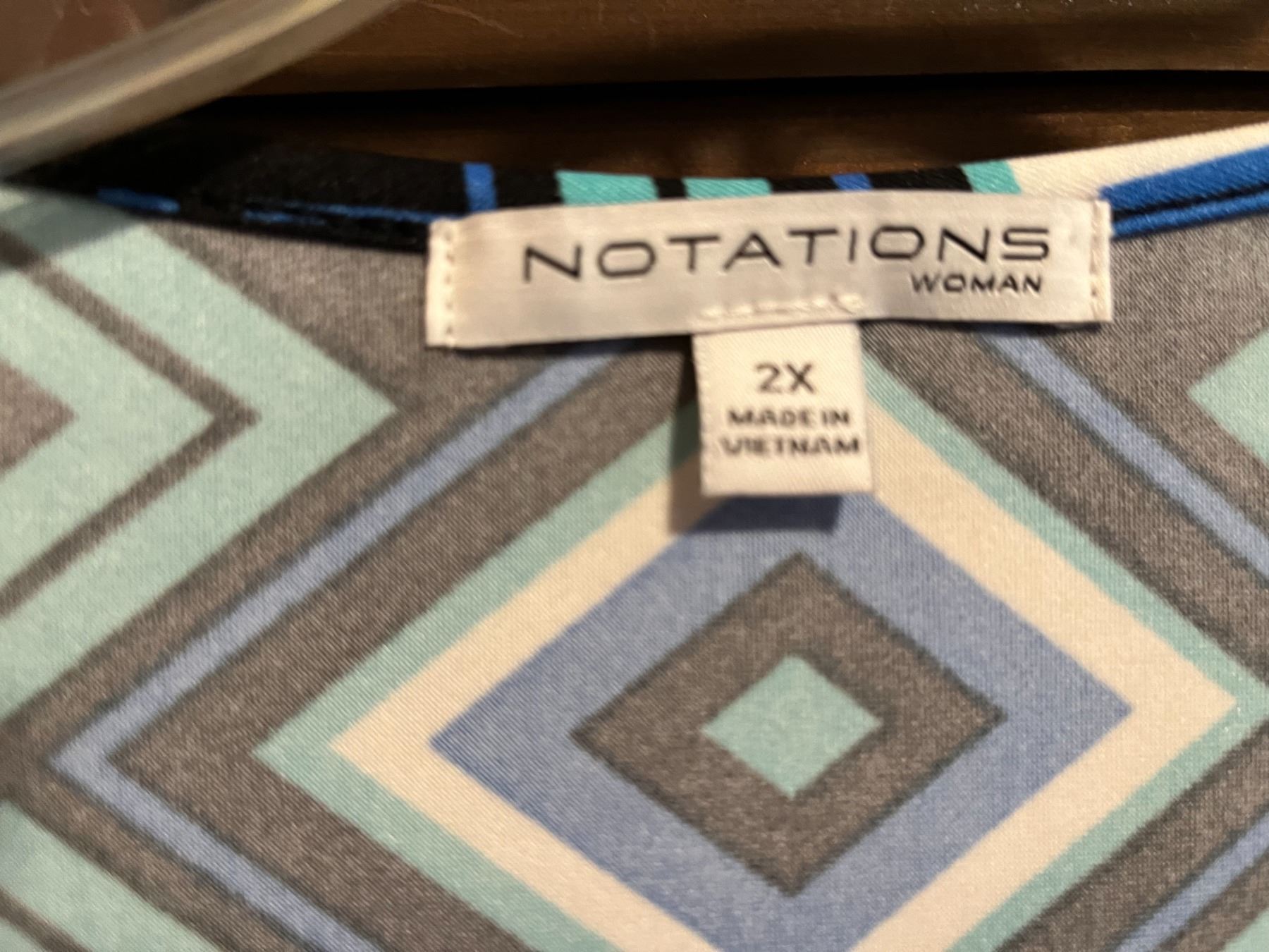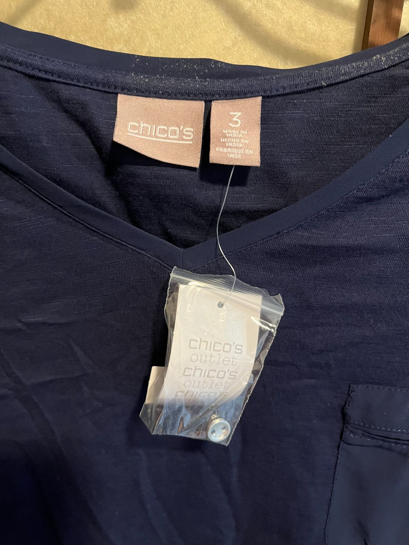 Qty 4 Women's Shirts: New Chico Size 3 (44" bust), Notations 2X (48" bust), Blair Tank (46") & Homemade (40") Note: These are preowned and may have flaws. Some size tags have been removed. Items are measured flat & doubled.