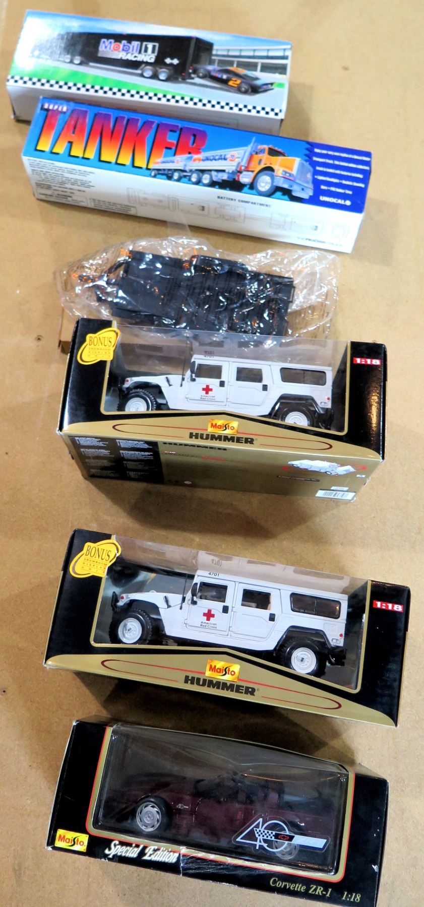 Qty 5 Collectible Cars in Box - Maisto Corvette ZR-1, Tanker & 3 Hummers