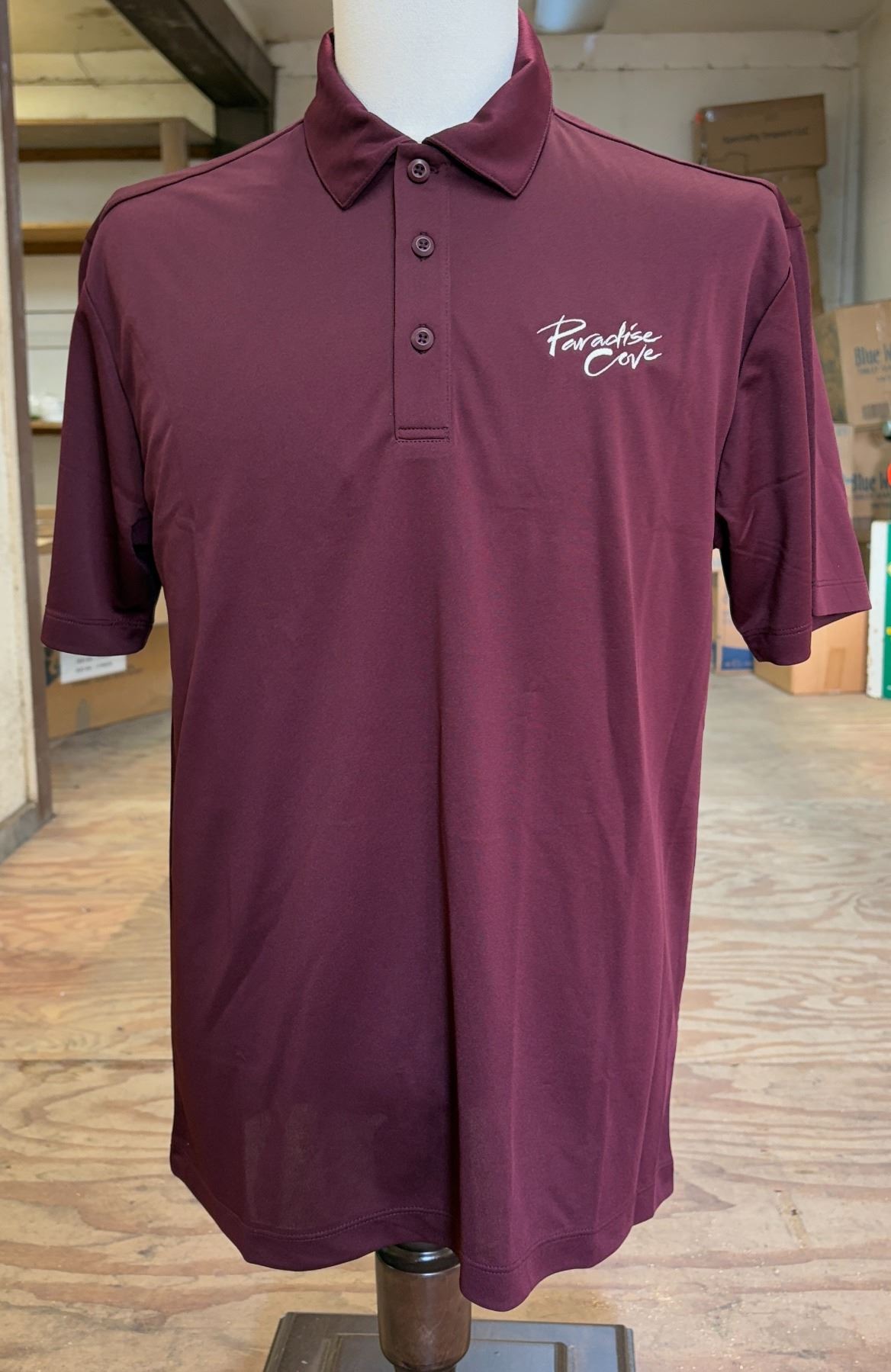 Qty 5 Maroon Paradise Cove Luau Men's Polo Shirts - two are size Large, three are size XL.