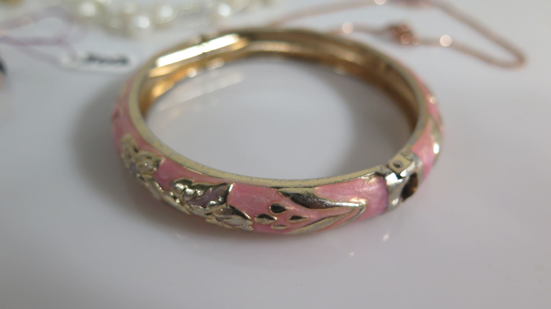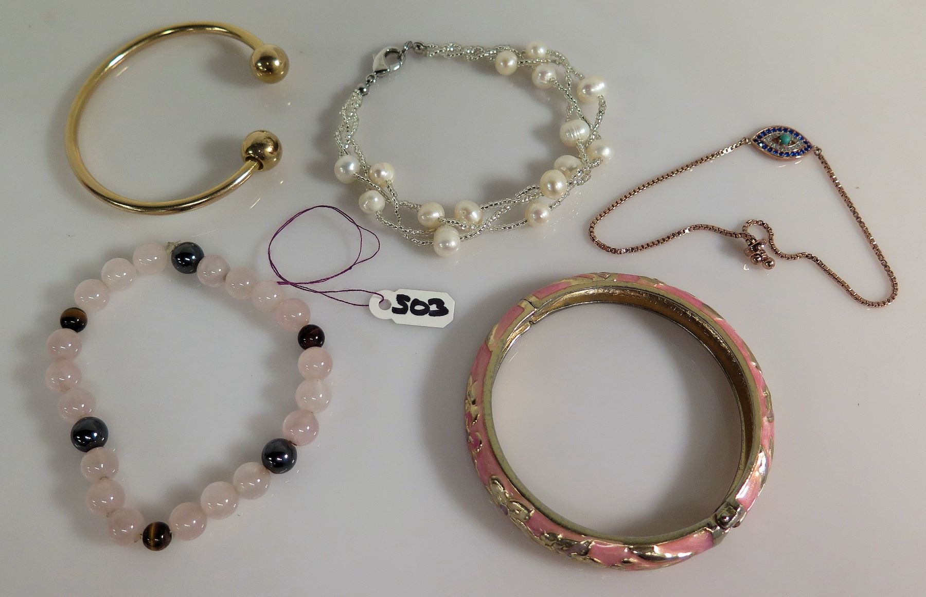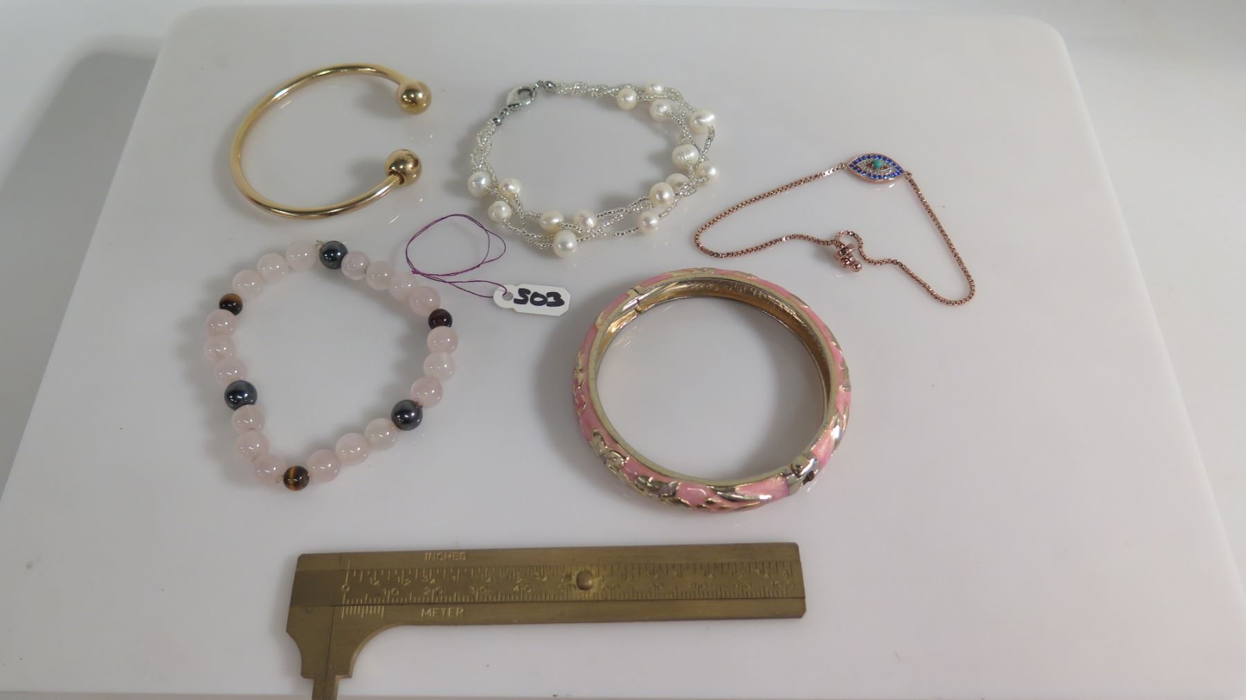 Qty 5 Misc Bracelets - Silver Pearl, Pink Enamel, Beaded, Bangle & Chain