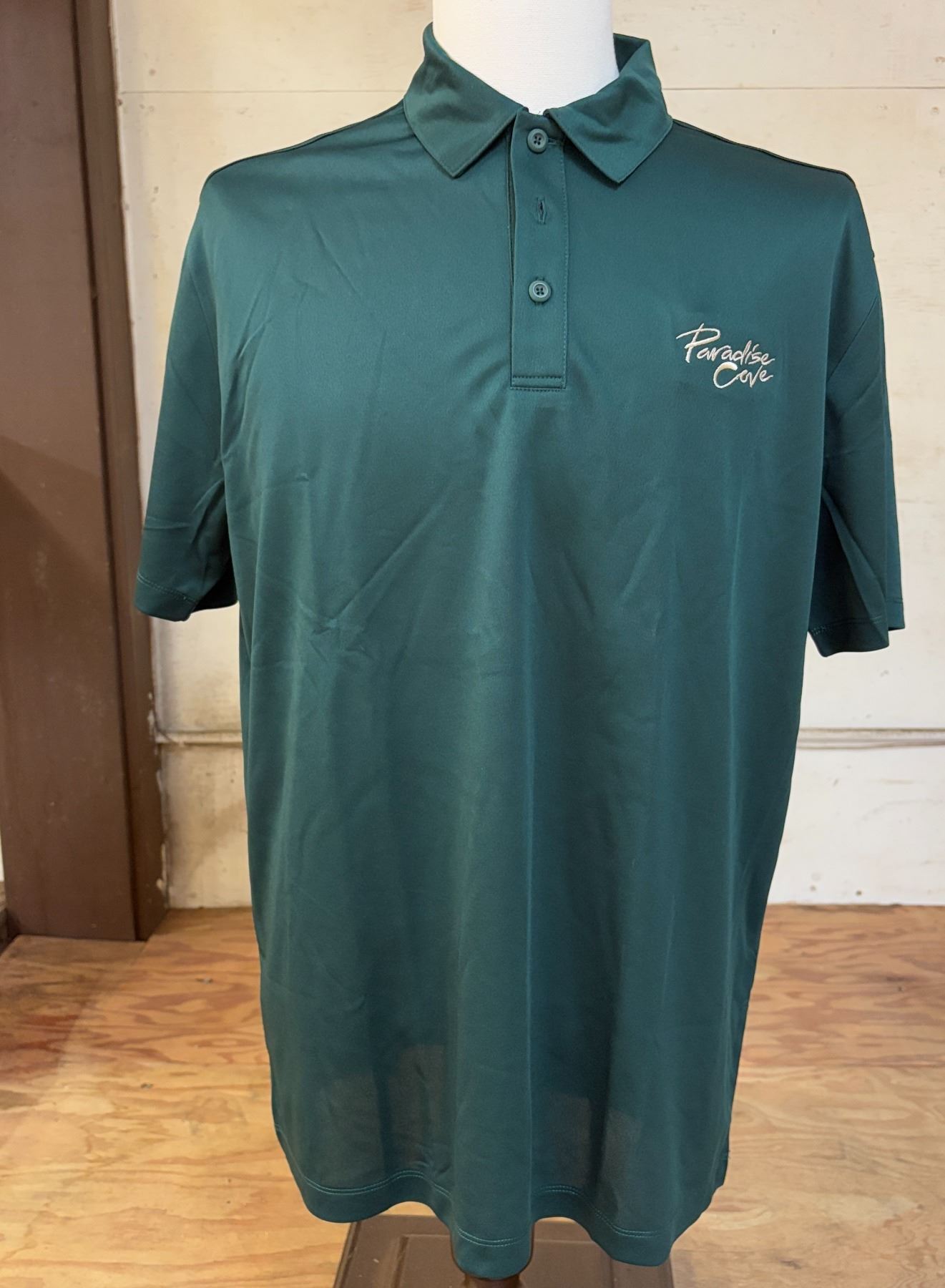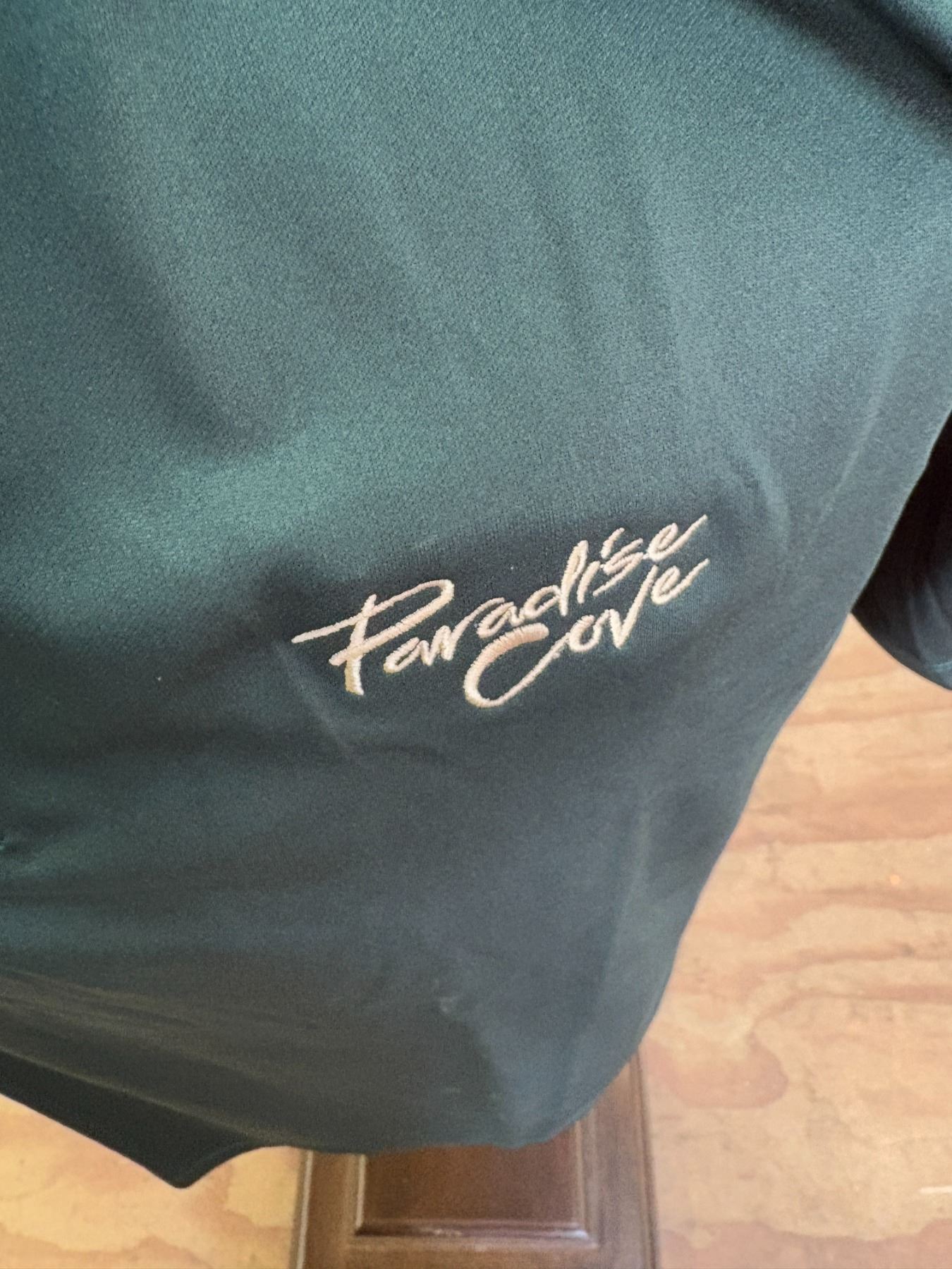 Qty 5 Green Paradise Cove Luau Men's Polo Shirts - 2 size Small, 3 size Large.