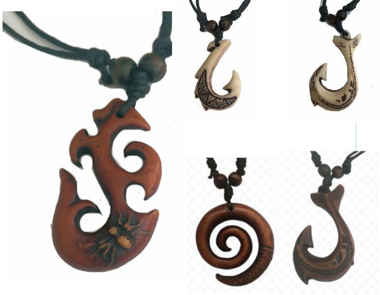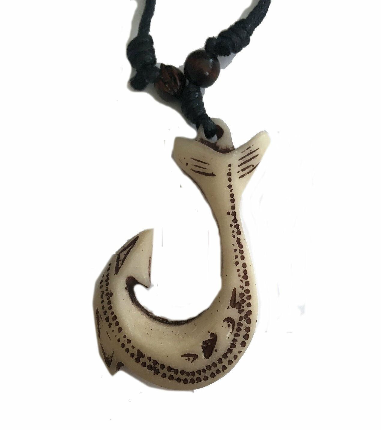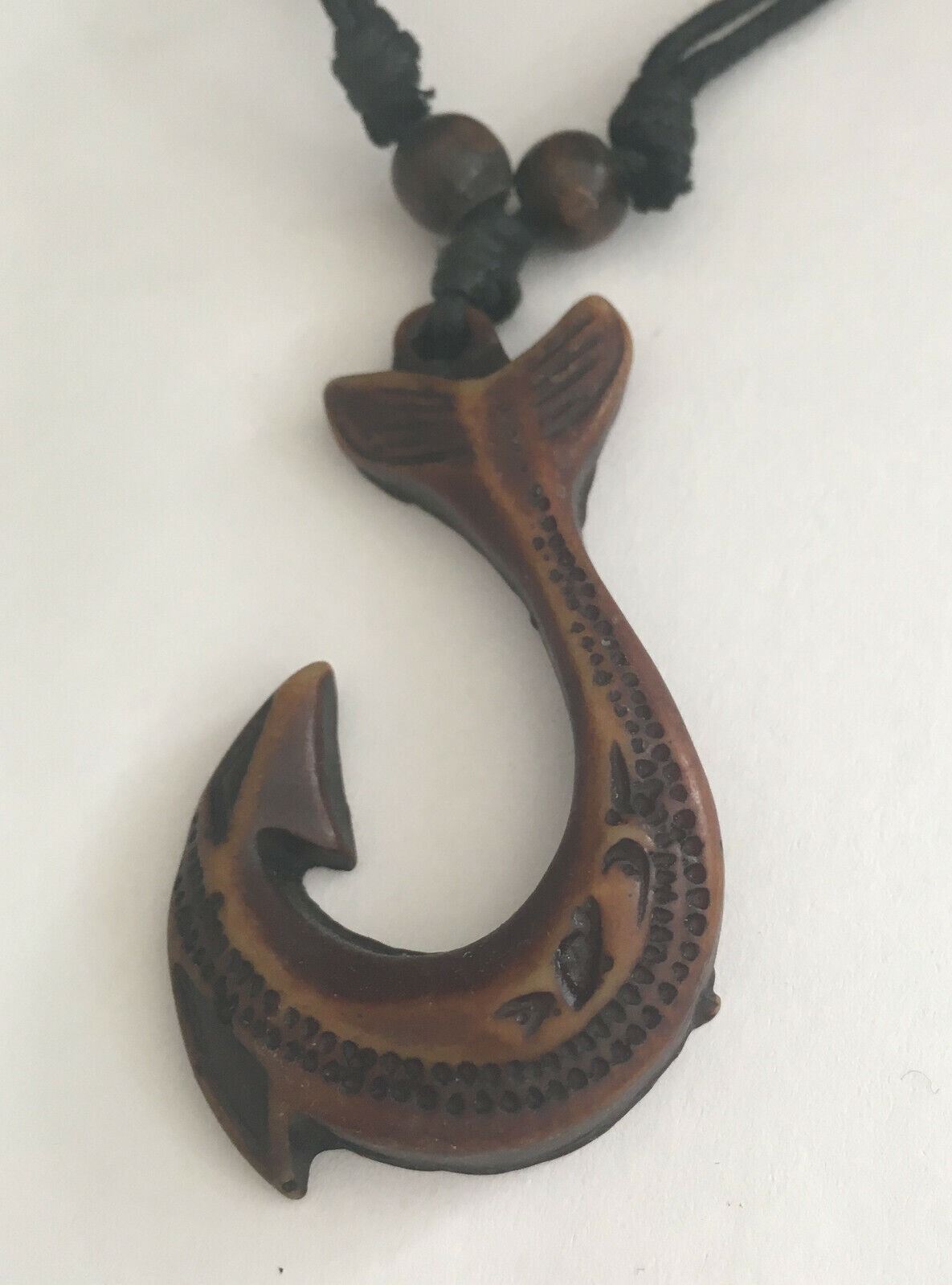 Qty 5 New Resin Faux-Wood & Bone Motif Fish Hook Necklaces w/ Adjustable String Chokers, Misc Designs
