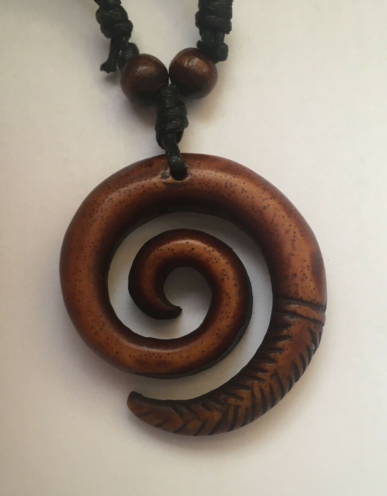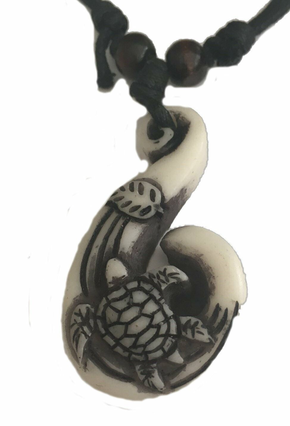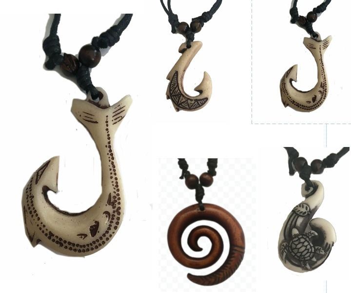 Qty 5 New Resin Faux-Wood & Bone Motif Fish Hook Necklaces w/ Adjustable String Chokers, Misc Designs
