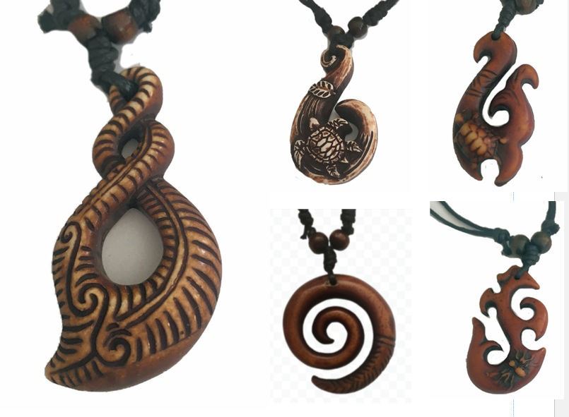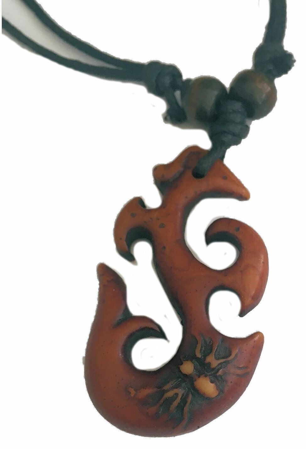 Qty 5 New Resin Faux-Wood Motif Fish Hook Necklaces w/ Adjustable String Chokers, Misc Designs