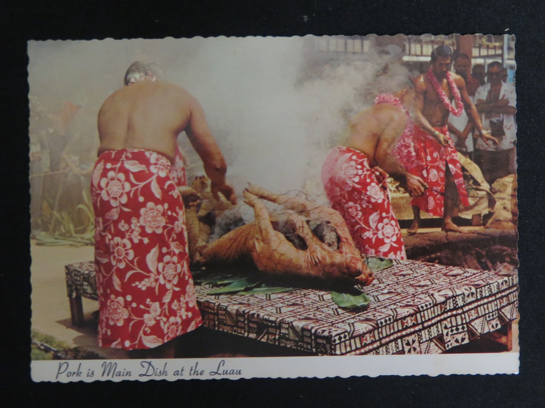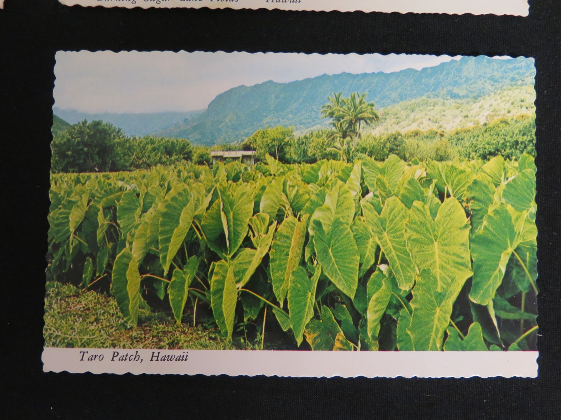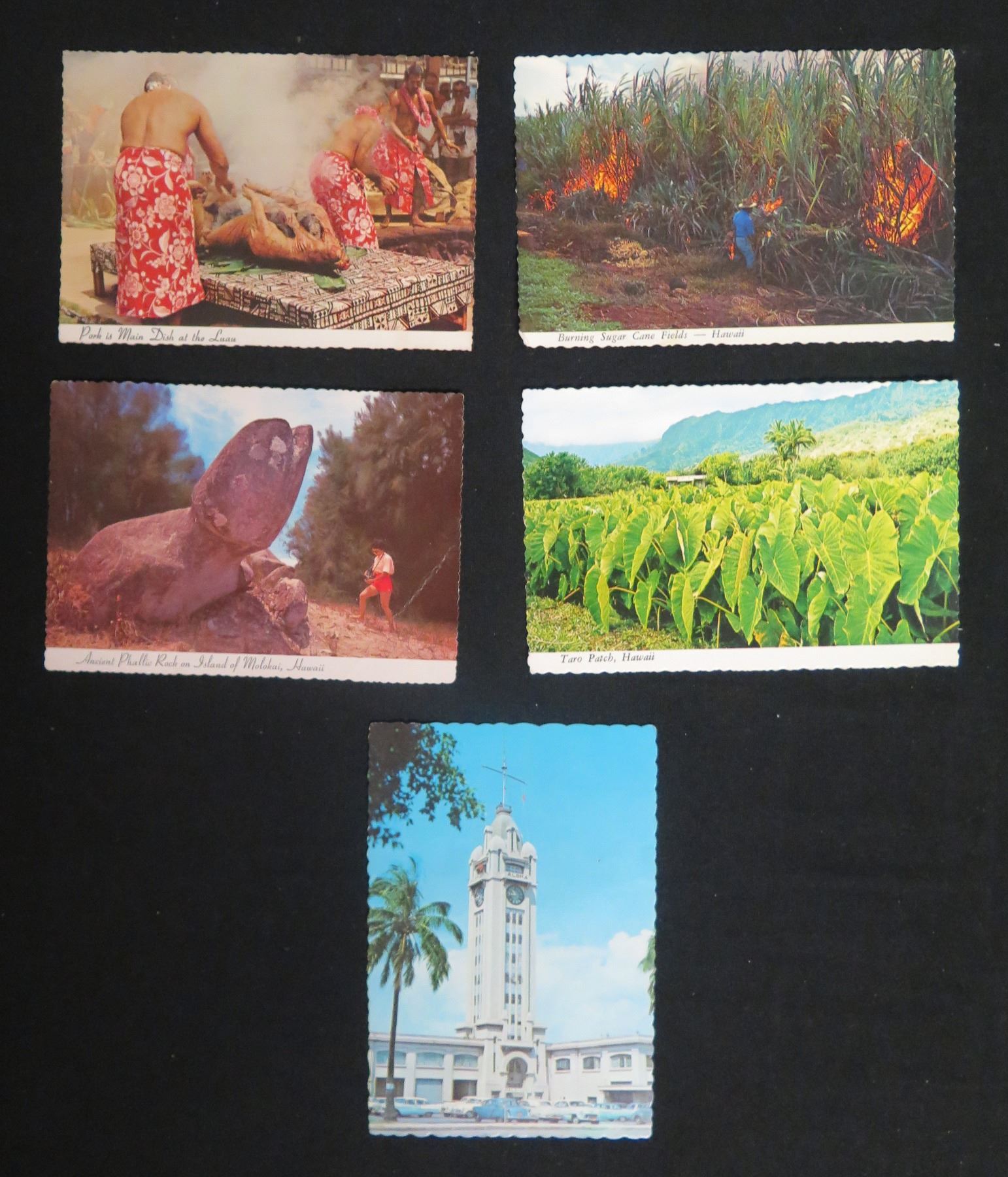 Qty 5 Postcards: Pork at Luau, Molokai Rock, Burning Cane, Taro Patch & Aloha Tower