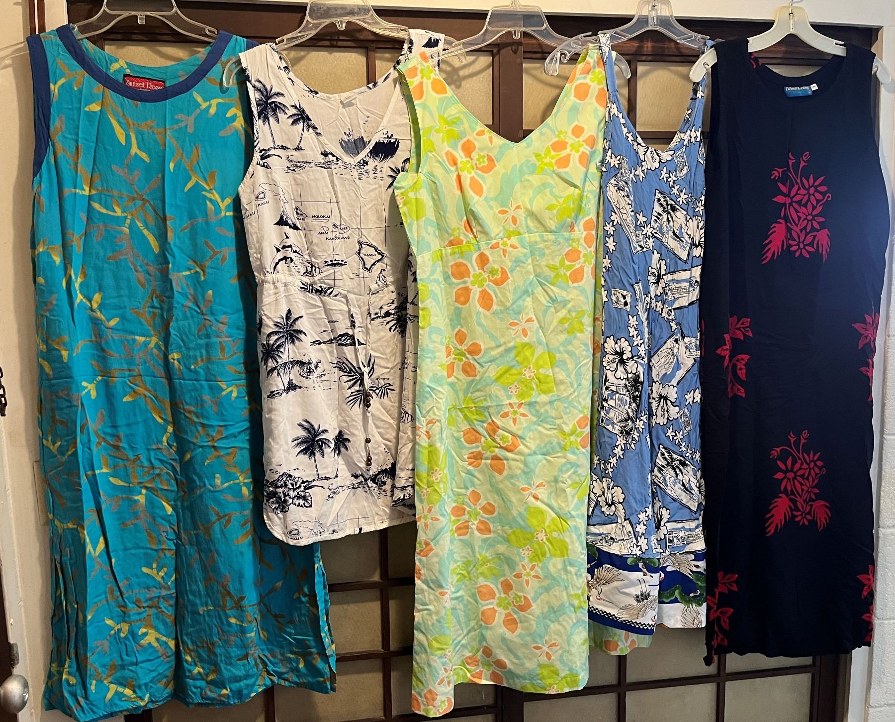 Qty 5 Sleeveless Size Medium Dresses (36-38"bust): Island Feeling, Sunset Rose, Palmwave, etc (pre-owned) Note: These are preowned and may have flaws. Some size tags have been removed. Items are measured flat & doubled.