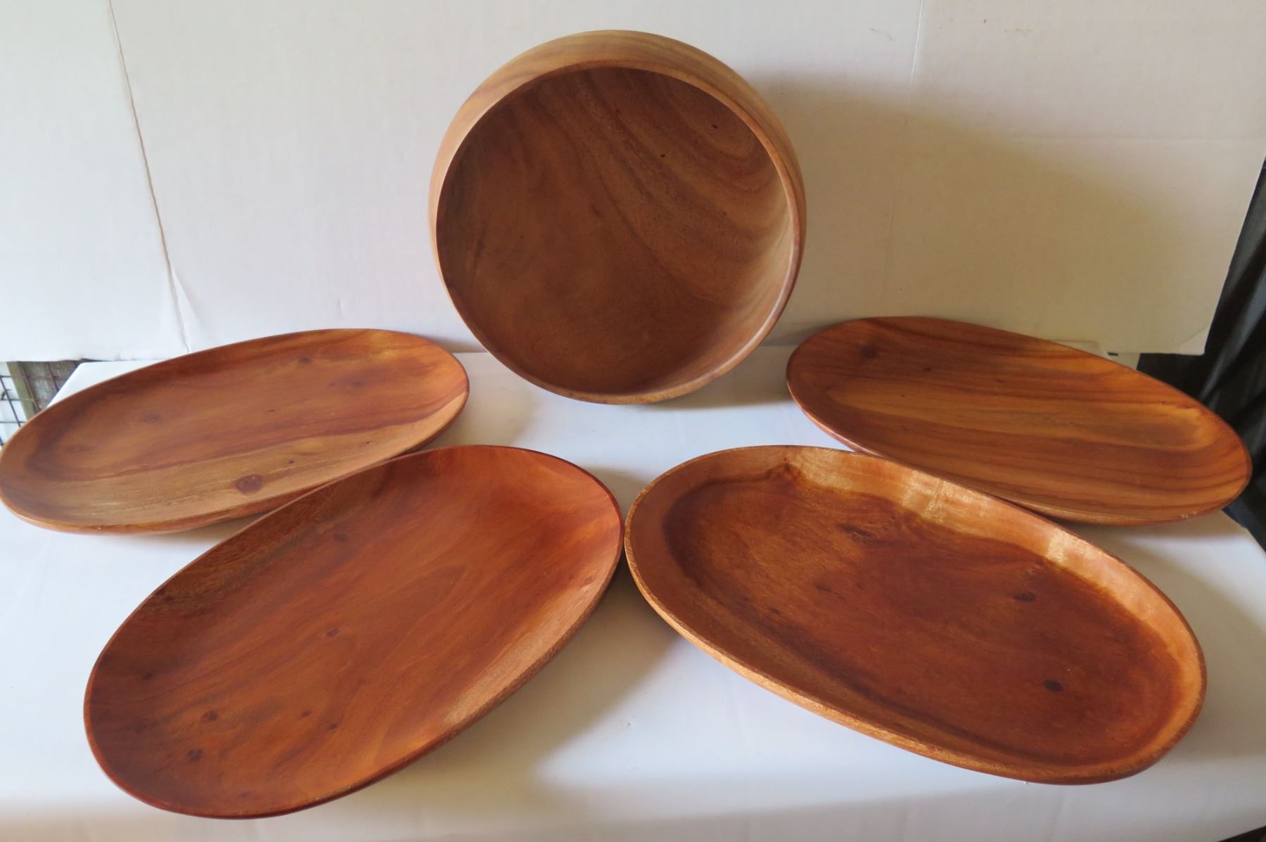 Qty 5 Wooden Serving Platters & Bowl Yellow Poinciana House of Kalai 10" Dia, Kamani 14" W