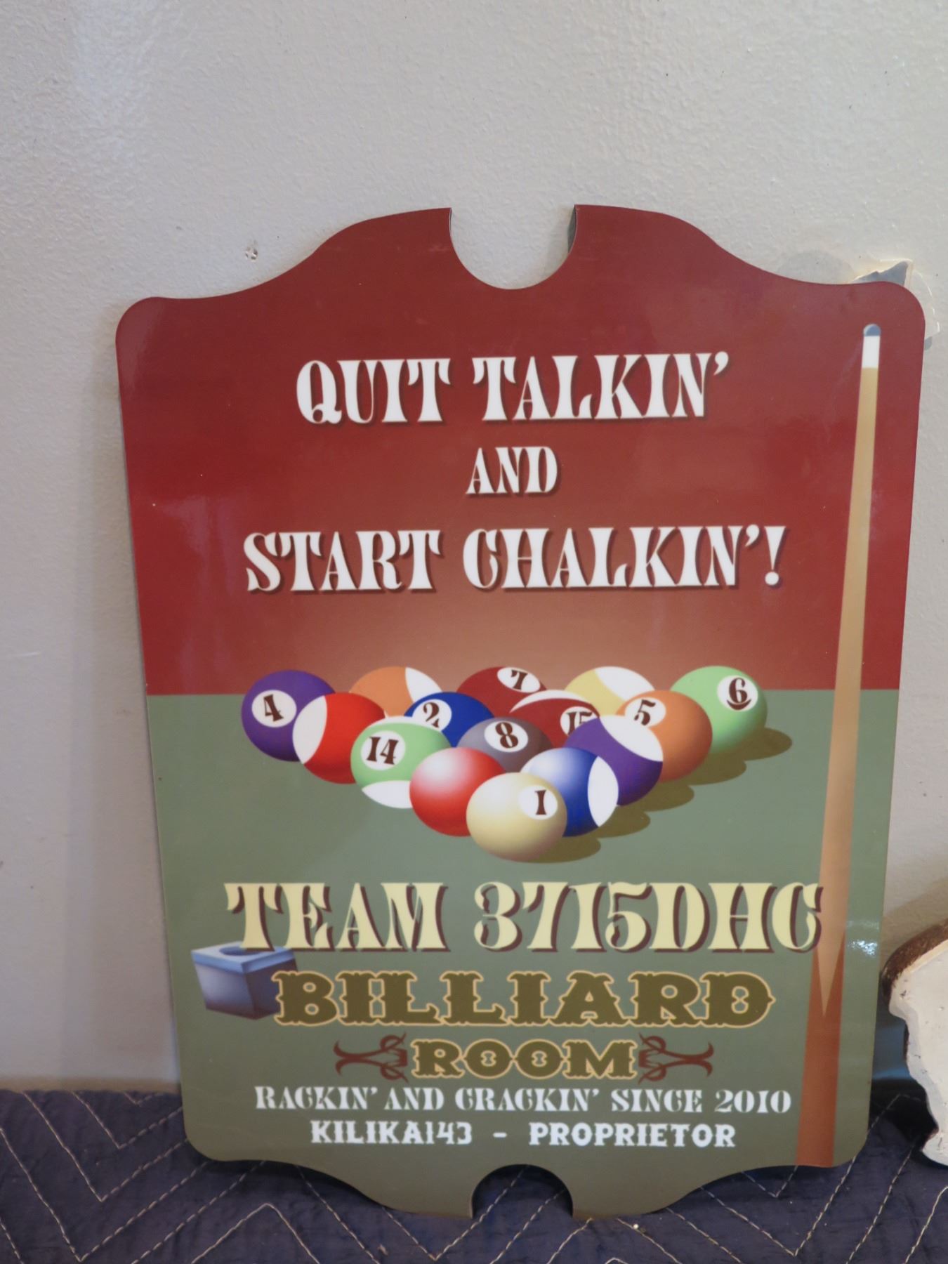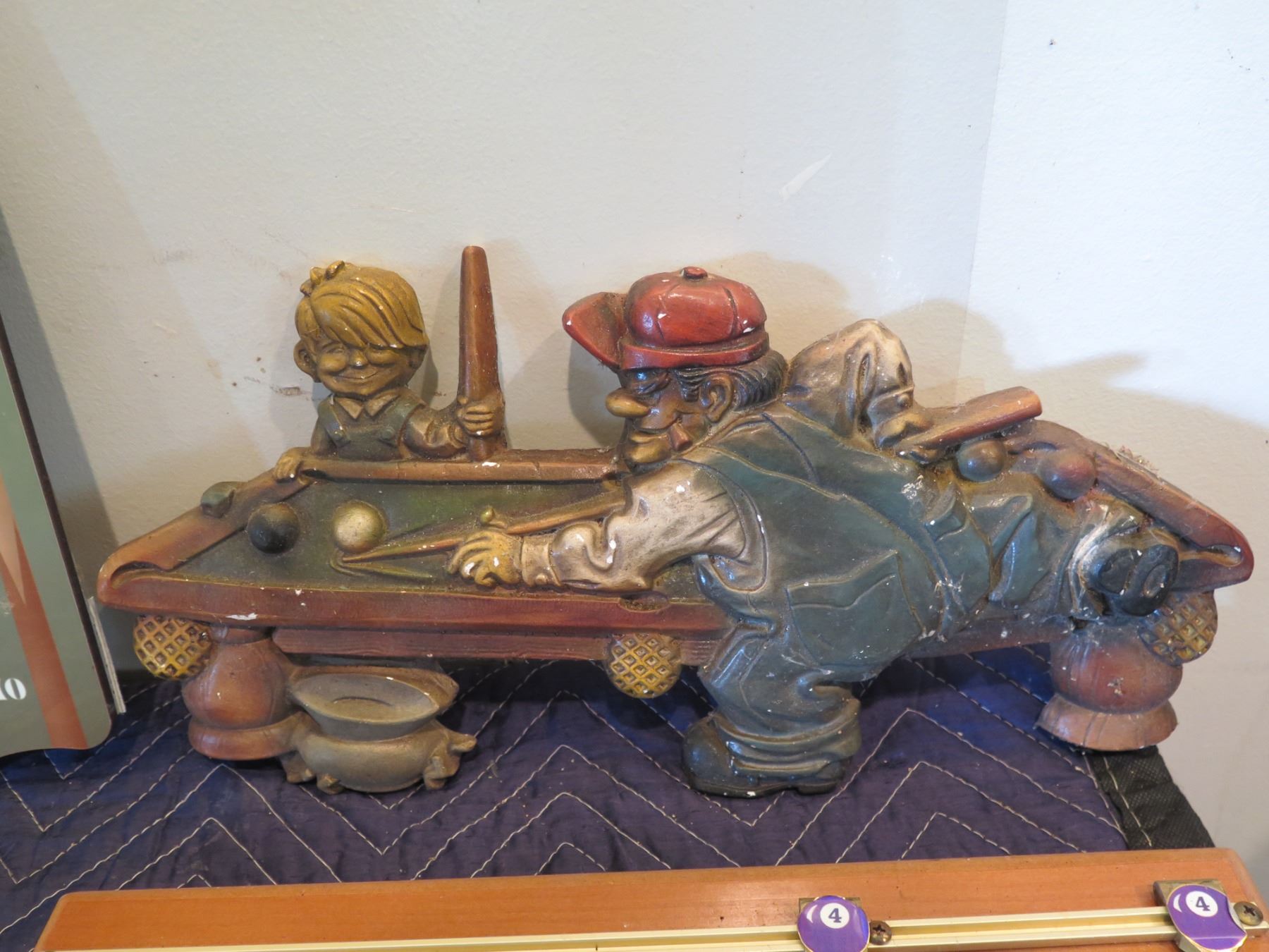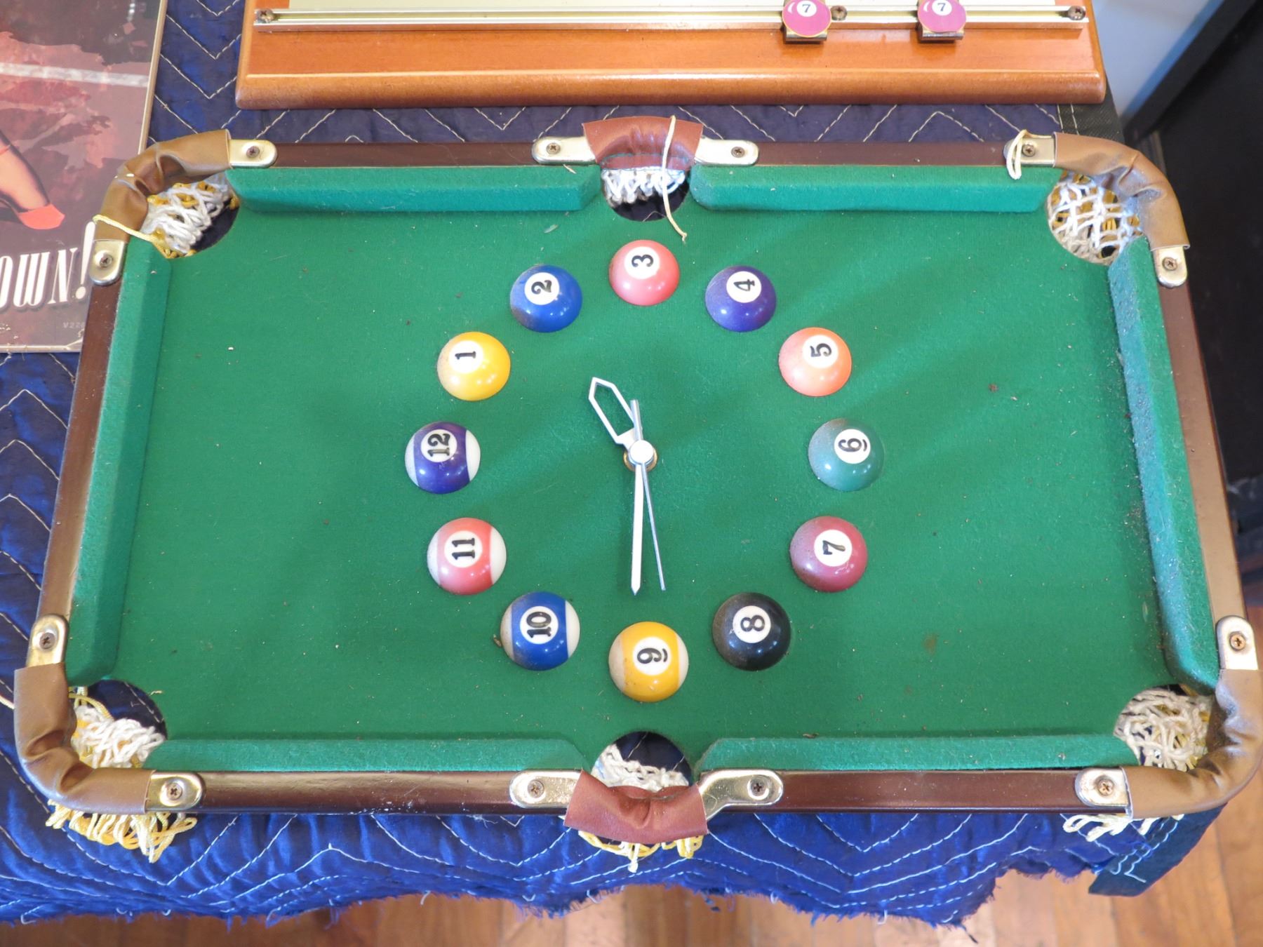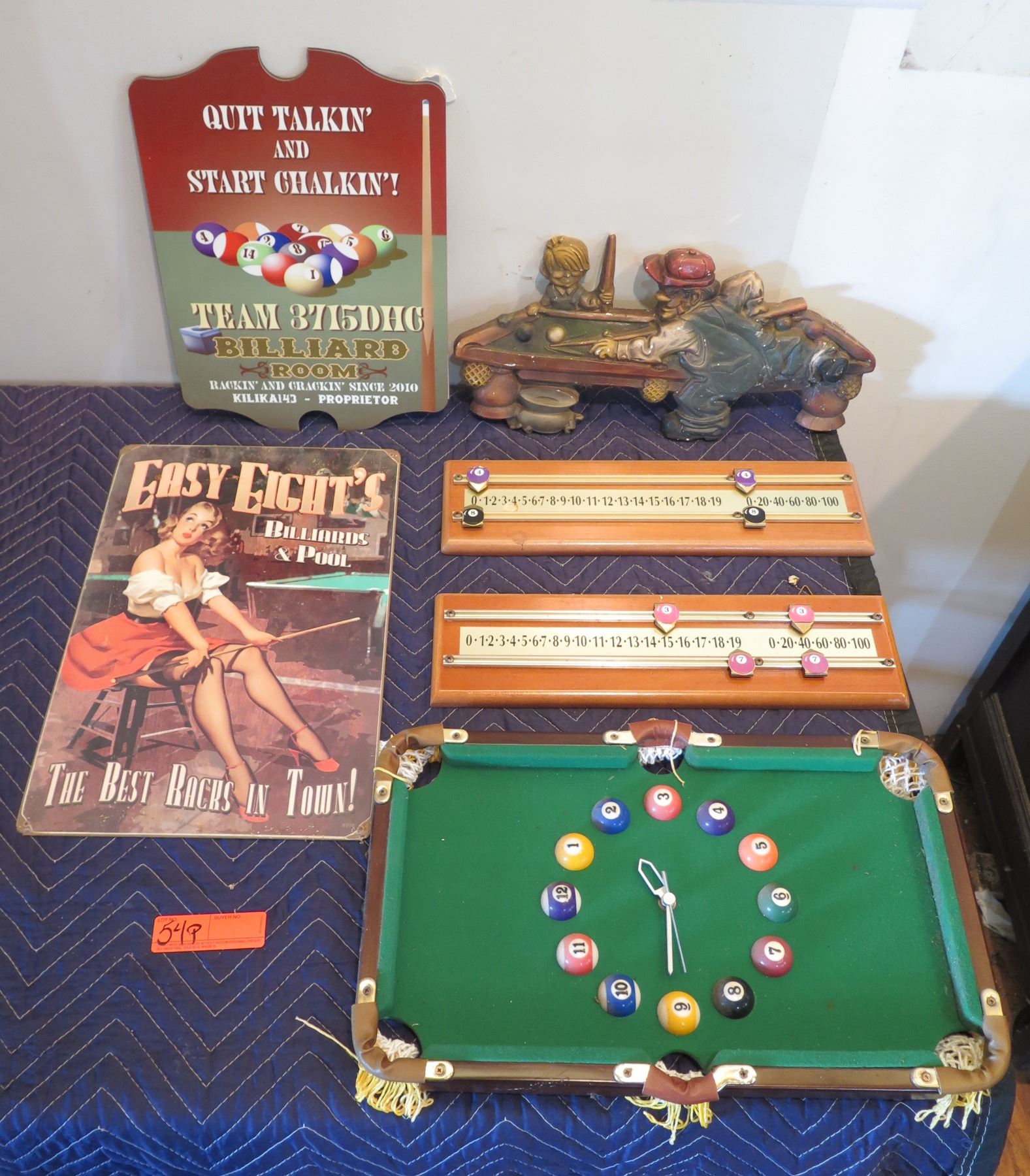 Qty 6 Billiard Pool Themed Décor: Clock, Scoreboards, Wall Hanging, Sign, etc