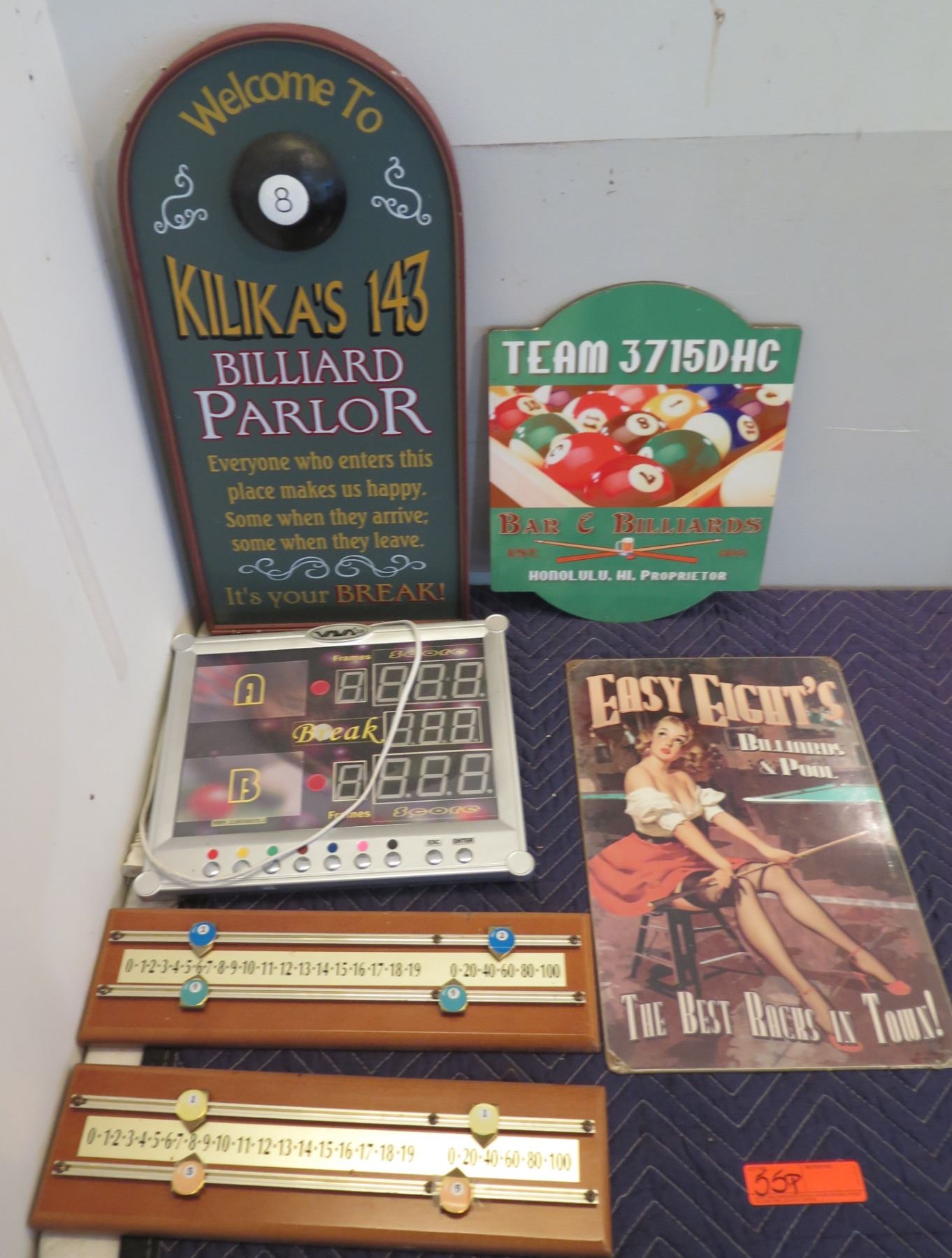 Qty 6 Billiard Pool Themed Décor: Magazine, Scoreboards, Wall Hanging, Signs, etc