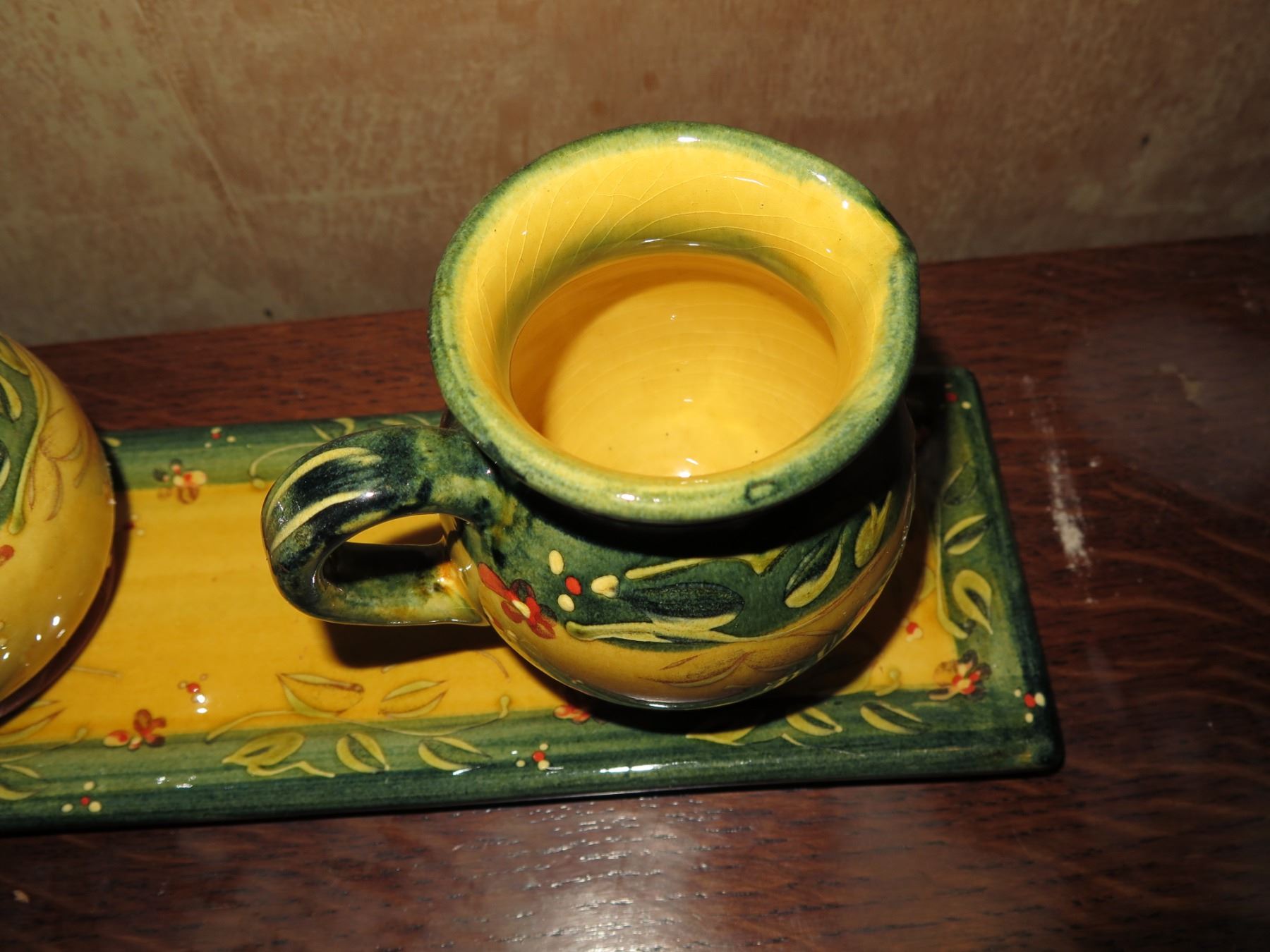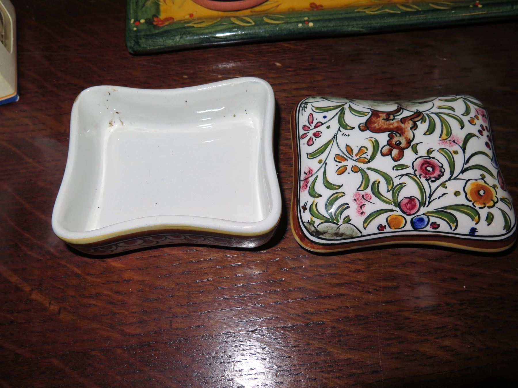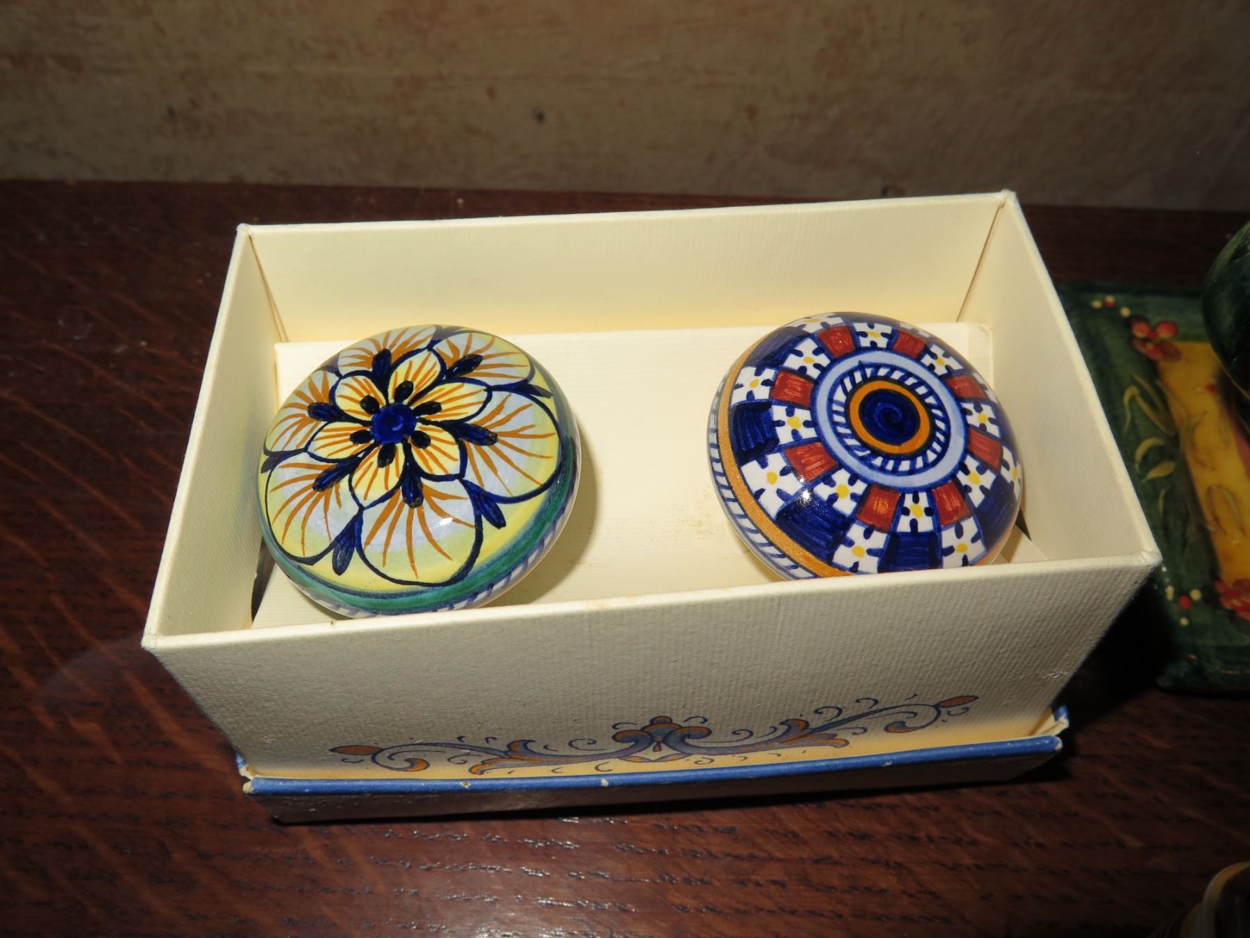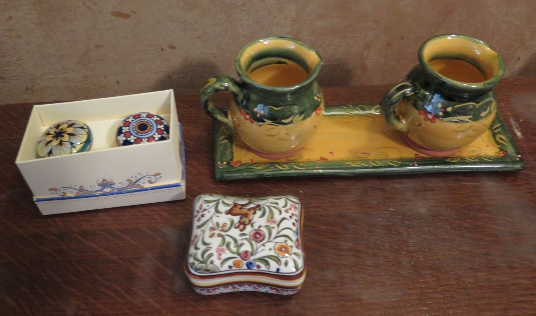 Qty 6 Ceramic Accessories, 2 Ceramic Knobs in Box, Trinket Box, 2 Pitchers on Tray French