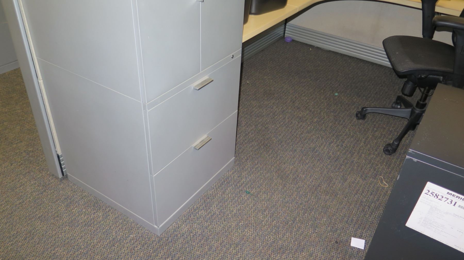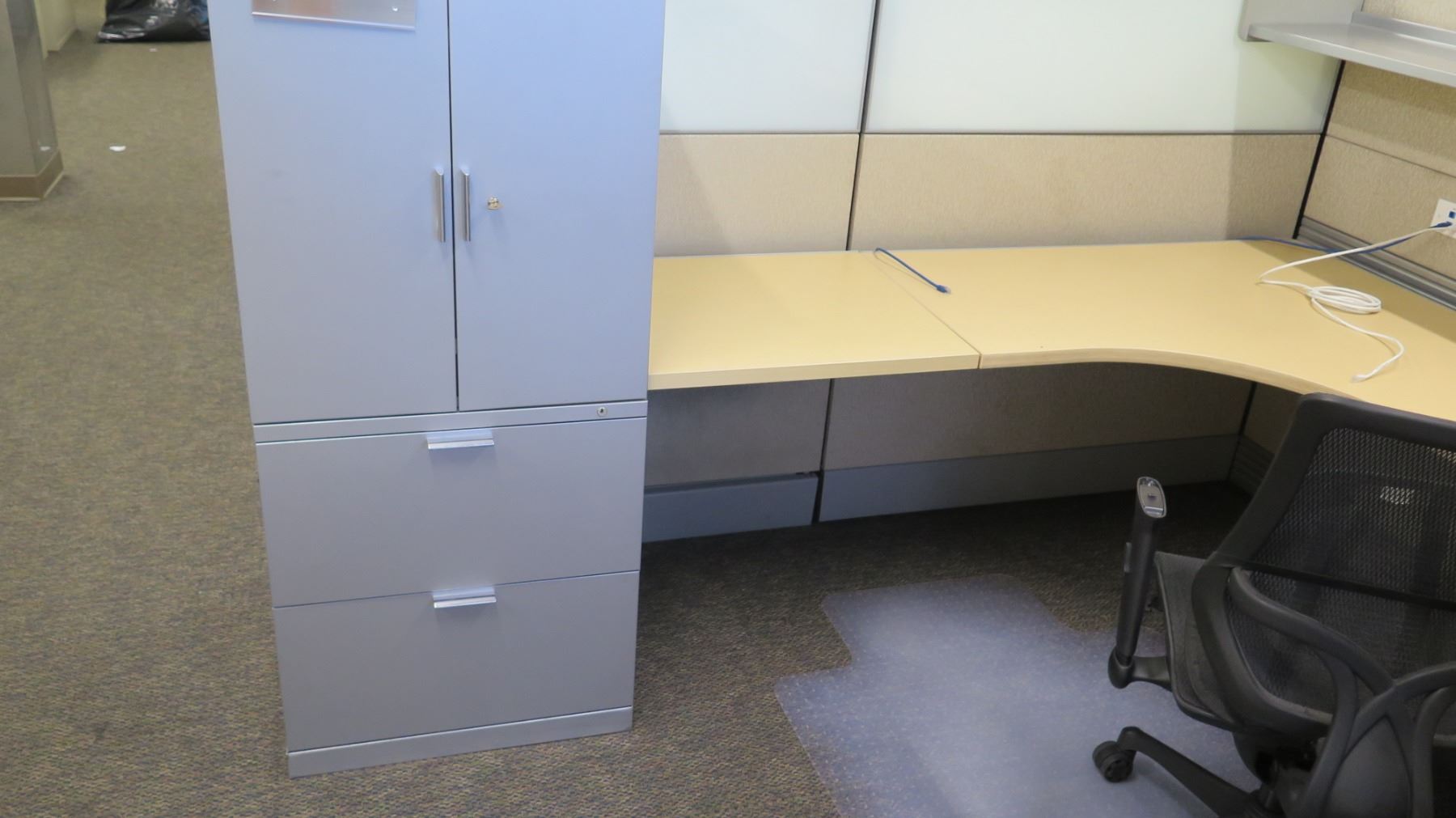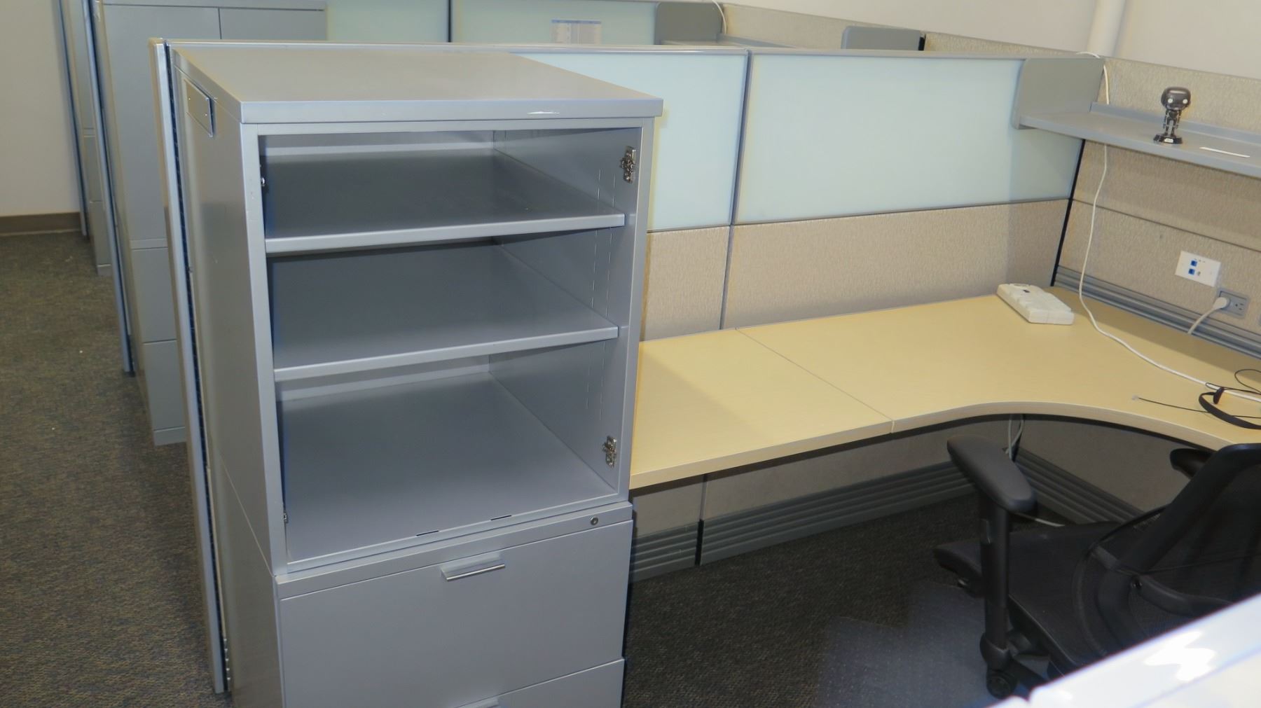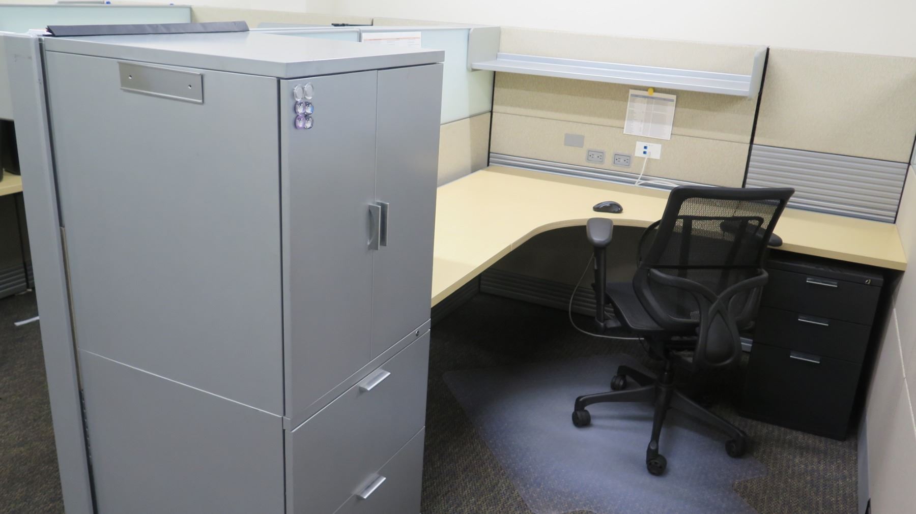 Qty 6 Desks w/ Rolling Chairs, Filing Cabinets & Cubicle Walls (Buyer Needs to Disassemble). Metal cabinets are 24"W x 24"D x 54"H