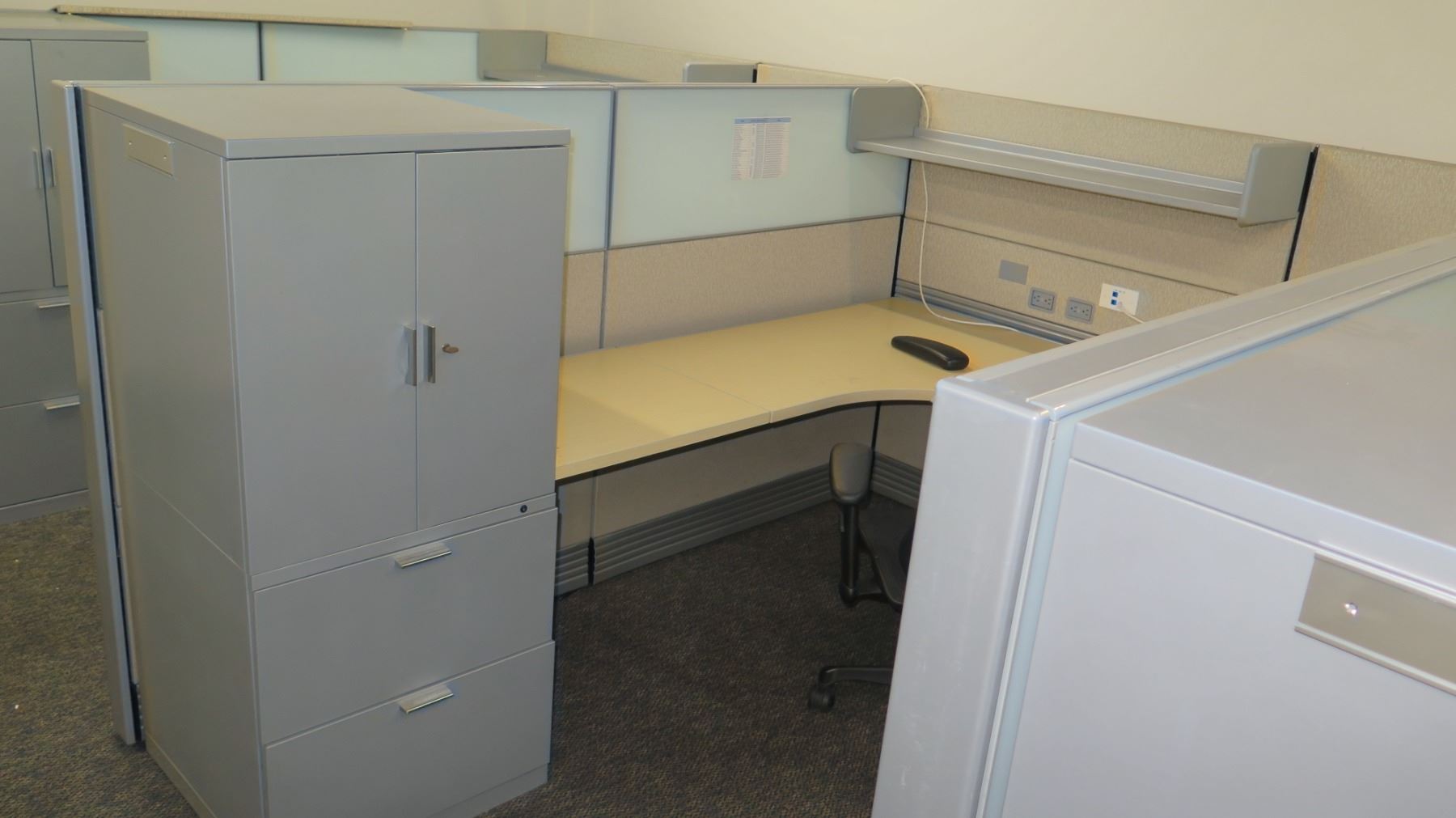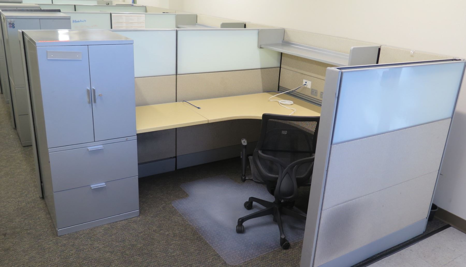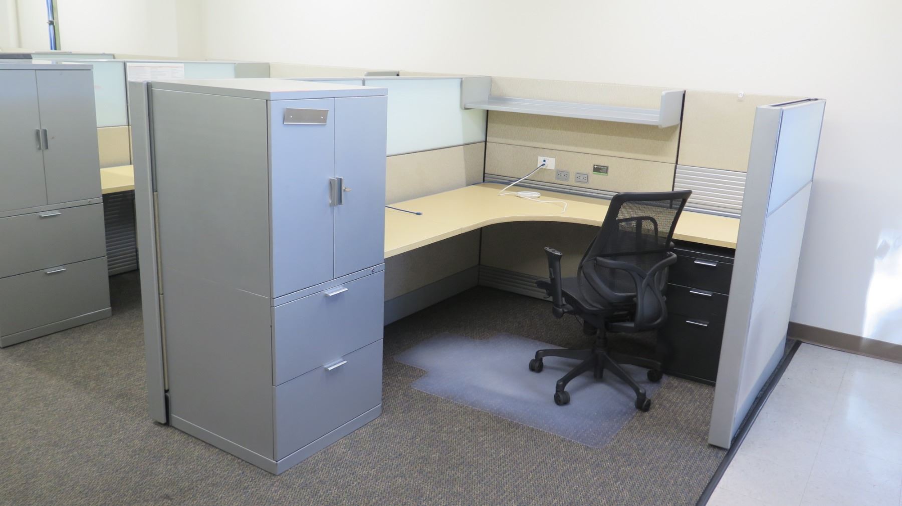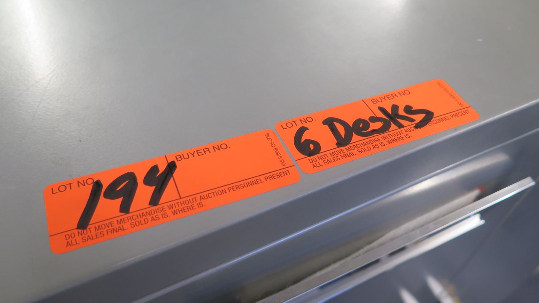 Qty 6 Desks w/ Rolling Chairs, Filing Cabinets & Cubicle Walls (Buyer Needs to Disassemble). Metal cabinets are 24"W x 24"D x 54"H