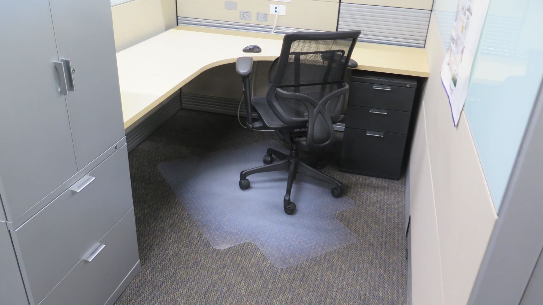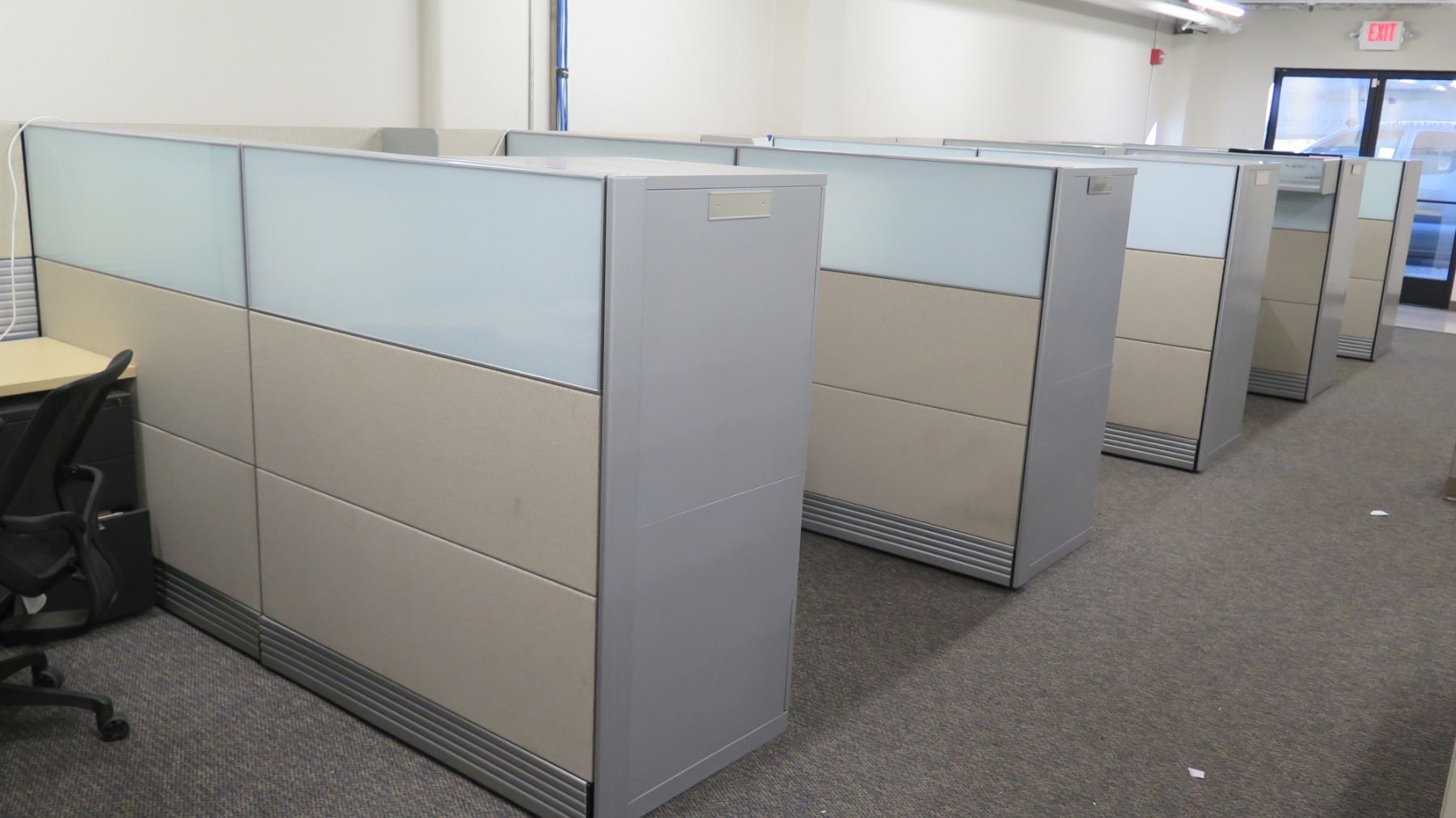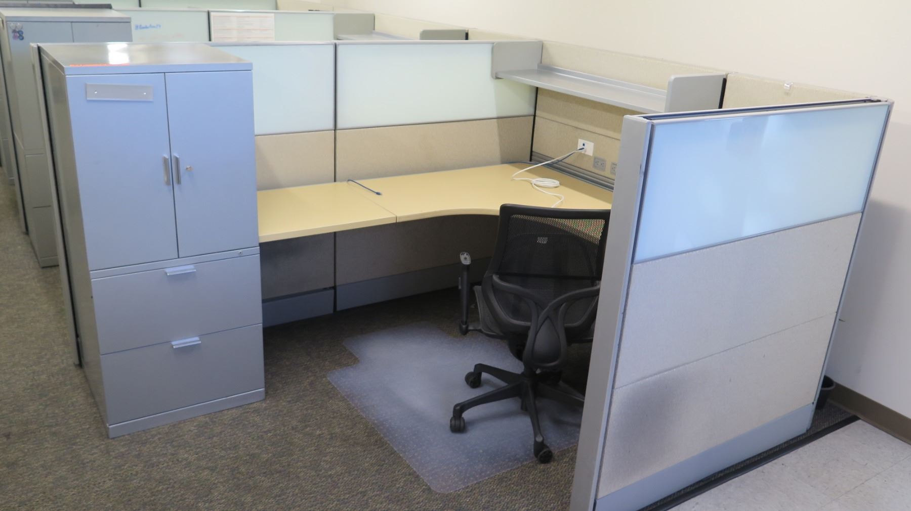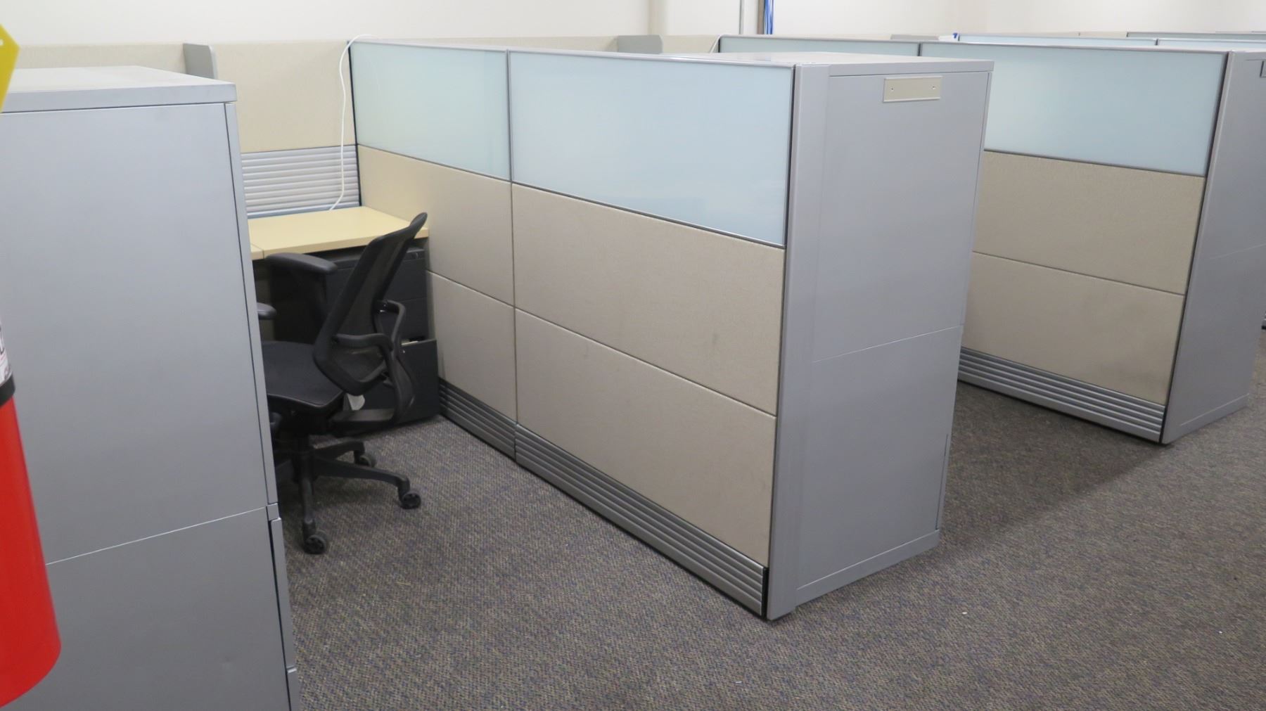 Qty 6 Desks w/ Rolling Chairs, Filing Cabinets & Cubicle Walls (Buyer Needs to Disassemble). Metal cabinets are 24"W x 24"D x 54"H