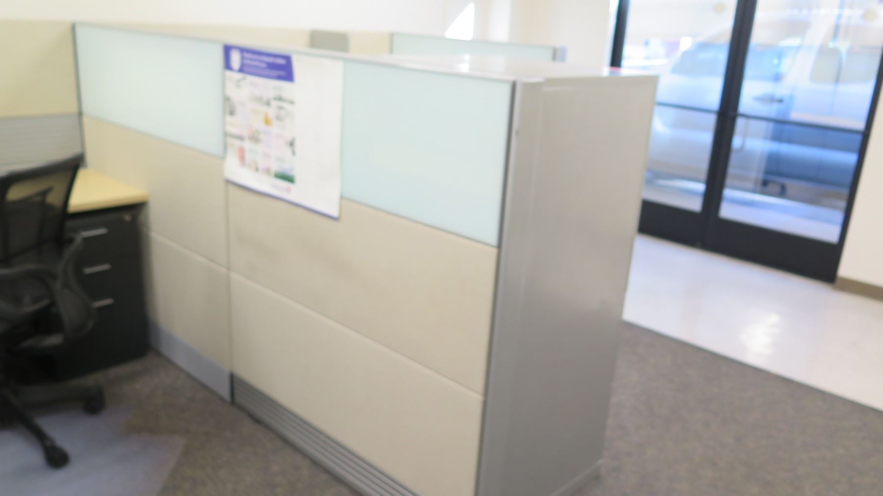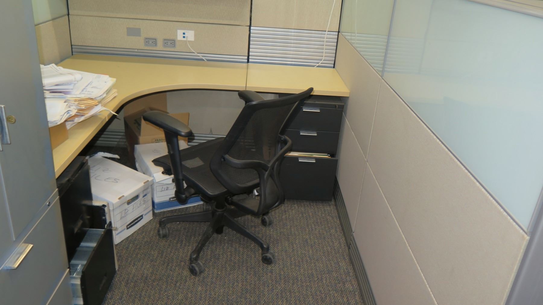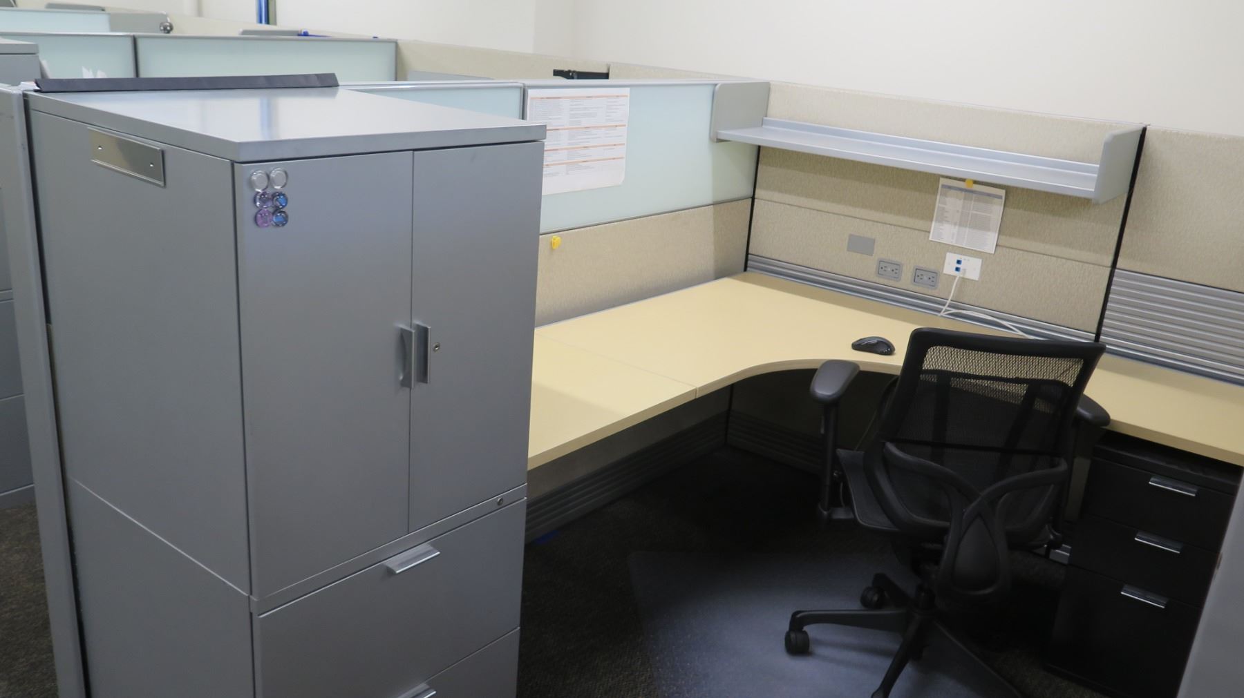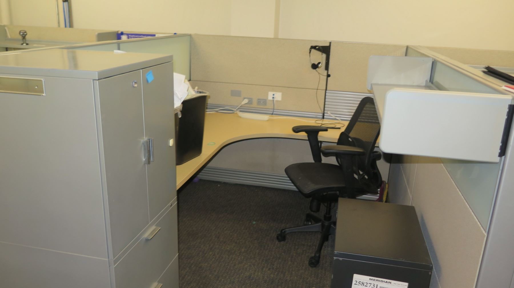 Qty 6 Desks w/ Rolling Chairs, Filing Cabinets & Cubicle Walls (Buyer Needs to Disassemble)