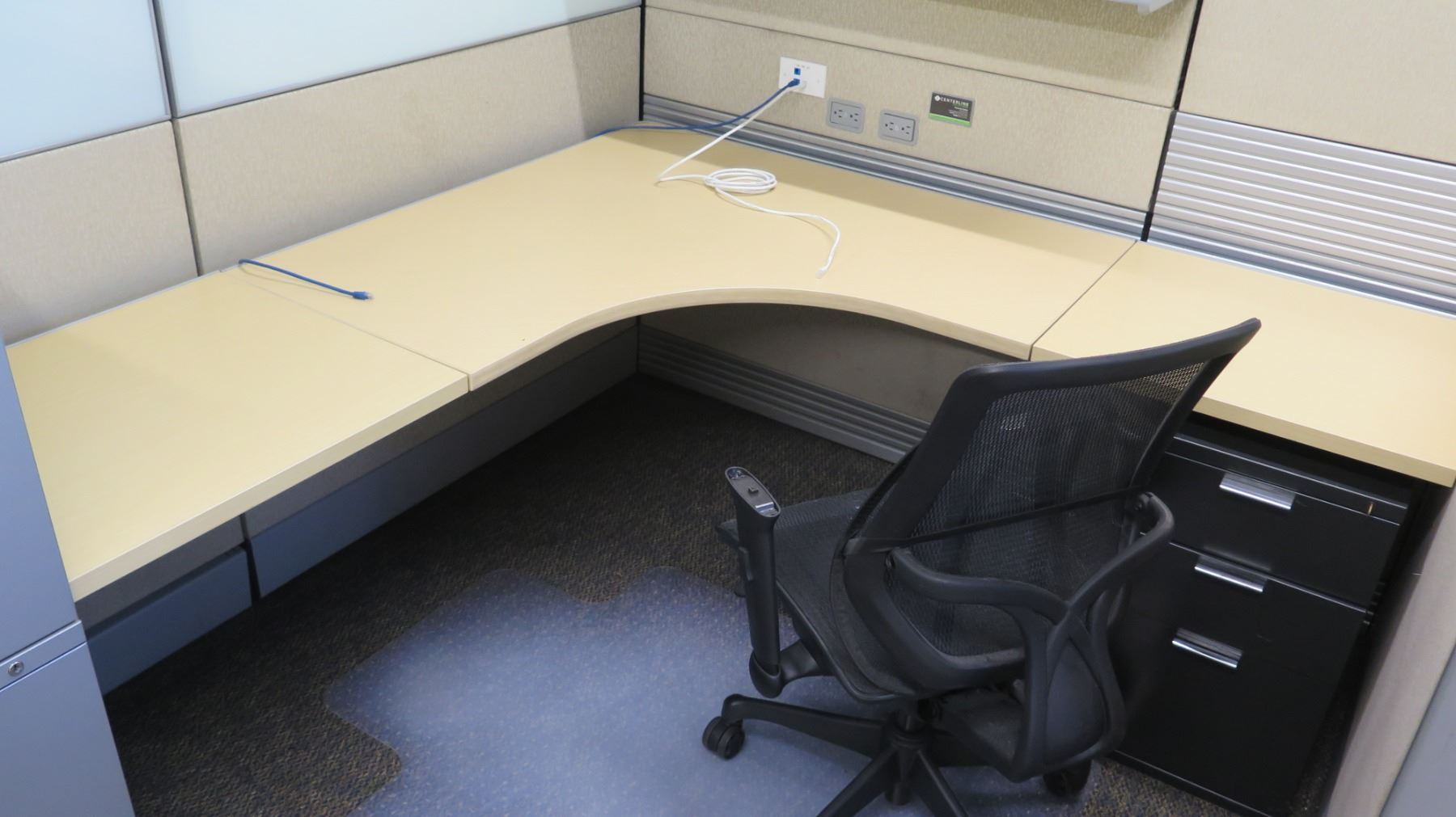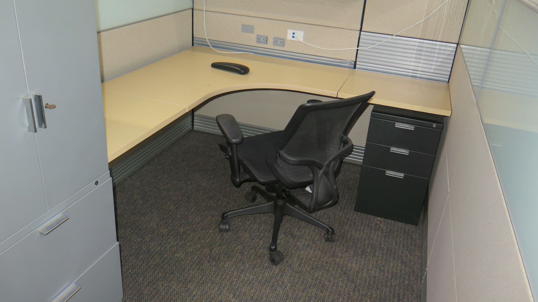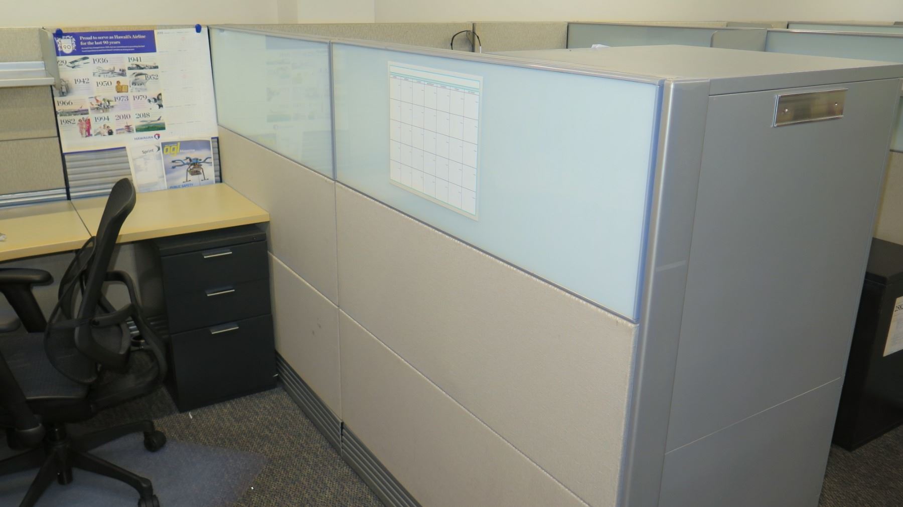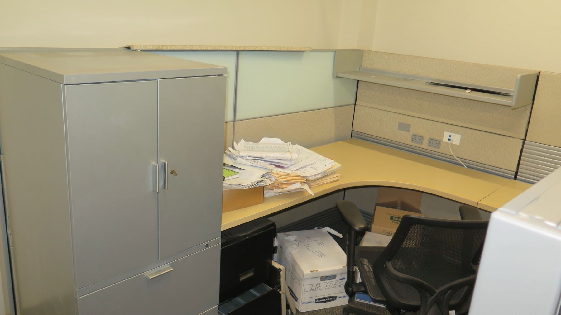 Qty 6 Desks w/ Rolling Chairs, Filing Cabinets & Cubicle Walls (Buyer Needs to Disassemble)
